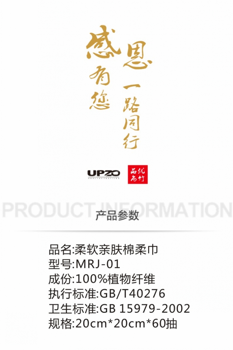 型号:MRJ-01(加厚加大) 成份:植物纤维 规格:20cm×20cm×60抽 厚度标准: 70克/平方(加厚款) 卫生标准: GB15979-2002 袋规: 10×22×6.5cm