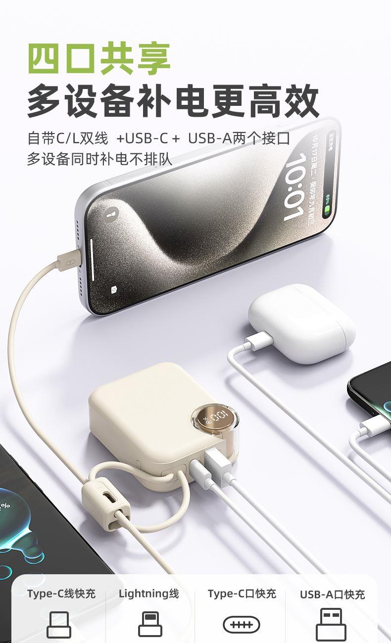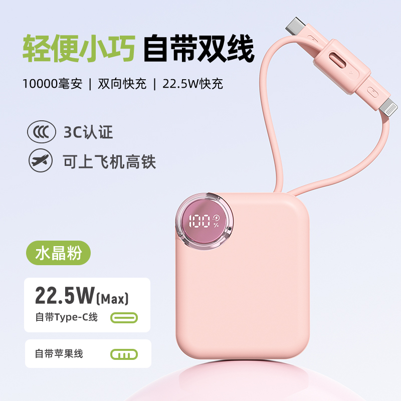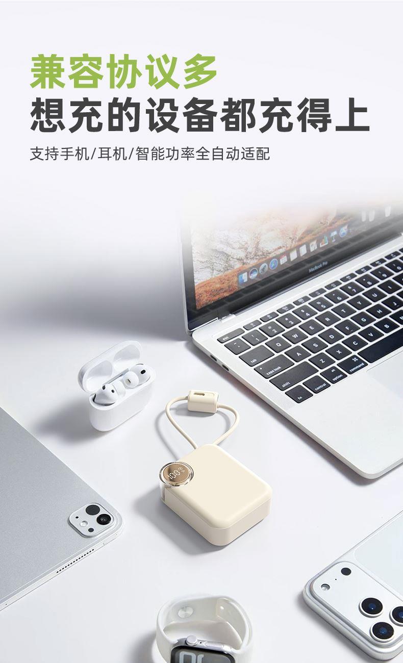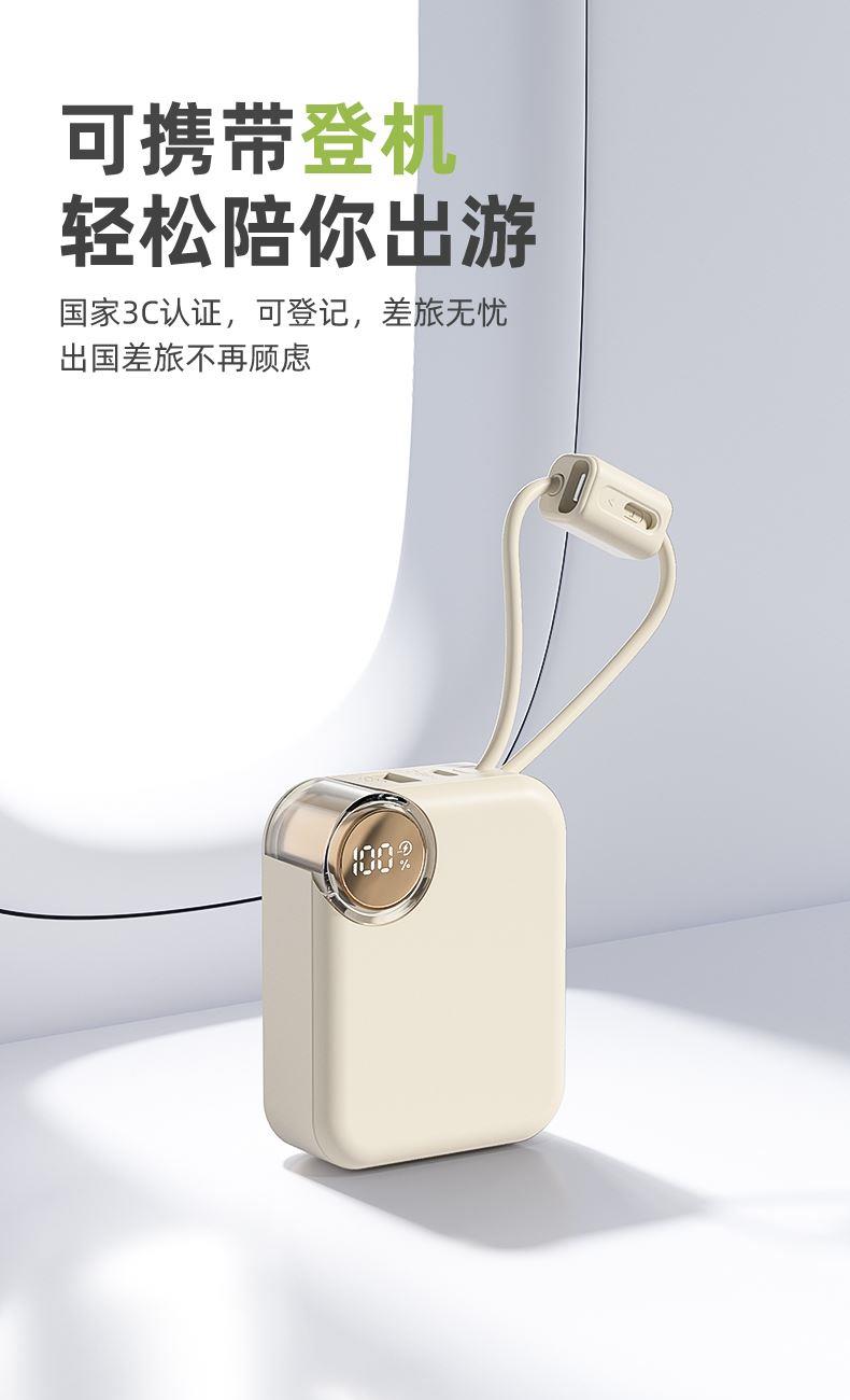 【推荐理由】: 10000毫安,体积超小 数字电量显示 22.5W超级快充,兼容PD20W 内置苹果/Type-C接口满足各种手机充电 符合民航局标准,可随身携带 颜色:米色(主推) 粉色 绿色 黑色 材质:ABS 容量:10000毫安 尺寸:60*74*27mm 包装:彩盒包装