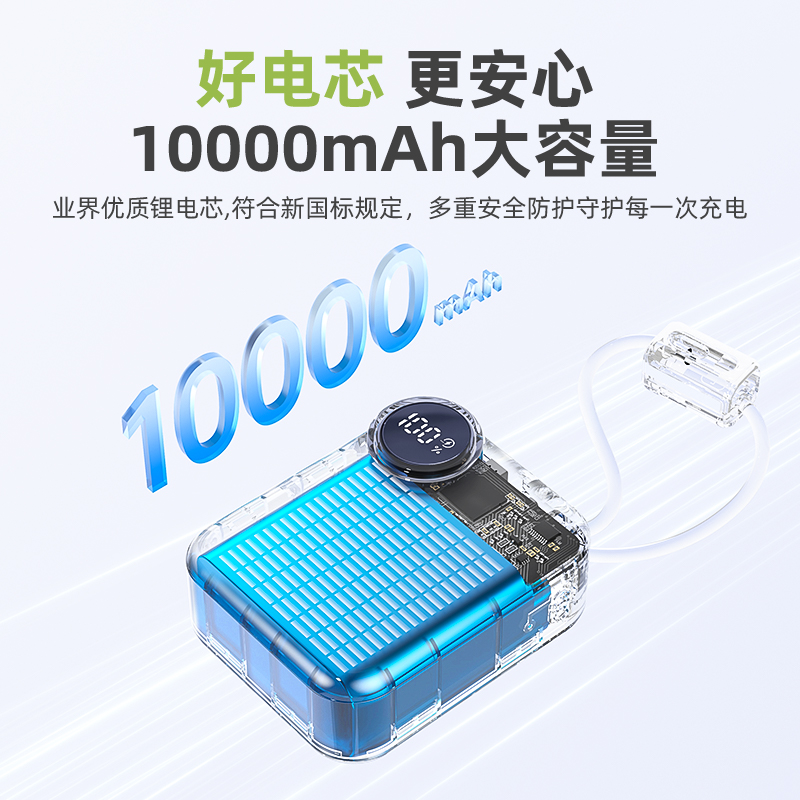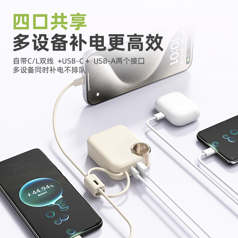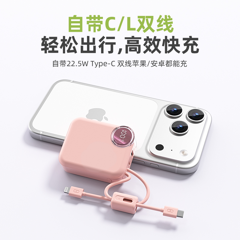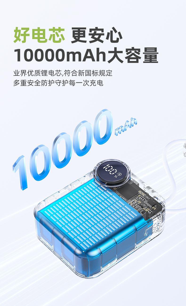 【推荐理由】: 10000毫安,体积超小 数字电量显示 22.5W超级快充,兼容PD20W 内置苹果/Type-C接口满足各种手机充电 符合民航局标准,可随身携带 颜色:米色(主推) 粉色 绿色 黑色 材质:ABS 容量:10000毫安 尺寸:60*74*27mm 包装:彩盒包装