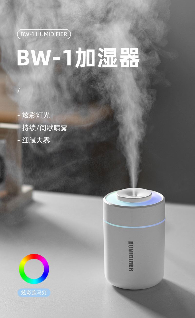 小白桌面喷雾加湿器 产品型号:BW1 产品颜色:白色,黑色 水箱容量:180mL 产品材质:ABS+PP+电子元器件 产品尺寸:70*70*105mm 产品包装:70*70*110mm 一箱数量:120pcs/箱 外箱尺寸:43×35.5×45.5cm 产品净重/毛重:80g/112g 整箱净重/毛重:13.44KG/14.44KG 【功能特点】: 低噪风机润物细无声 持续/间歇 双模式 七彩跑马灯炫彩造型 180mL容量加湿,细腻雾大
