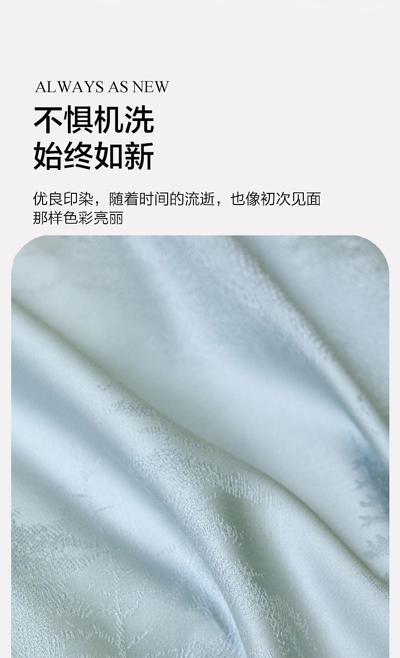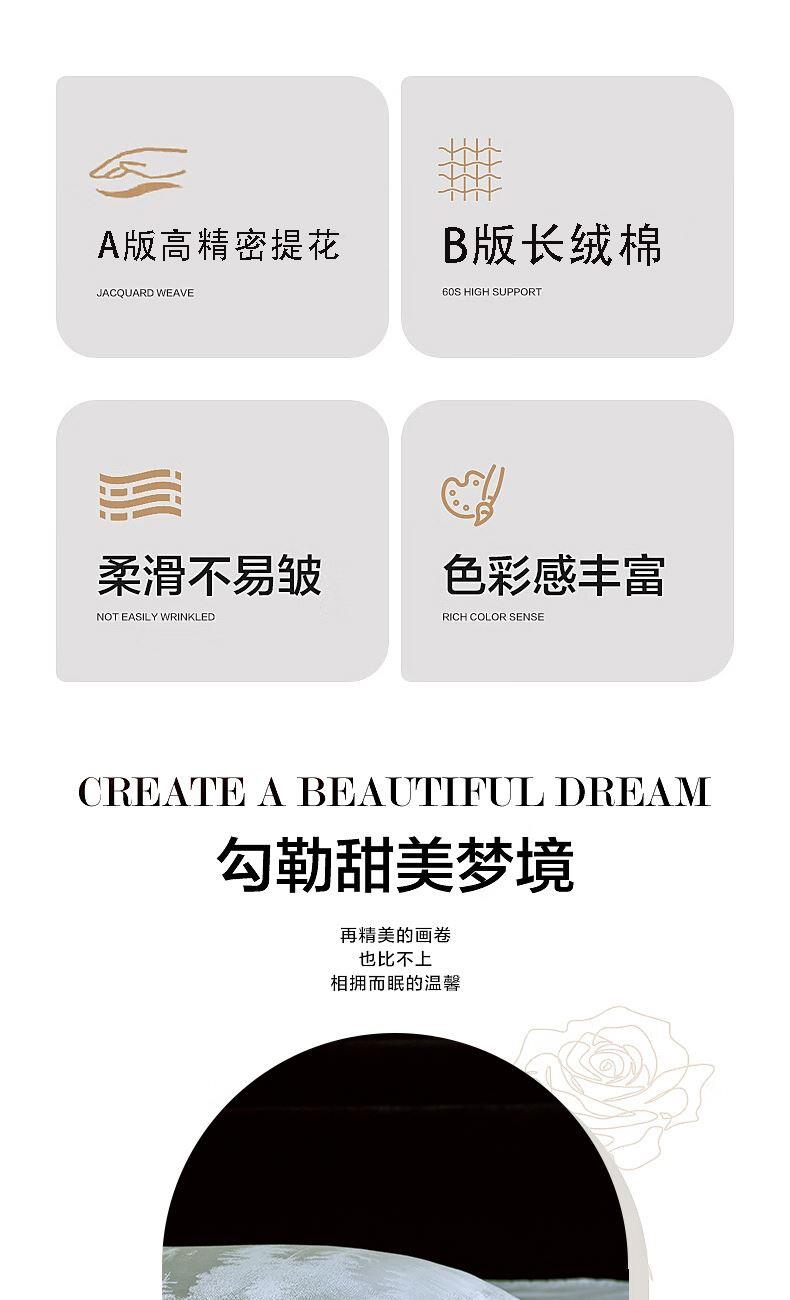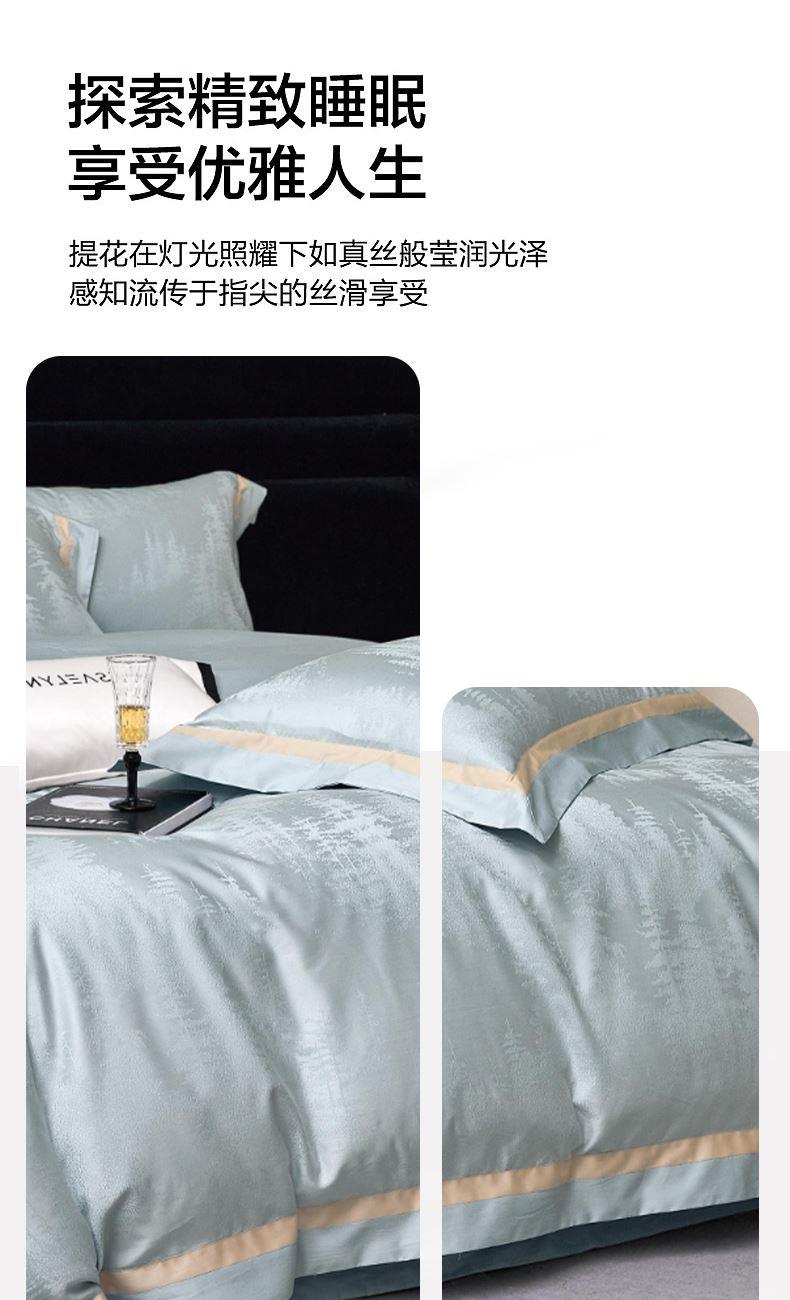 被套:200*230cm 床单:245*250cm 枕套:48*74cm*2 面料:A高精密提花+B版长绒棉 执行标准:GB/T22796-2021 安全类别:GB18401-2010 B类 1.A版高精密提花B版长绒棉是自然界的绿色纤维,是从校树中提取木浆为原料,赋予了织物以柔滑的触感和美妙的光泽,丝滑柔滑的全新享受。 2.从木材中萃取出来织成的纺品轻薄透气,柔滑垂顺,被誉为“会呼吸的面料