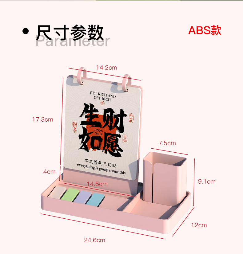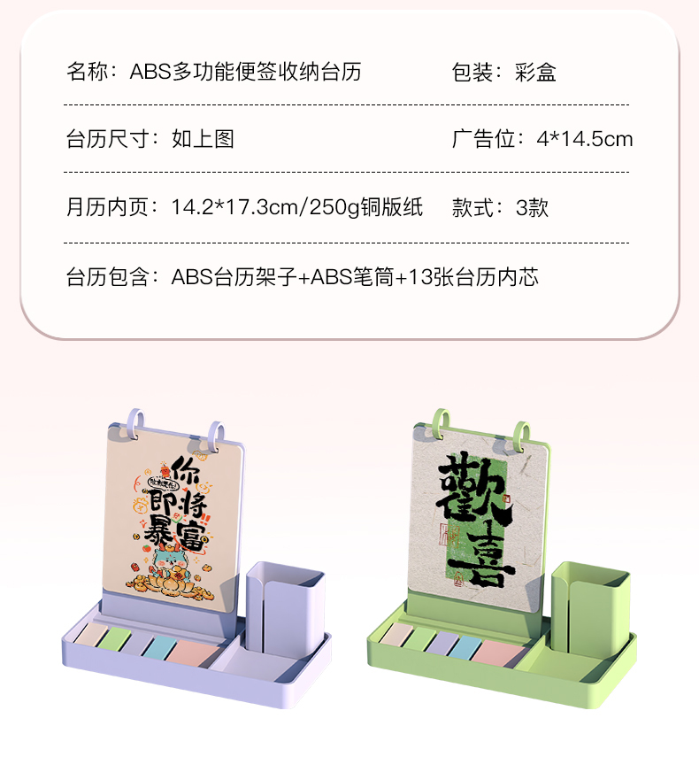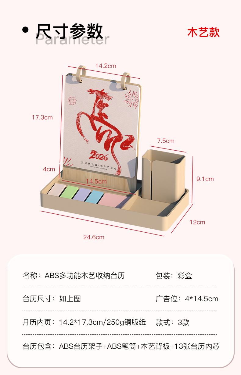 台历尺寸:24.6*12*23.8cm 内芯尺寸:14.2*17.3cm 广告位:14.5*4cm 月历张数:13张 纸张克重:250克铜版纸 颜色款式:3款(支持定制) 包含:13张内芯+ABS收纳台历架子+ ABS笔筒