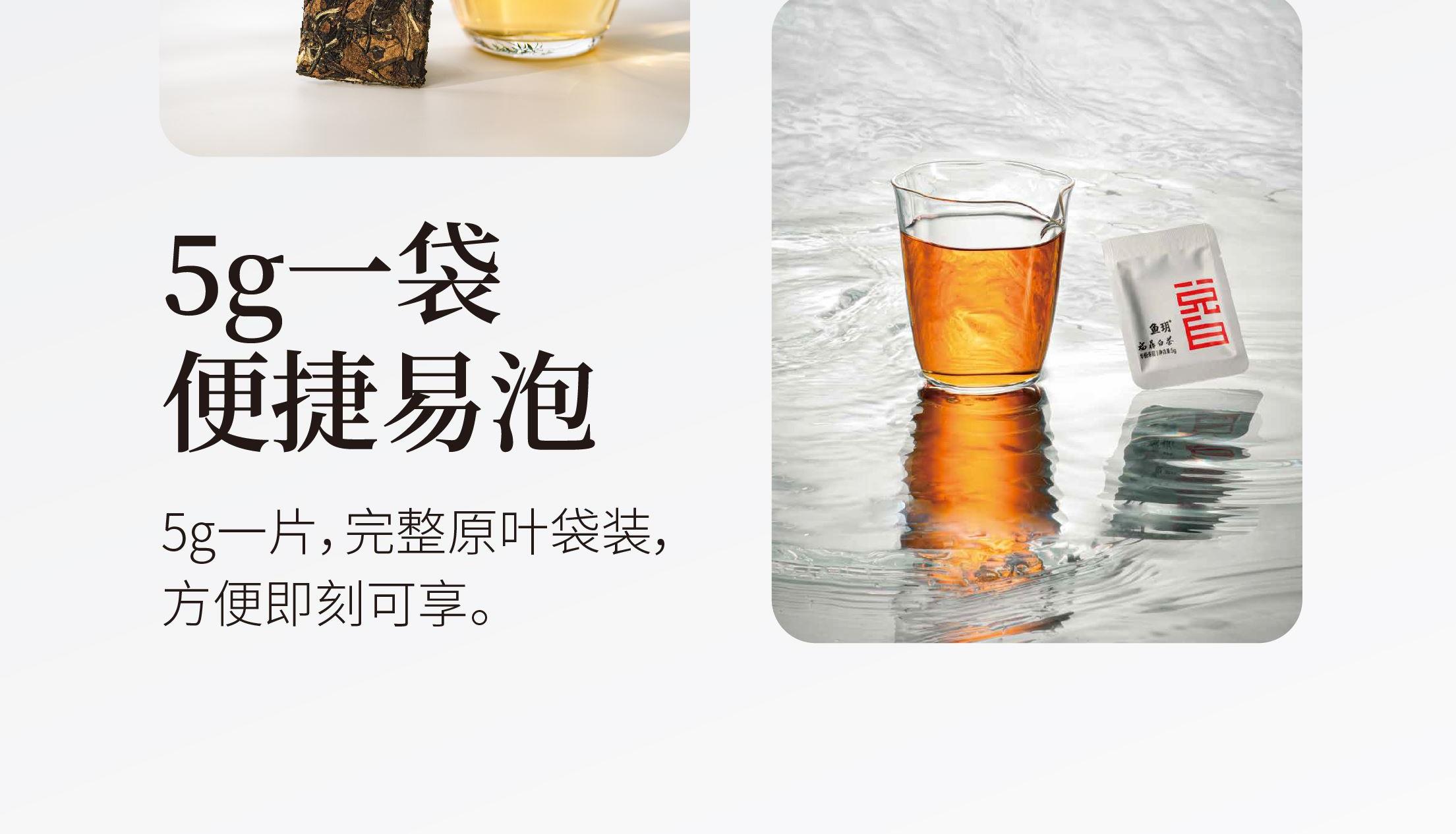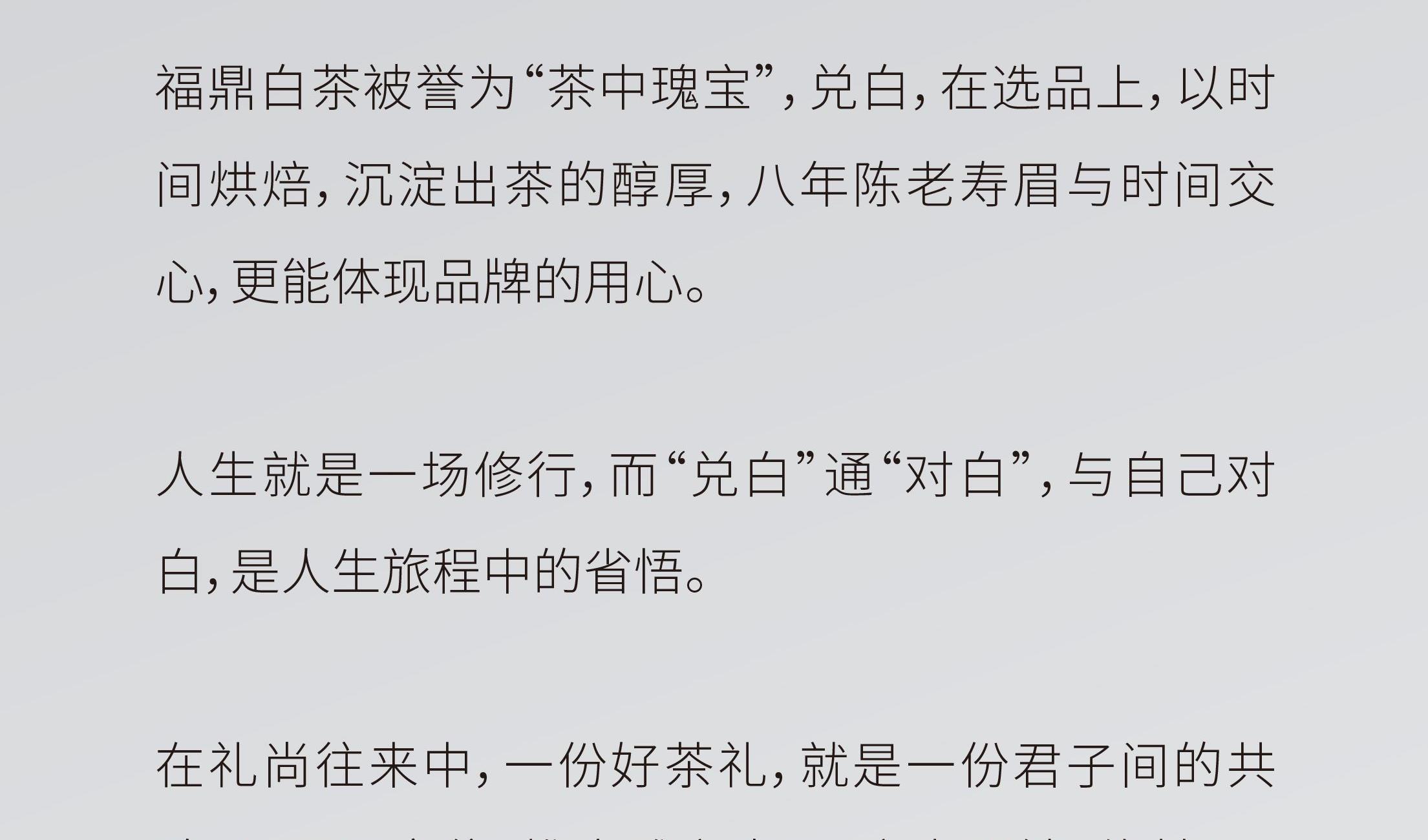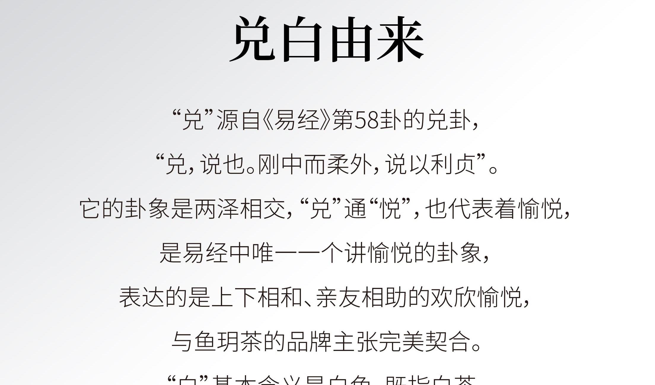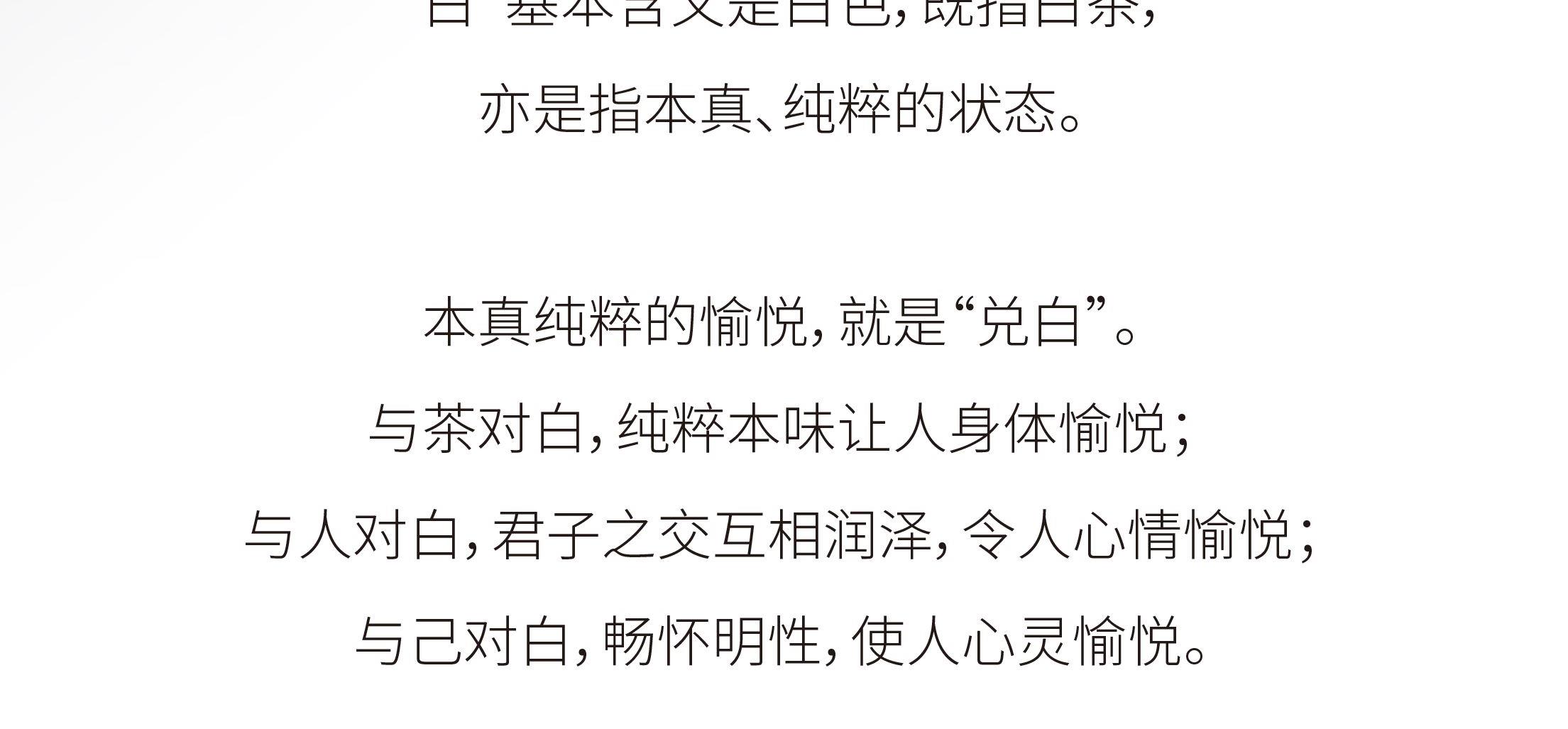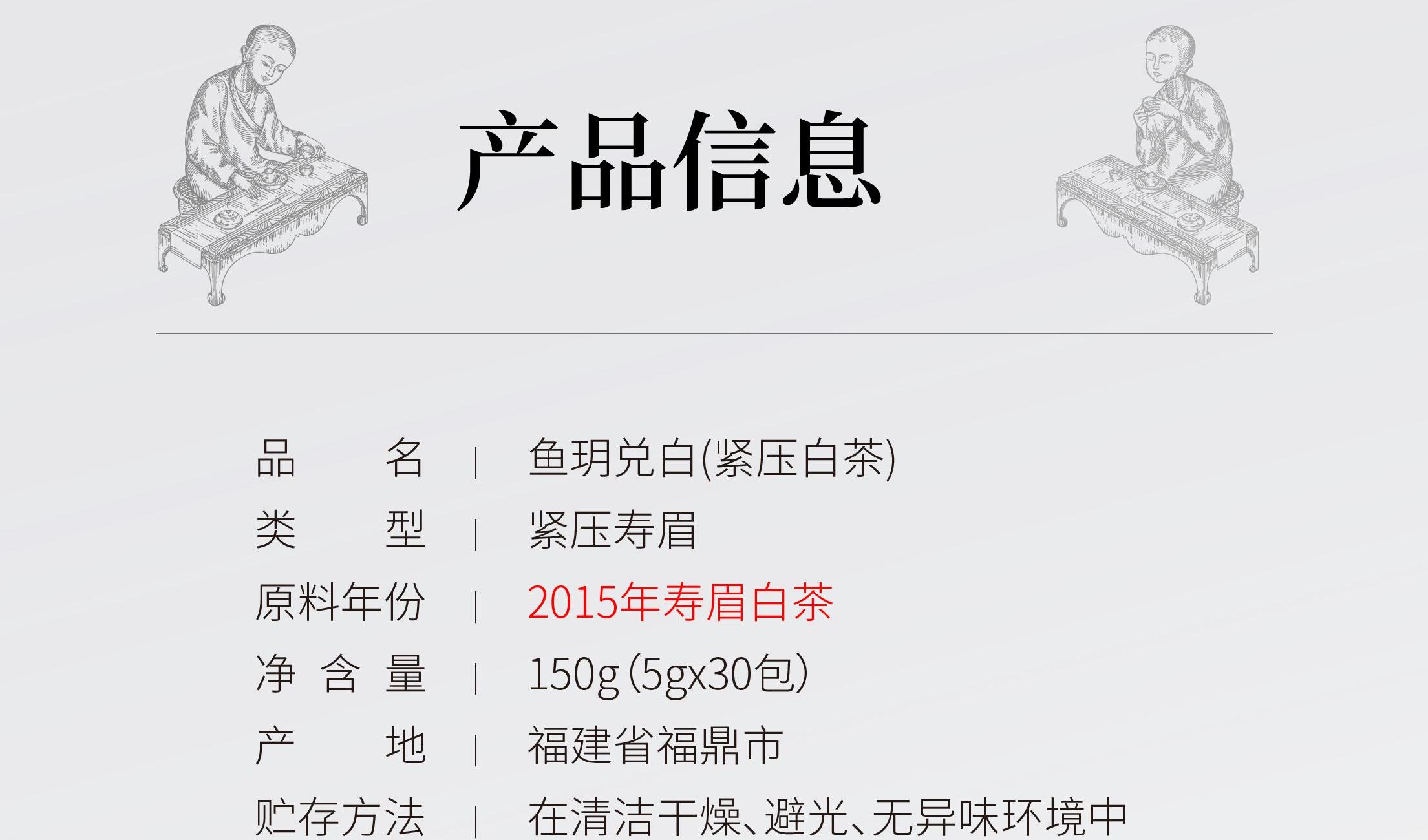 规格:8年陈福鼎白茶5gx30包 单盒外包装尺寸:250*220*50mm 储存条件:避光、通风、阴凉干燥 保质期:符合贮存条件下可长期保存 卖点: 1.兑卦,《易经》第58卦,易经当中一个表达喜悦的卦,鱼玥将其与白茶结合,“兑白”应势而生 2.源自福鼎白茶核心产区生态茶园,不炒不揉,仅有适时萎凋和干燥工序,更大程度保留茶的鲜美爽口、甘霖醇和, 3.保存时间长,越沉淀越醇香,8年陈老寿眉,可煮可泡可焖,茶性温和,口感甘醇,枣香馥郁。 4.一包一泡,随身携带,冲泡方便