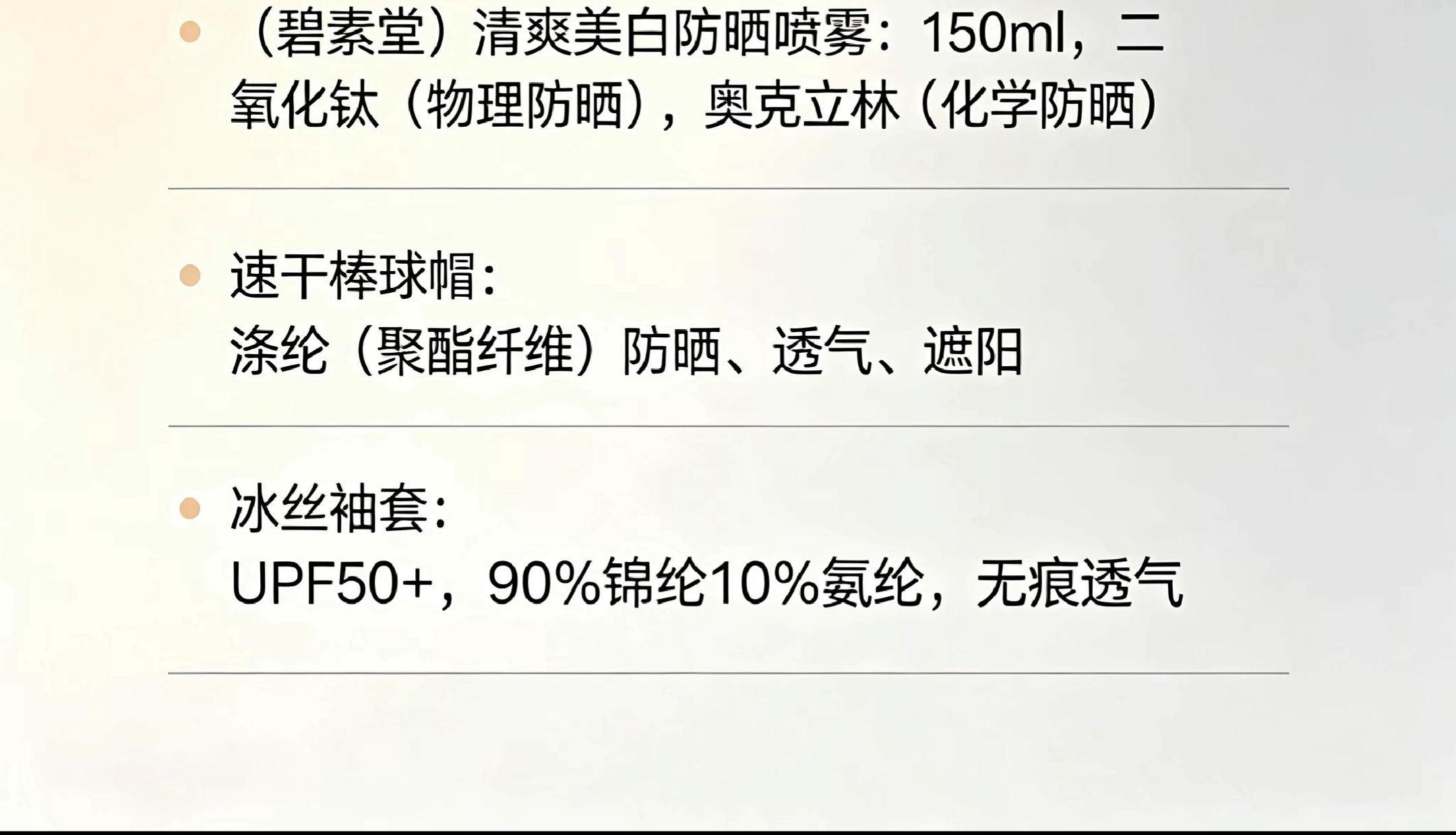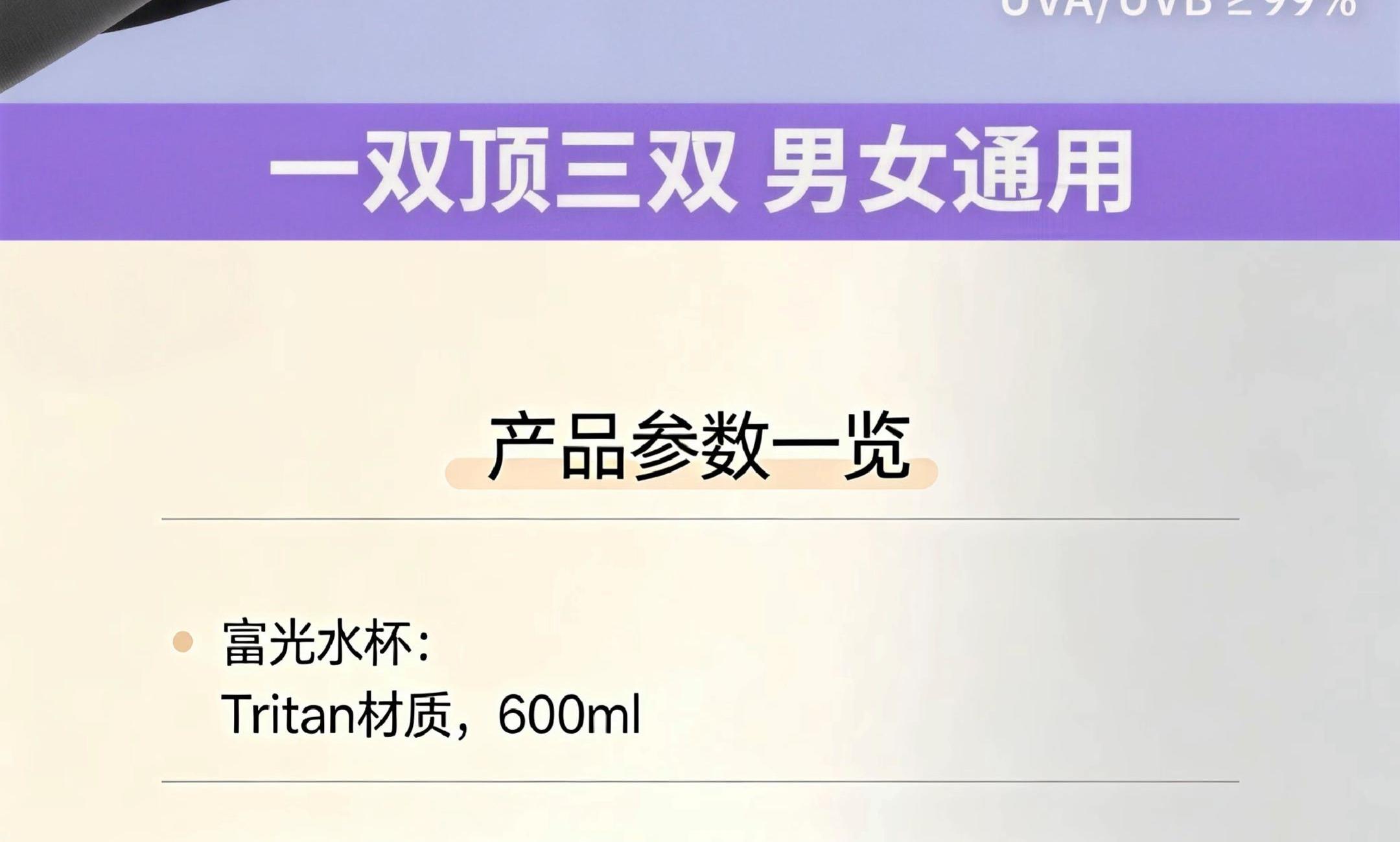 配置: (碧素堂)防晒喷雾*1 (富光)水杯*1 速干棒球帽*1 冰丝袖套*1 主要材质和功能: (富光)水杯:Tritan材质,600ML (碧素堂)清爽美白防晒喷雾:150ml,二氧化钛(物理防晒),奥克立林(化学防晒) 速干棒球帽:涤纶(聚酯纤维),防晒,透气,遮阳 冰丝袖套:UPF50+,90%锦纶10%氨纶