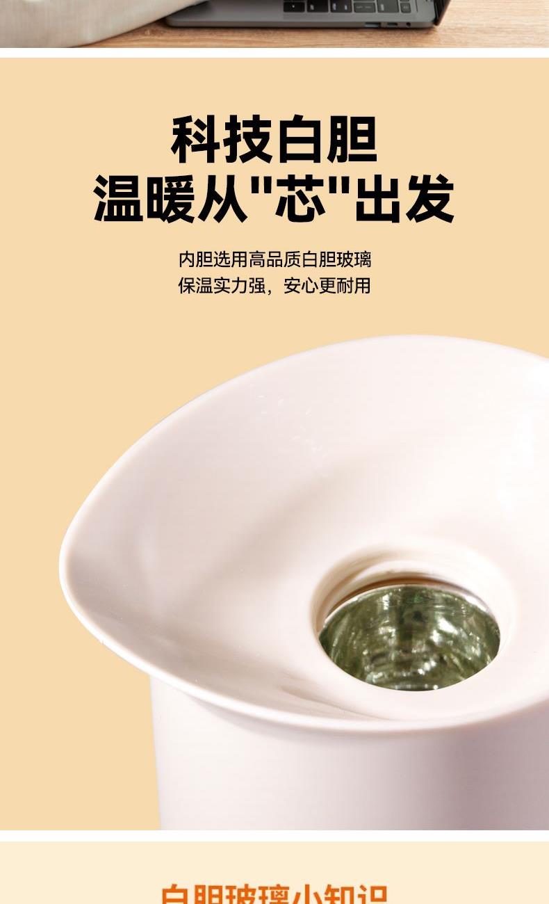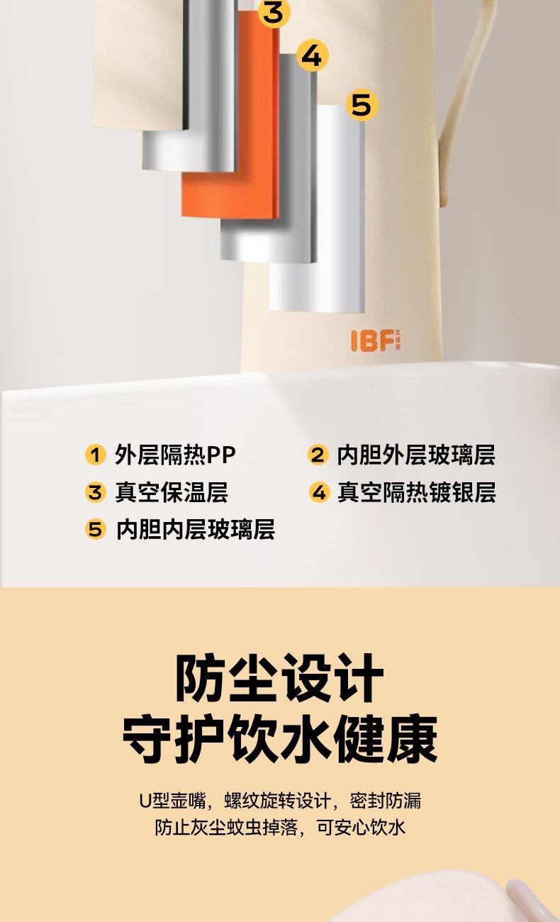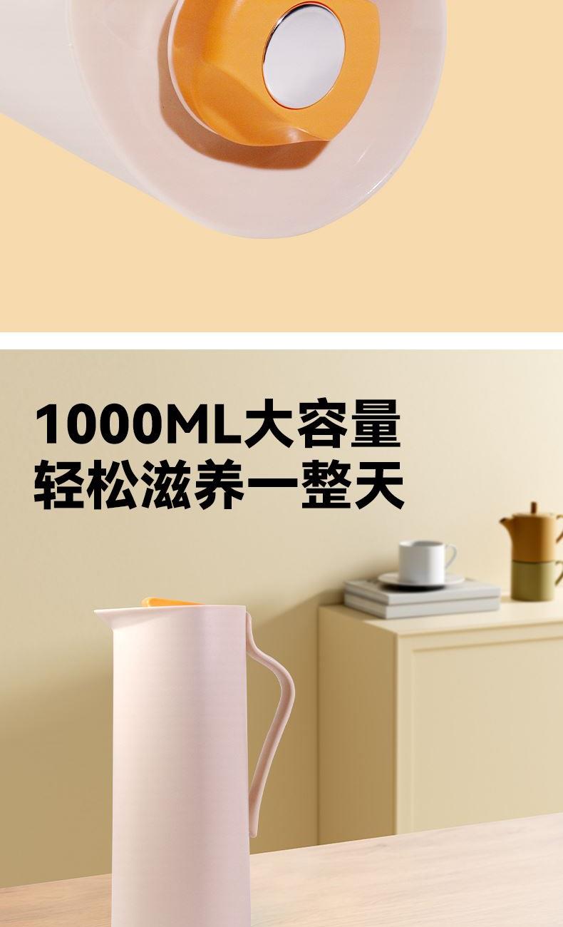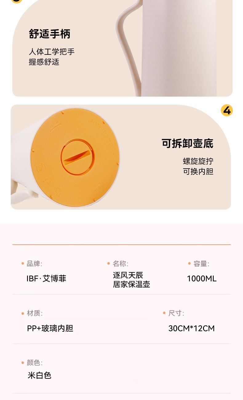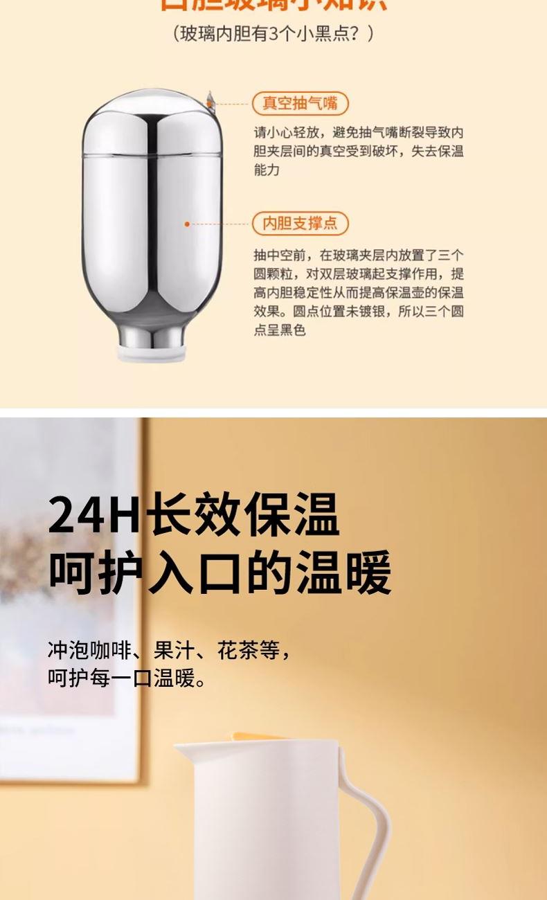 容 量:1000mL 净 重:0.621kg 彩盒尺寸:32.5x15x12.7cm 外箱尺寸:53x46.5x34cm 产品条码:6970070174113 执行标准:GB/T 11416-2002 在踏上旅途的那一刻,我们都渴望有一个贴心的伙伴能陪伴我们走过每一段精彩旅程的好选择。 长效保温:真空隔热层有效减少热传导,热水可保温6-12小时,冷水保冷约24小时。 温度稳定:玻璃内胆热稳定性强,避免温度骤变导致容器变形或异味产生。 玻璃内胆:高硼硅玻璃耐高温(-5℃~120℃),无重金属析出风险,尤其适合冲泡茶、母婴用水等对材质敏感的场景。 PP外壳:防锈抗冲击,保护脆弱的玻璃内胆。 旋紧式壶盖,倾斜倒水时不易渗漏,适合车载、户外使用。 露营、旅行时保冷(冰水、冷饮、泡茶)或保温(热咖啡、汤粥),轻量化设计便于携带。 产品材质:PP+玻璃内胆