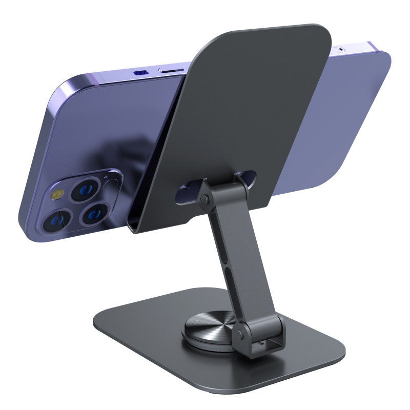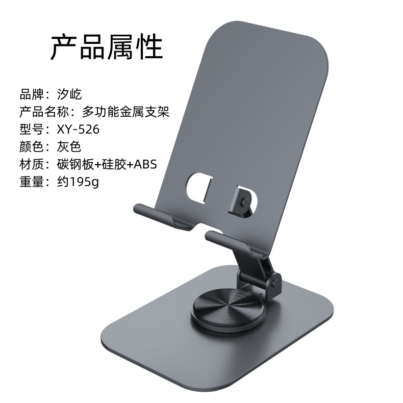 颜色:灰色 材质:碳钢板+硅胶+ABS 尺寸:103*74*36mm 重量:约195g 工艺:氧化喷砂 适用型号:手机,平板等 产品包装尺寸:107*76*39mm(牛皮纸盒包装) 产品卖点:360°旋转,折叠便携,高度可调,自由伸缩,加厚硅胶,加重底座,防止滑动。