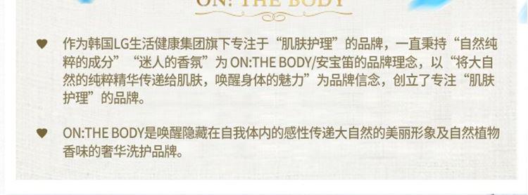 韩国进口,蕴含自然植萃成分,香皂柔和洁净愉悦洁肤 润体乳:1、香水配方,持久留香; 2、添加3钟保湿精油保湿身体乳; 3、低刺激配方,5不添加敏感肌肤也使用(不添加甲酸酯、人工色素、三乙醇胺、丙二醇、矿物油)