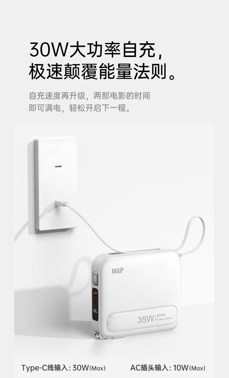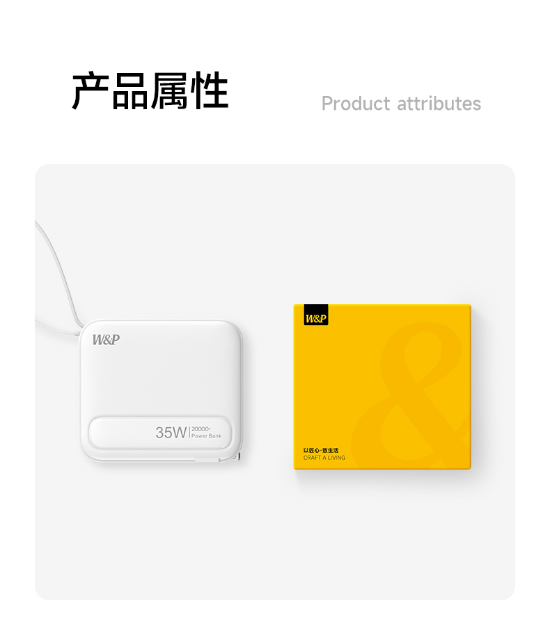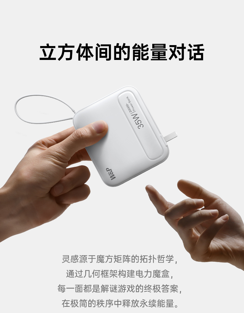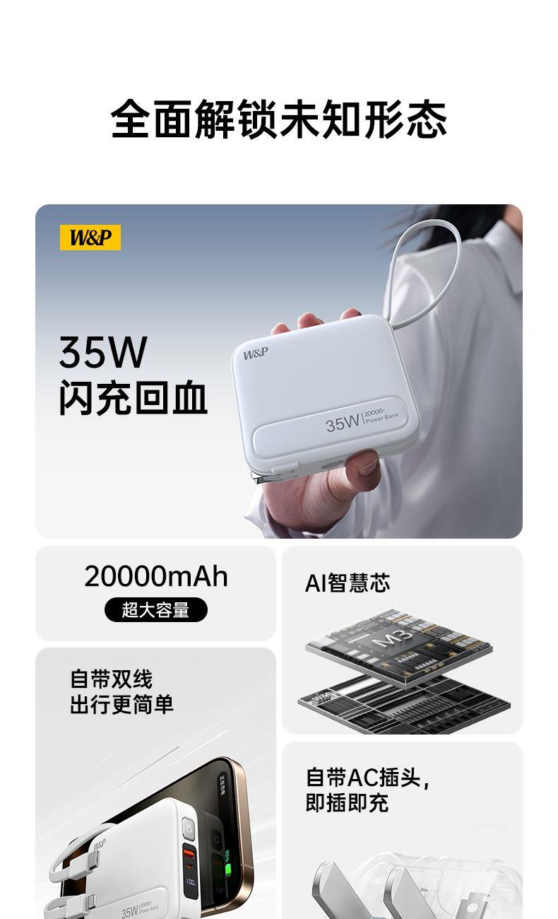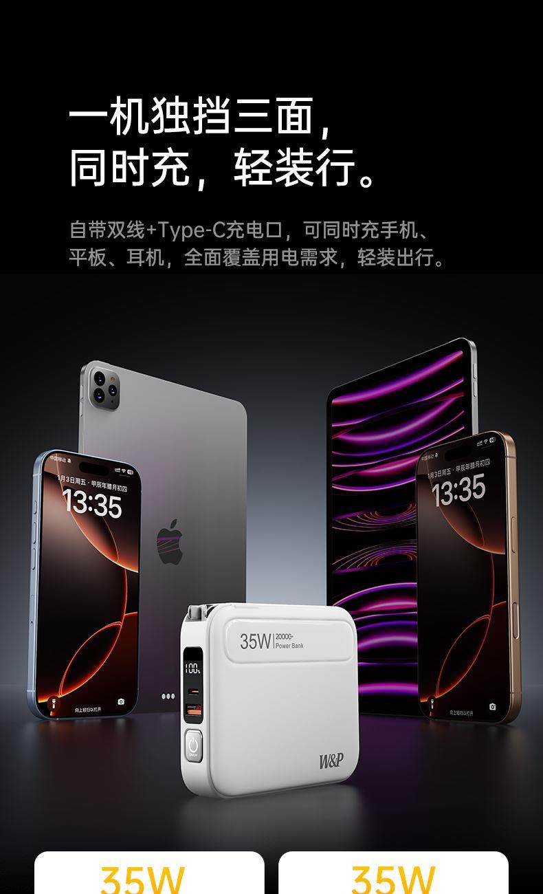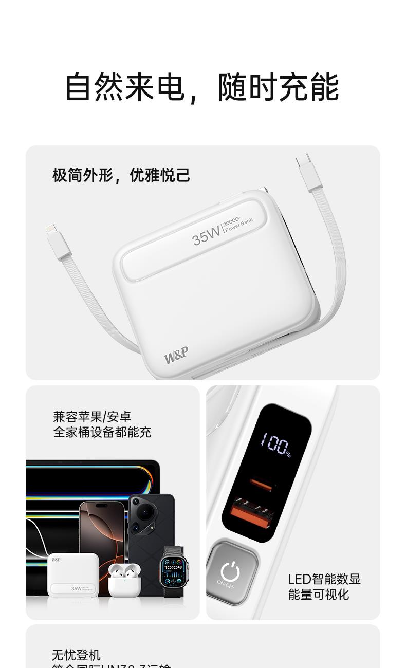 产品型号:DC10 产品尺寸:100.2x87x33.2mm 产品重量:365g W&P磁吸充电宝,科技赋能移动生活; 35W快充,自带苹果线及TC线; 创新磁吸矩阵,兼容苹果安卓,三设备同时充; LED数字屏实时显示电量; 隐藏式双线+可折叠插头,满足多样场景; 升级高精细云端智算,全天候实时严格监控低温运行; 20000mAh电芯,满足全天差旅需求。