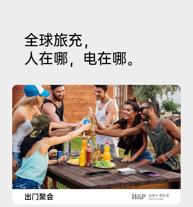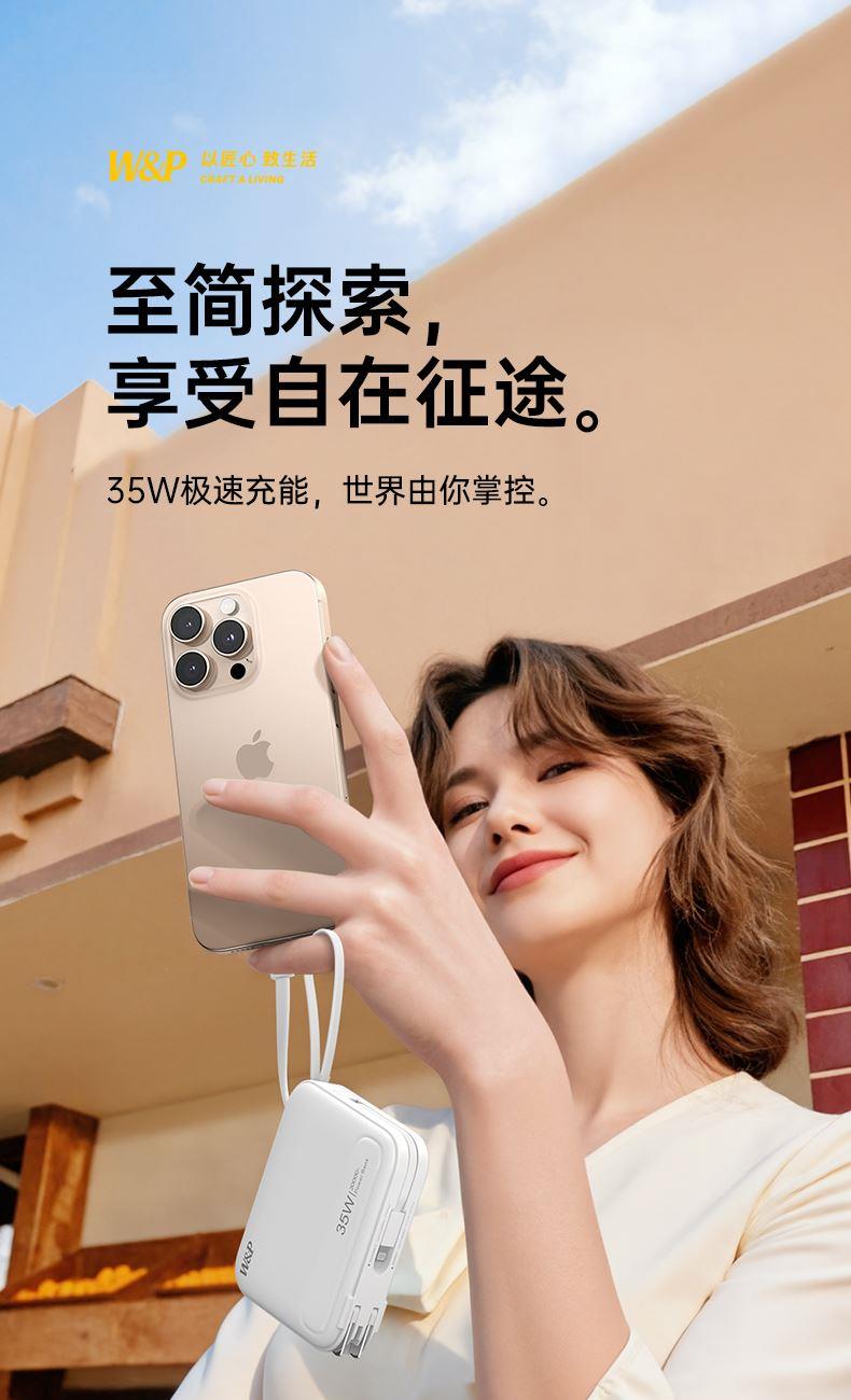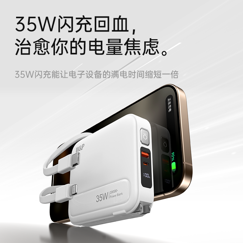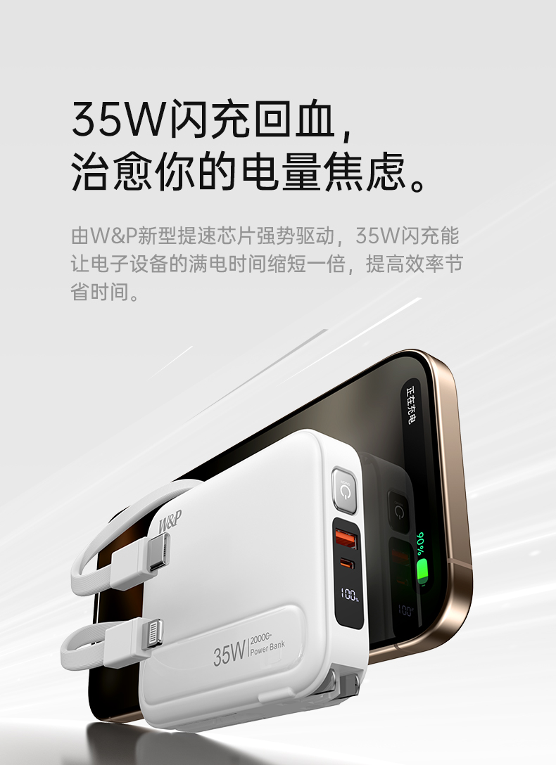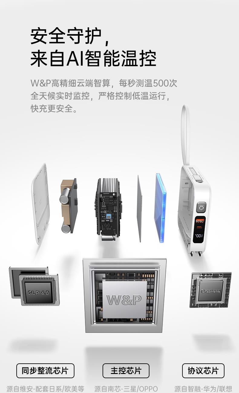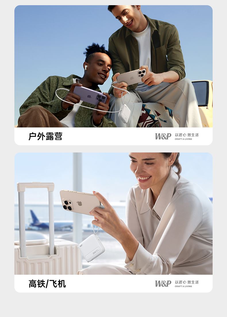产品型号:DC10 产品尺寸:100.2x87x33.2mm 产品重量:365g W&P磁吸充电宝,科技赋能移动生活; 35W快充,自带苹果线及TC线; 创新磁吸矩阵,兼容苹果安卓,三设备同时充; LED数字屏实时显示电量; 隐藏式双线+可折叠插头,满足多样场景; 升级高精细云端智算,全天候实时严格监控低温运行; 20000mAh电芯,满足全天差旅需求。