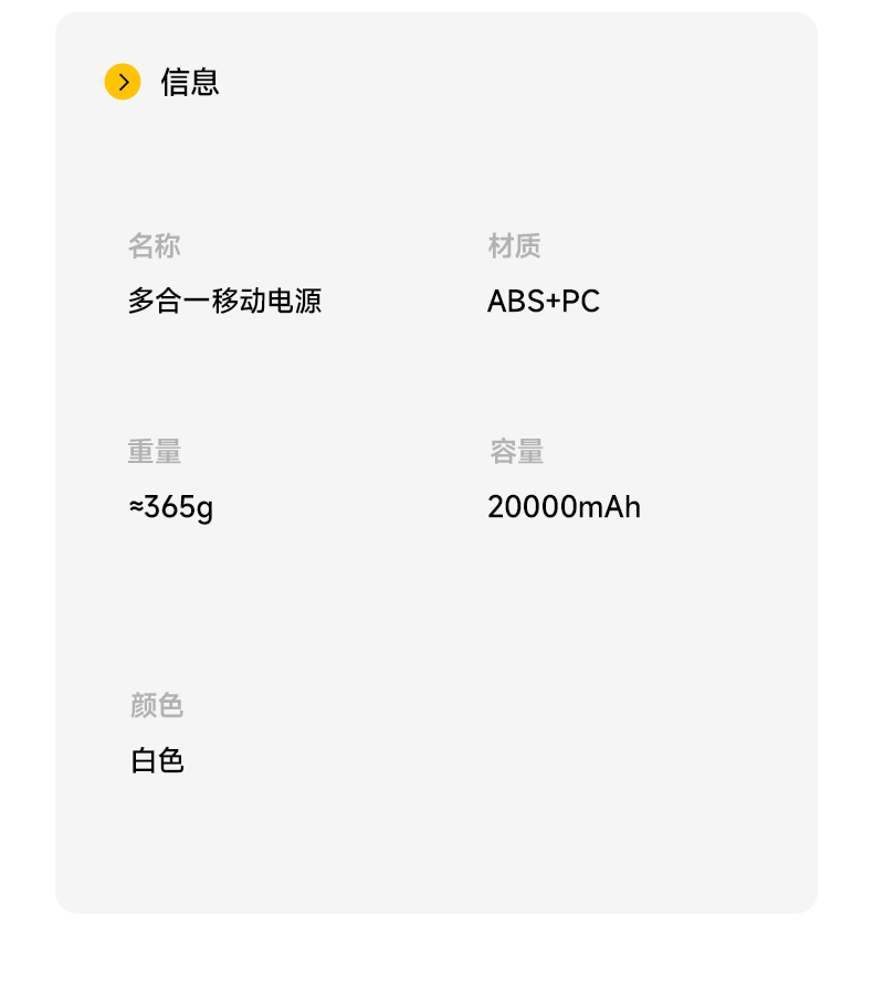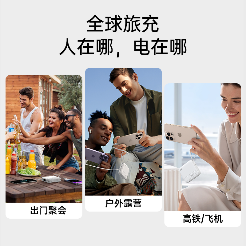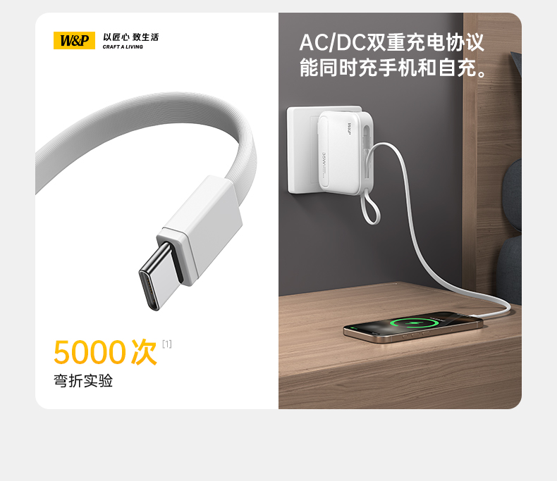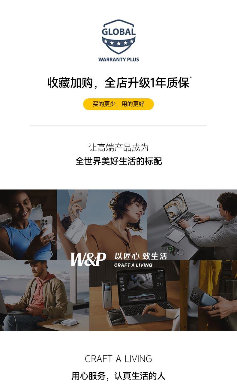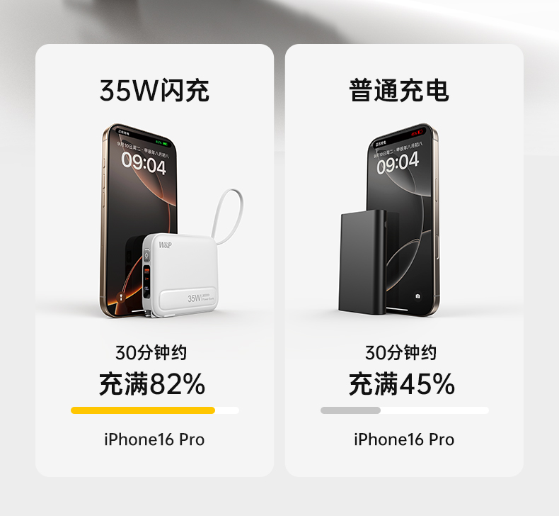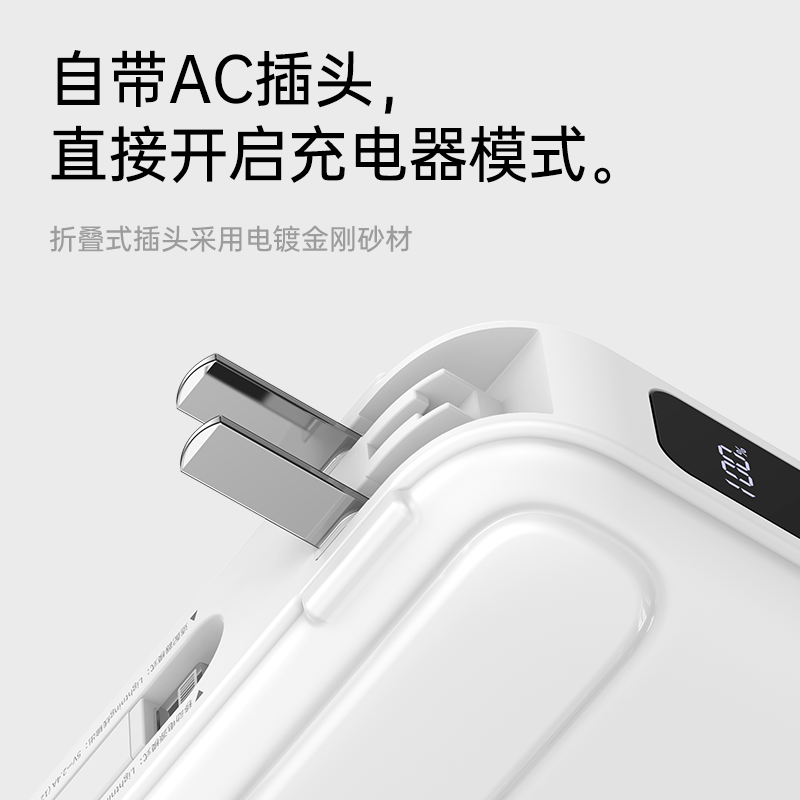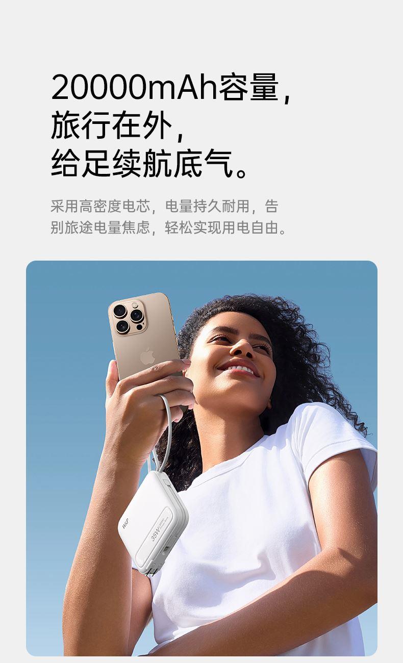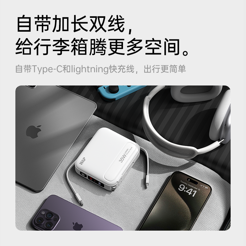 产品型号:DC10 产品尺寸:100.2x87x33.2mm 产品重量:365g W&P磁吸充电宝,科技赋能移动生活; 35W快充,自带苹果线及TC线; 创新磁吸矩阵,兼容苹果安卓,三设备同时充; LED数字屏实时显示电量; 隐藏式双线+可折叠插头,满足多样场景; 升级高精细云端智算,全天候实时严格监控低温运行; 20000mAh电芯,满足全天差旅需求。