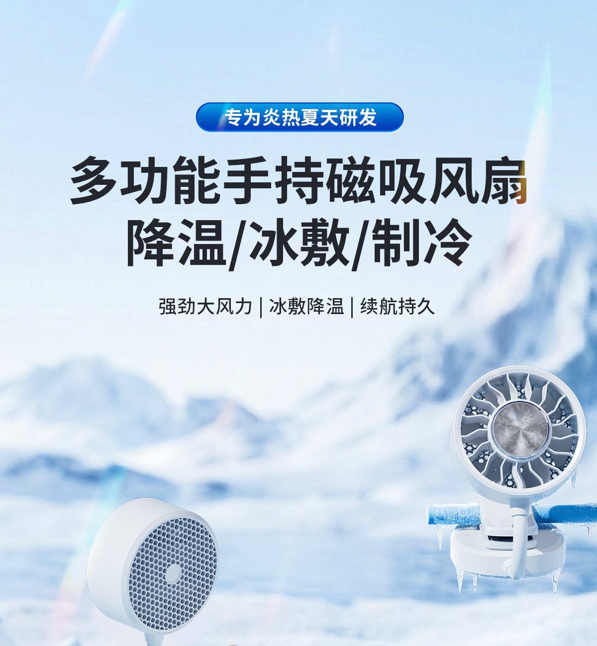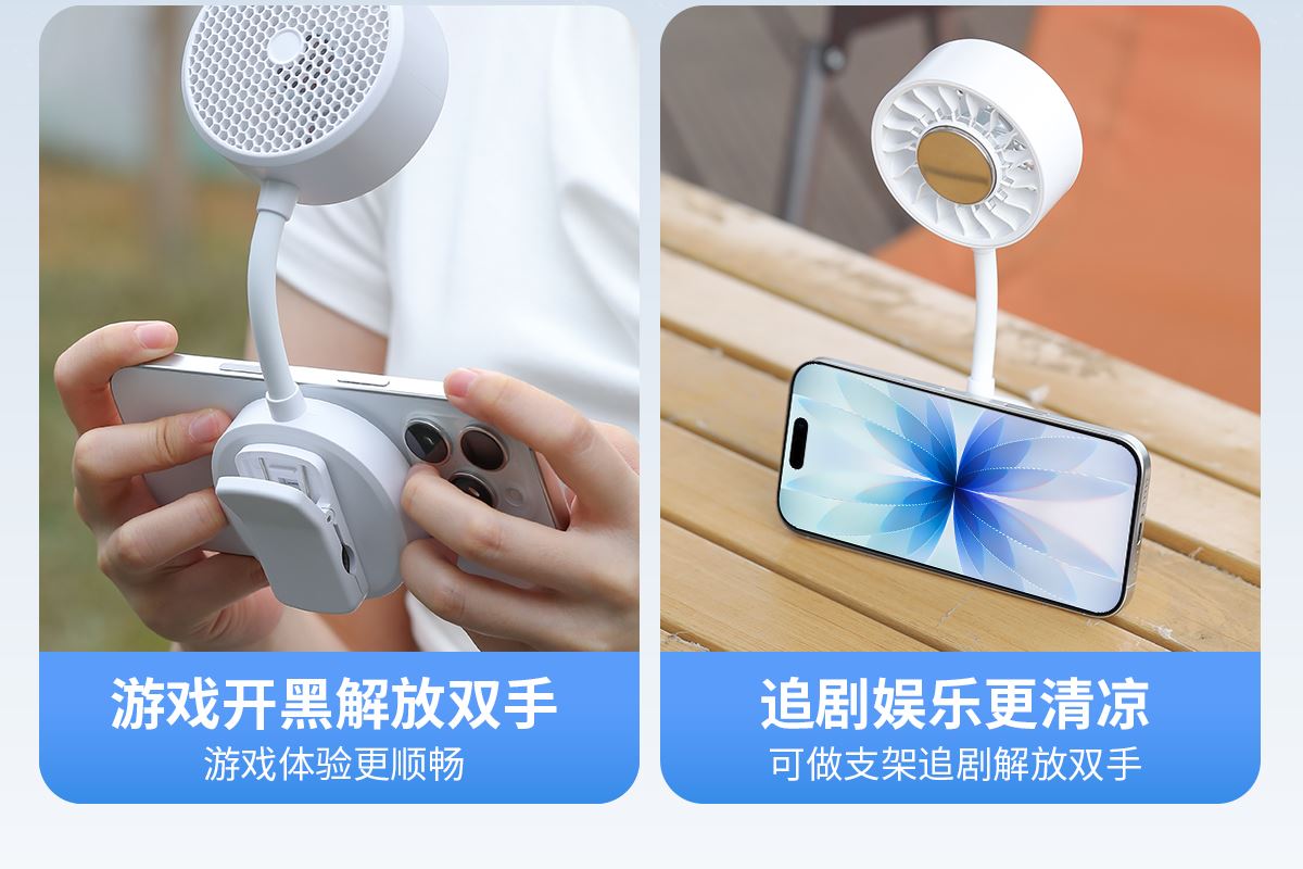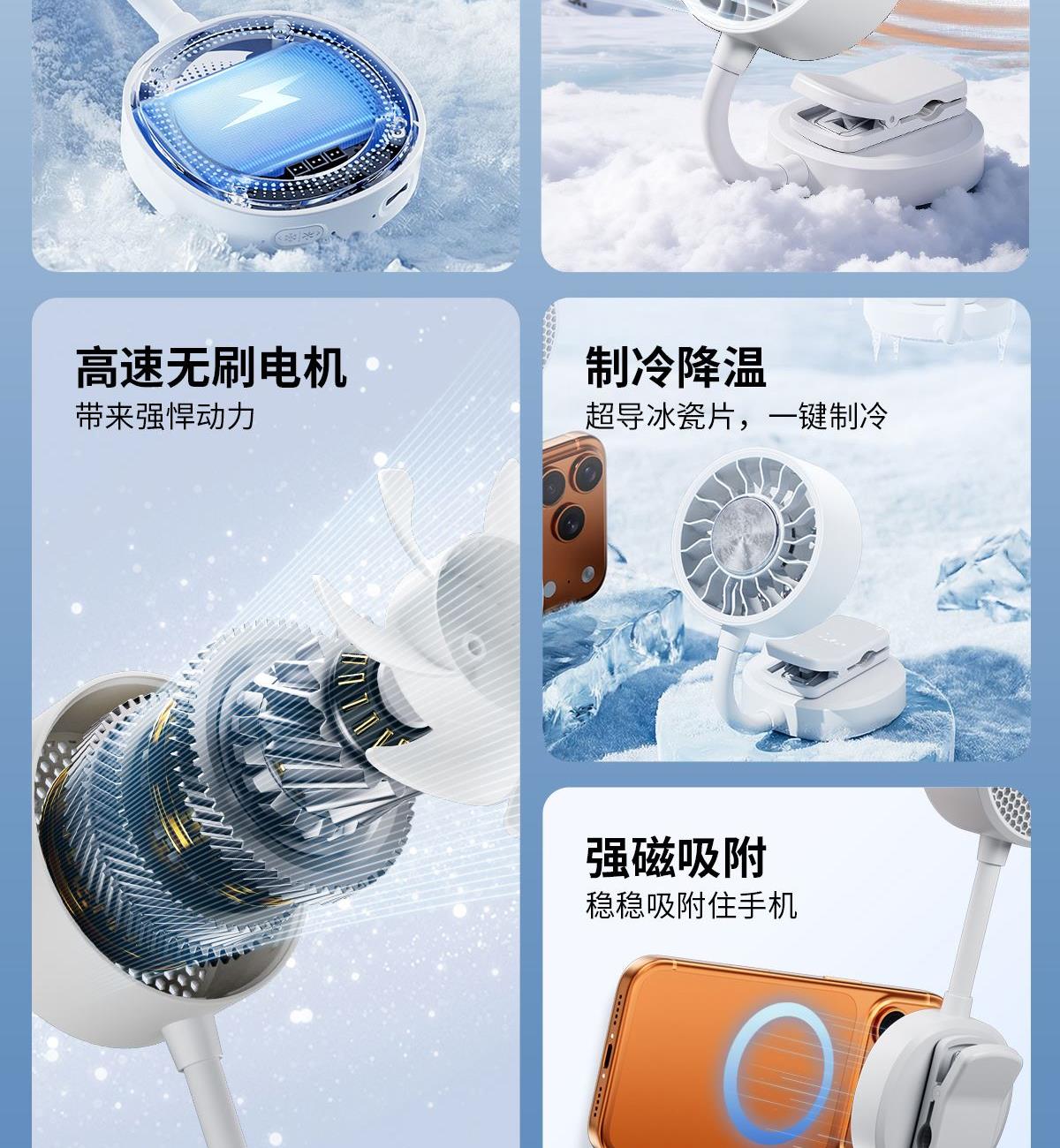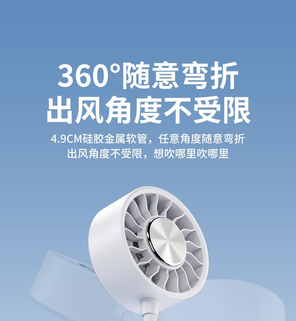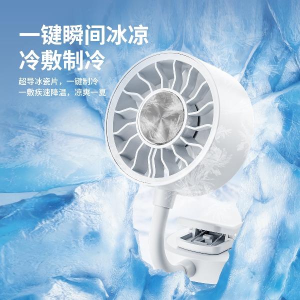 *软管可随意弯折调整出风角度,底座带磁吸可吸附手机上和任何金属表面 *底座带夹子可夹雨伞,电脑等 *制冷款带冰敷功能(也有不带冰敷可选)