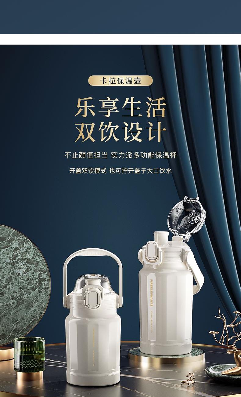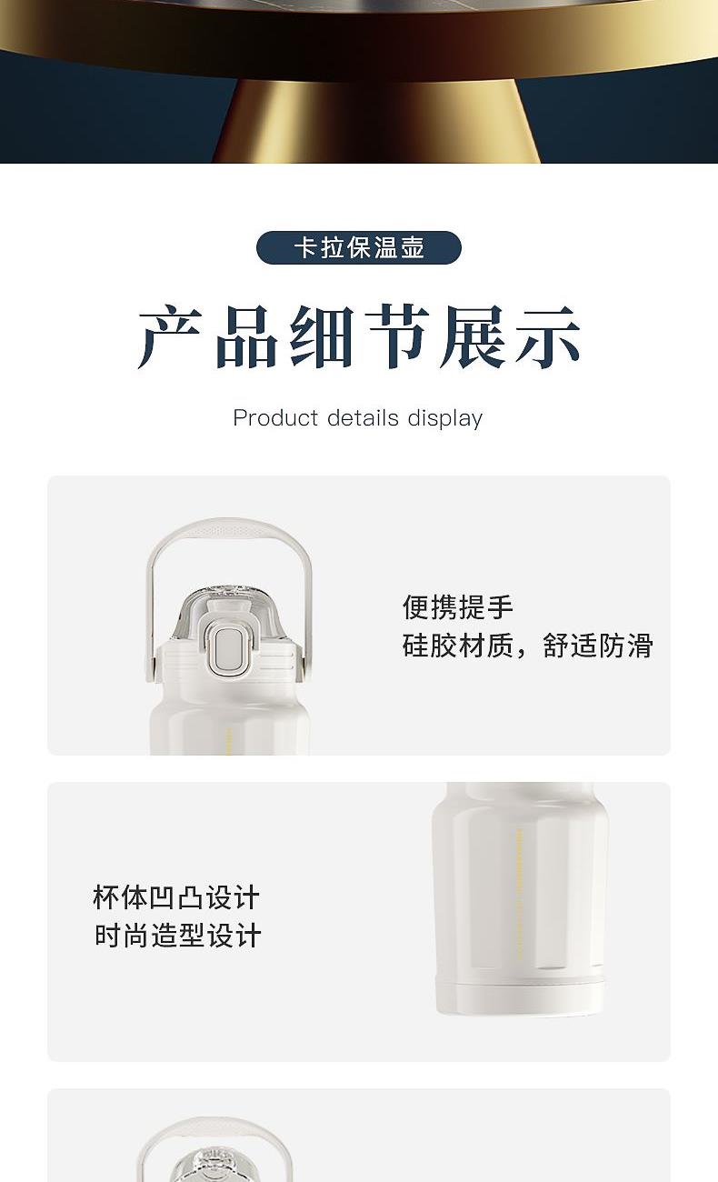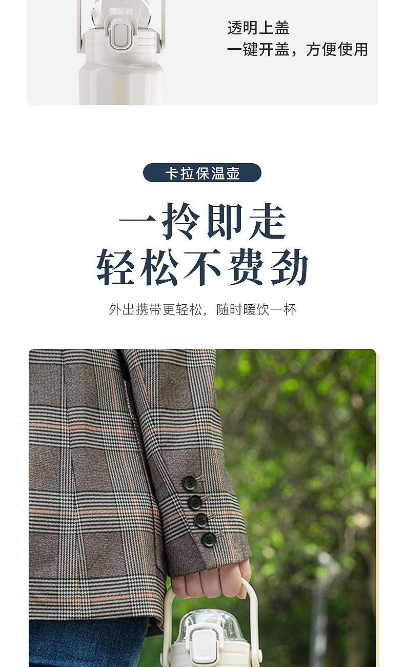 产品规格:750ML ;(大壶900ML定制款) 产品材质:内胆底316不锈钢,内胆壁体304不锈钢 杯盖:PP(食品级) 硅胶圈:硅胶(食品级) 产品颜色:白色 彩盒尺寸:12*10.6*20.2CM 外箱尺寸:L66*W62*H22CM 1、优质食品级不锈钢内胆,耐磨耐酸碱显著提升,使用寿命提升的同时还能长效保温6小时。 2、宽大手提设计,便捷携带,可居家、户外、旅行、办公、车载多场景适用。 3、乐享生活,内置吸管,双饮模式设计,可吸引、可直饮,慢吸快饮,精致时尚。