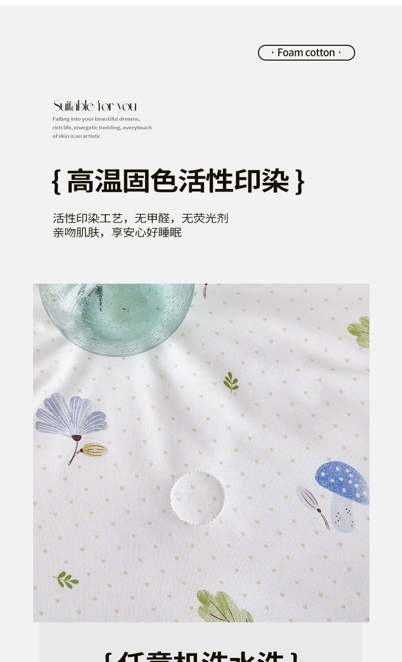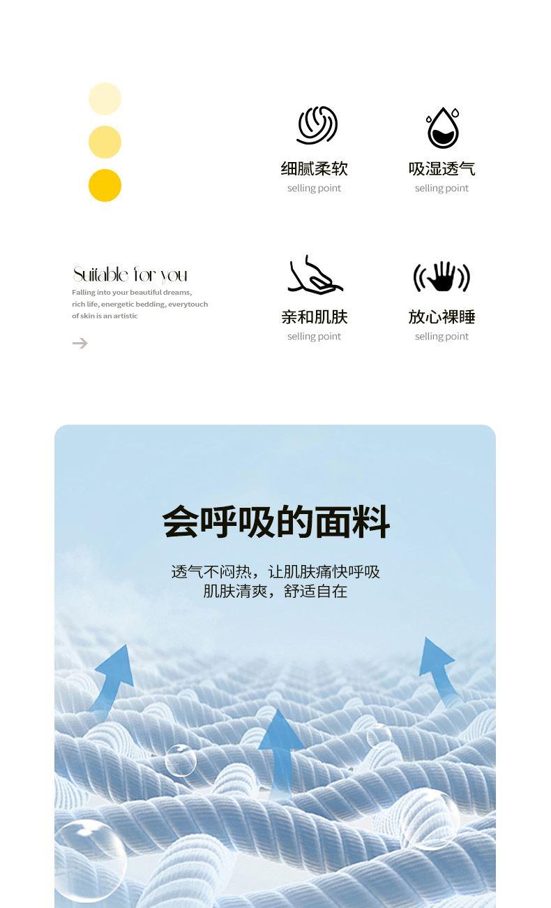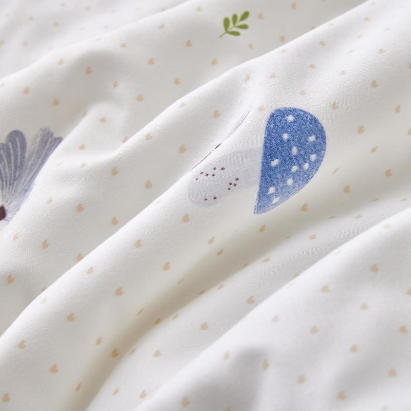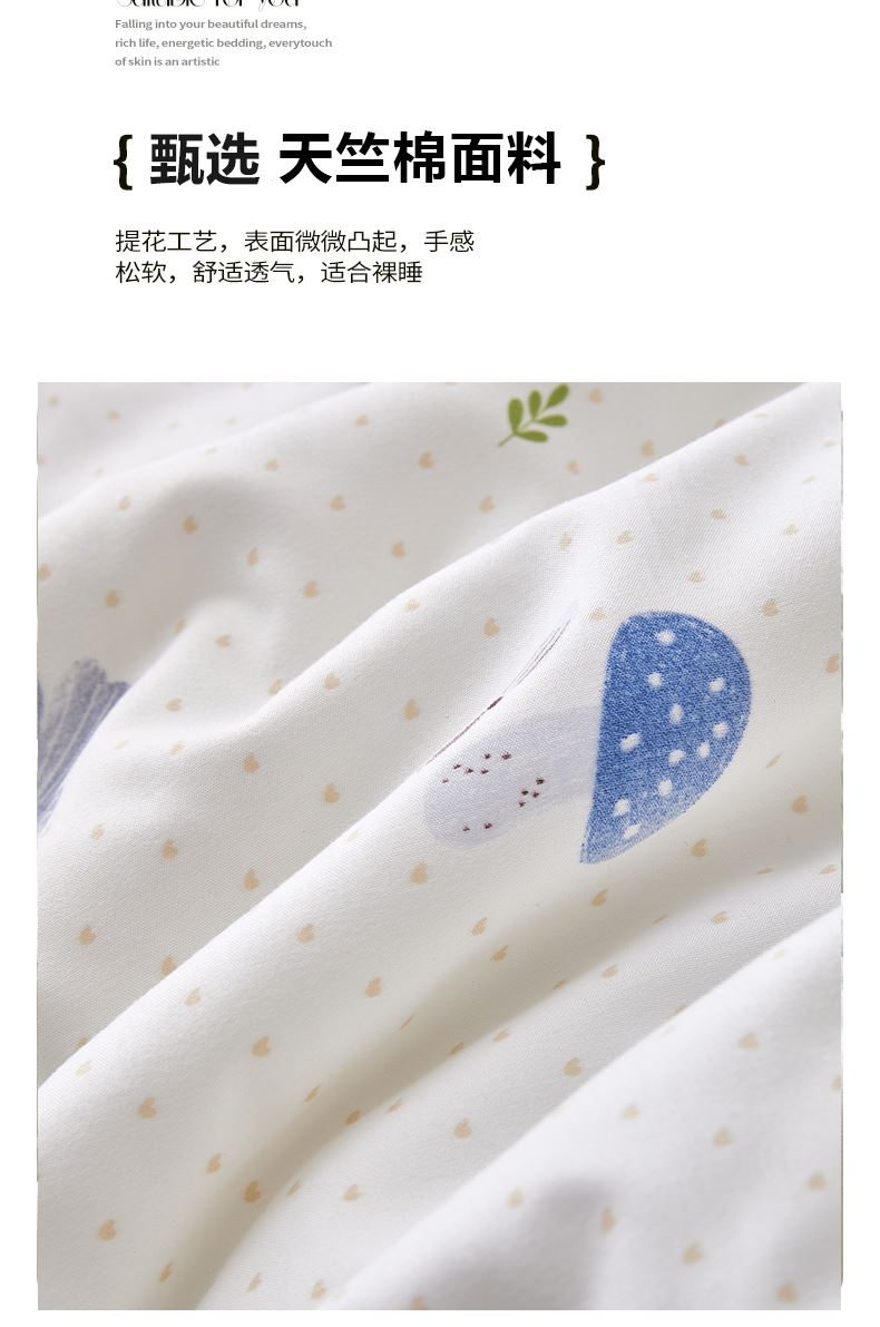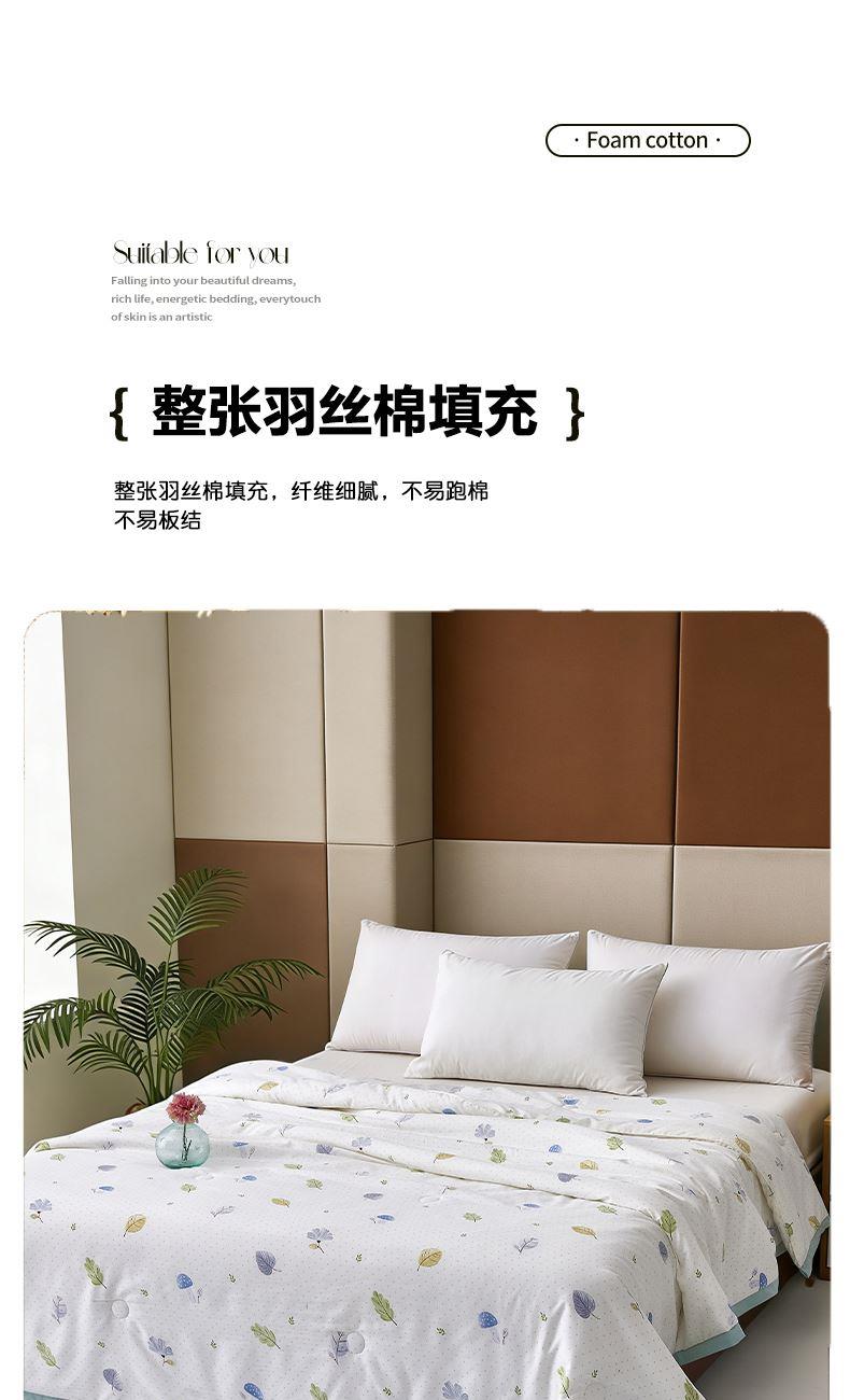 规格:200*230cm 面料:天竺棉(聚酯纤维) 填充:羽丝棉 填充克重:500g 执行标准:GB/T22796-2021 安全类别:GB18401-2010 B类 1.高支密天竺棉面料,源于自然的绵软触感 质感丰盈软糯与肌肤零距离接触,弹性更优良。新颖的纤陌结构,使得水汽自由流通,吸湿性,使得整条被子舒适健康,给您一个精致睡眠。
