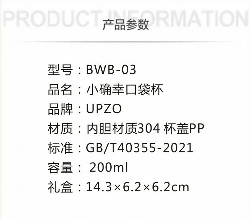 型号: BWB-03 材质: 内胆材质304 杯盖PP 容量: 200ML 外盒: 14.3×6.2×6.2cm 外观靓丽 品质优良