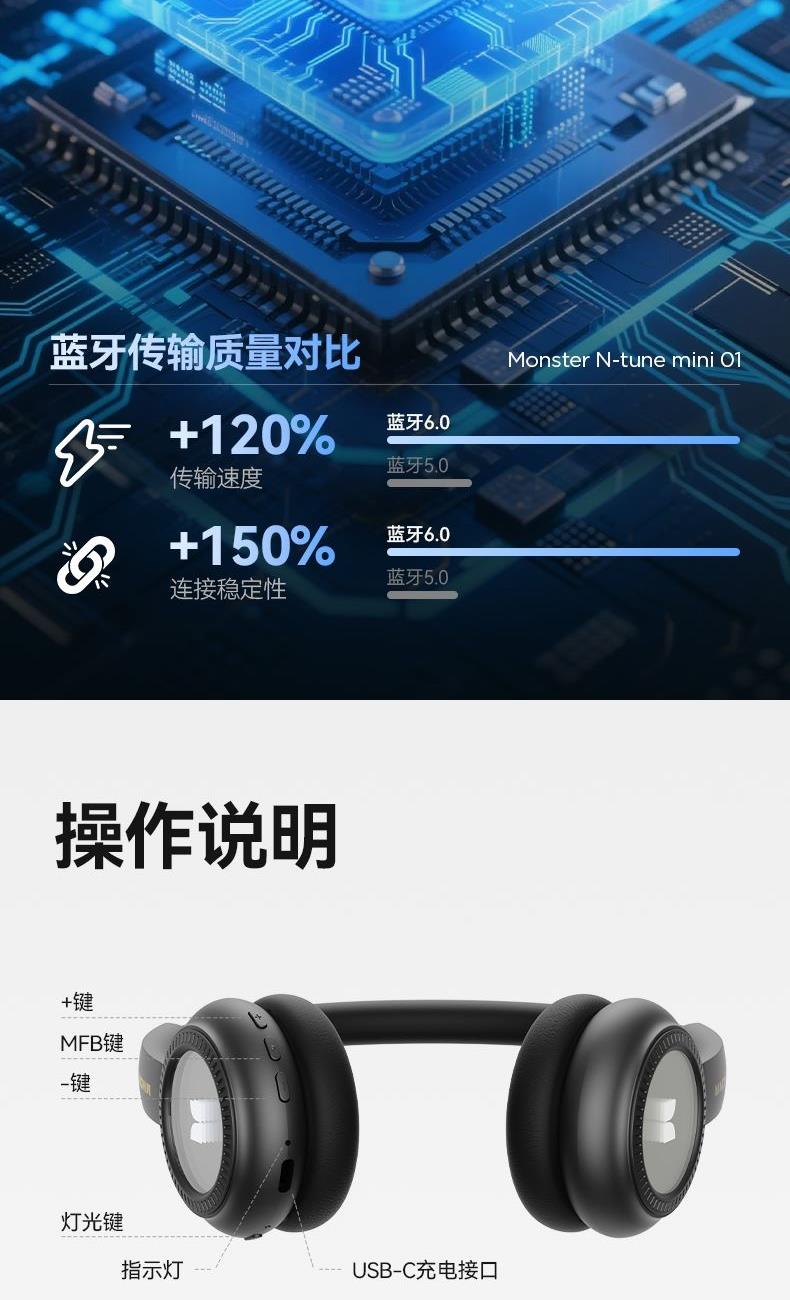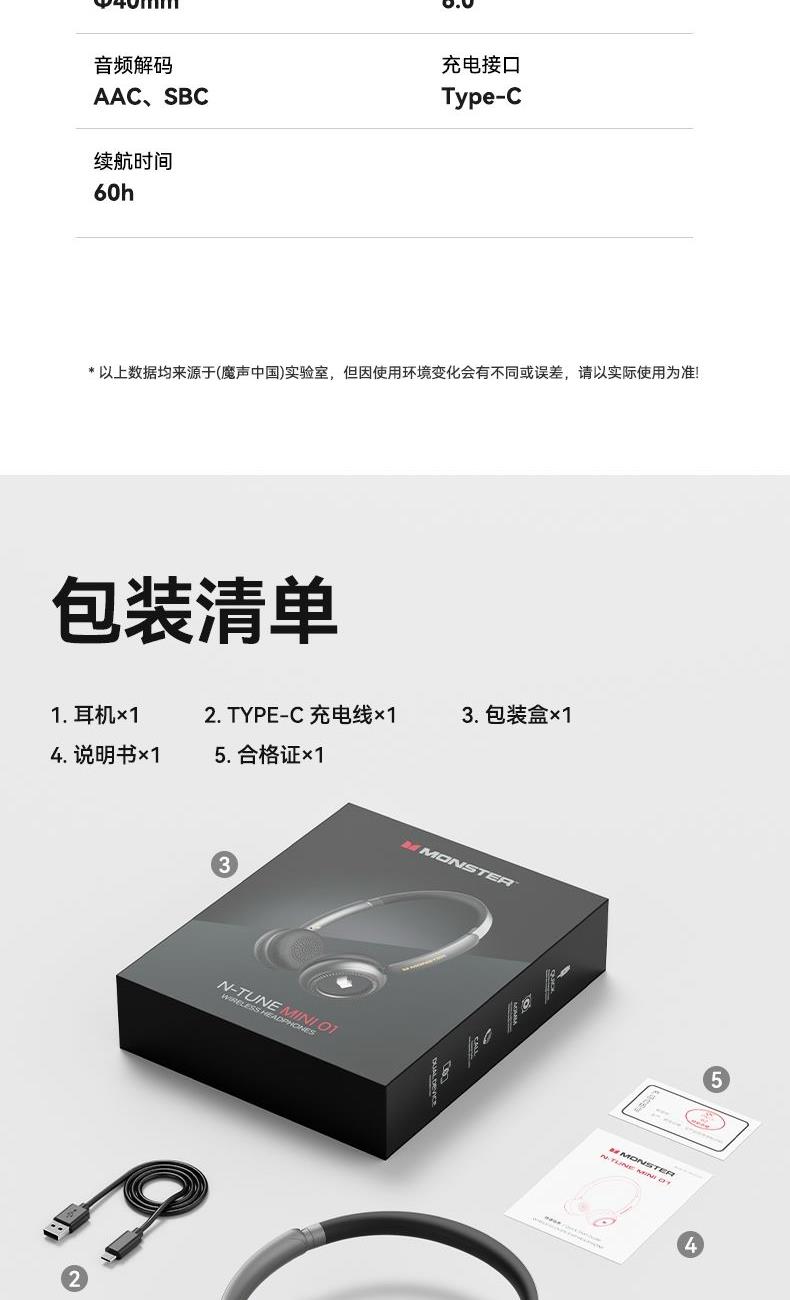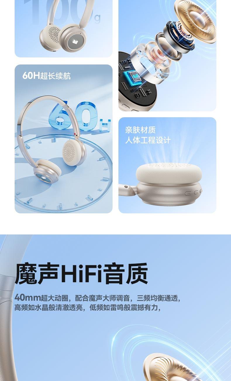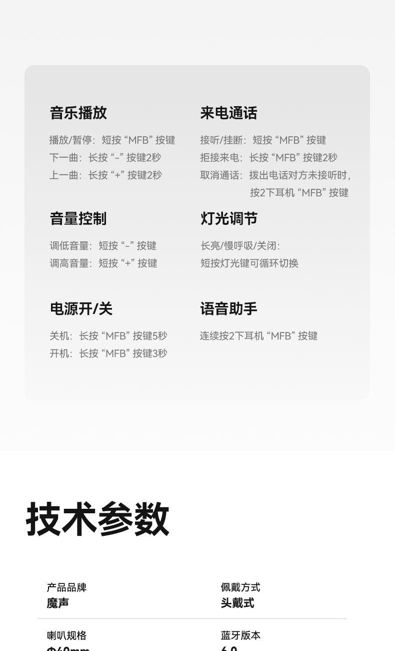 芯片方案:7006F4 蓝牙版本:6.0 喇叭规格:Φ40mm 音频解码:AAC、SBC 播放时长:约26小时(50%音量) 通话时长:约21小时(50%音量) 电池规格:500mAh 充电时长:约2小时 充电接口:Type-C(5V/1A) 防水等级:没有 • 蓝牙6.0,连接更稳定,功耗更低,更省电 • 专为中国人头型设计的亲肤材质,佩戴更轻巧,更舒适,更稳定。 • 潮人必备魔声千层镜,酷炫灯效,独立开关自由选择 • 轻薄小巧重量100g,60小时超长续航,让音乐永不停歇