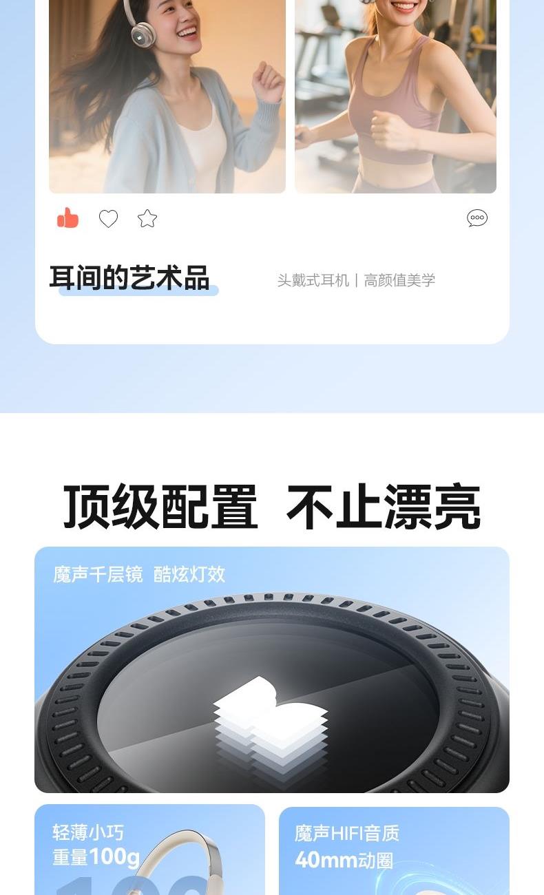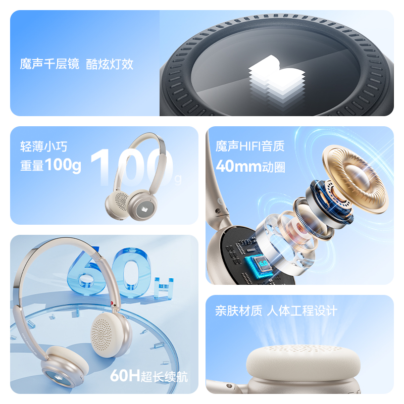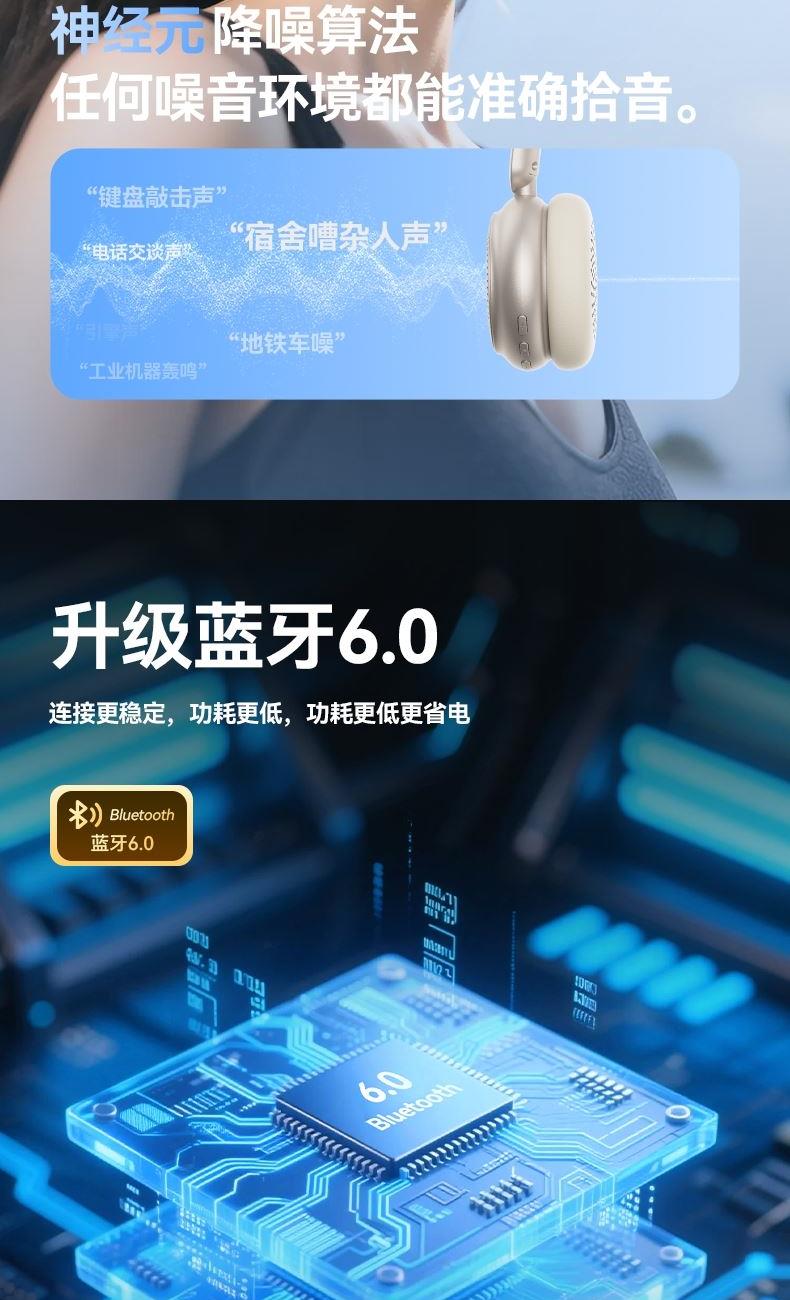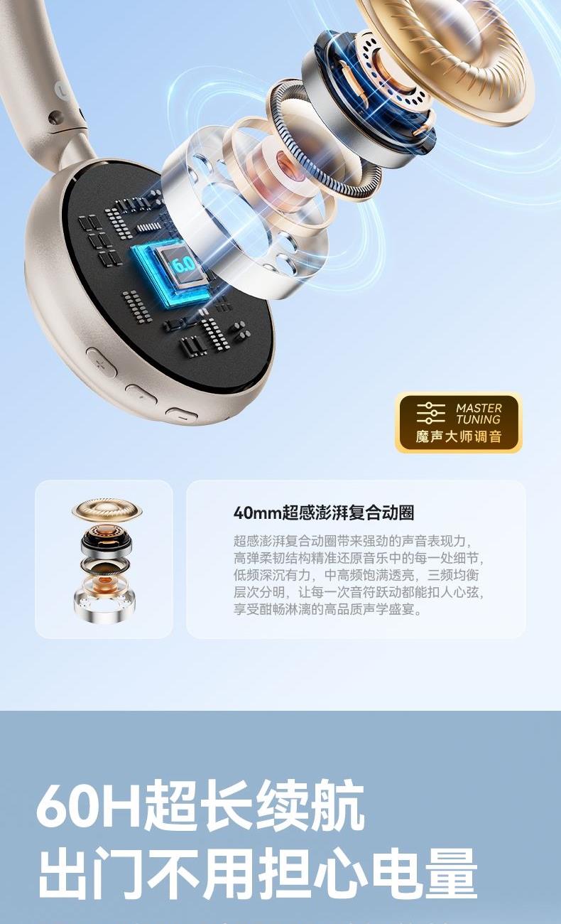 芯片方案:7006F4 蓝牙版本:6.0 喇叭规格:Φ40mm 音频解码:AAC、SBC 播放时长:约26小时(50%音量) 通话时长:约21小时(50%音量) 电池规格:500mAh 充电时长:约2小时 充电接口:Type-C(5V/1A) 防水等级:没有 • 蓝牙6.0,连接更稳定,功耗更低,更省电 • 专为中国人头型设计的亲肤材质,佩戴更轻巧,更舒适,更稳定。 • 潮人必备魔声千层镜,酷炫灯效,独立开关自由选择 • 轻薄小巧重量100g,60小时超长续航,让音乐永不停歇