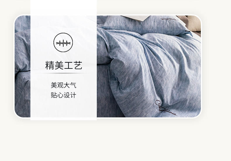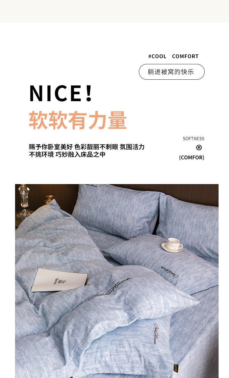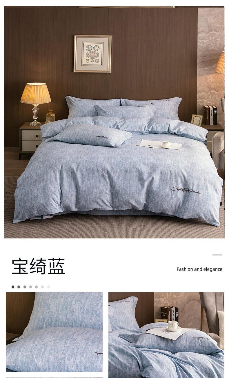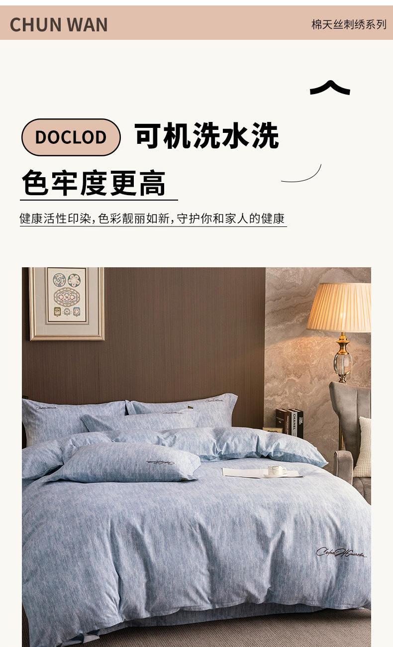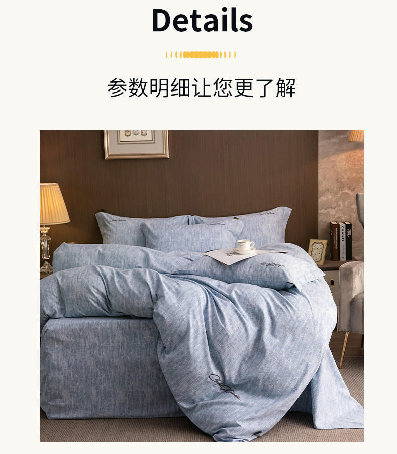 规格:被套200*230cm 床单240*250cm 枕套48*74cm*2 面料:A类 60%棉/40%莱赛尔纤维 花色:宝绮蓝、亮绮黄、木绮棕、苔绮绿、钛绮灰、樱绮丝 天丝棉四件套是一种结合了棉和莱赛尔纤维优点的产品。这种混纺材料通常具有良好的透气性、吸湿性和柔软手感;本款套件由60%的棉和40%的莱赛尔天丝(Lyocell)混纺而成 母婴级别A类 祼睡佳品。棉:提供自然舒适的感觉,吸湿性好,透气性强;莱赛尔天丝(Lyocell):增强面料的光泽度和柔滑感,简约刺绣增加了产品美观,简约中带点奢华。