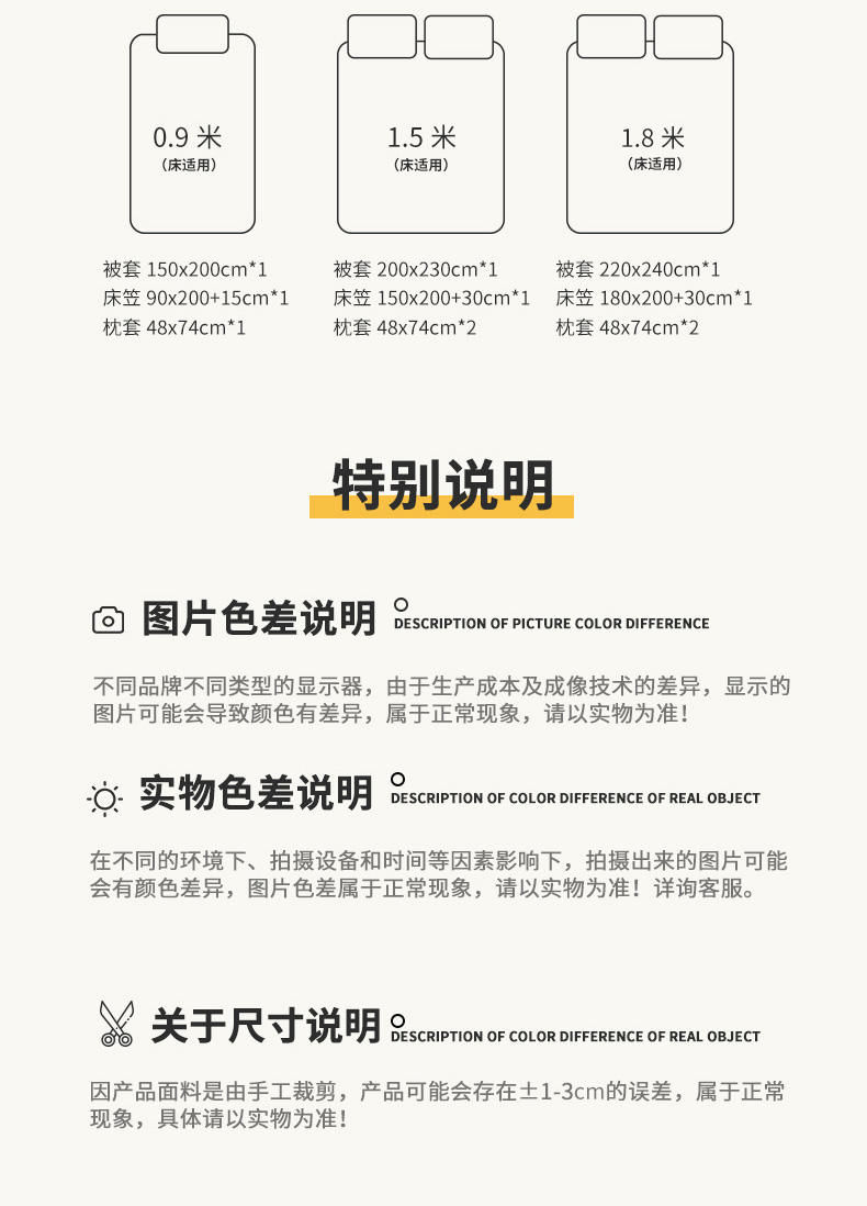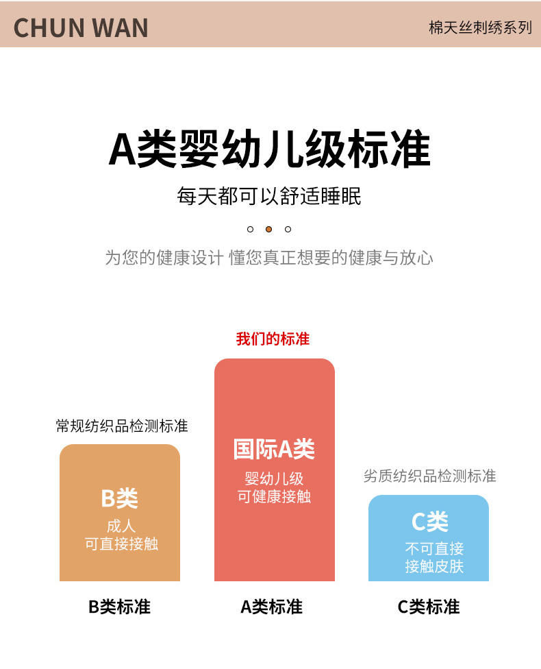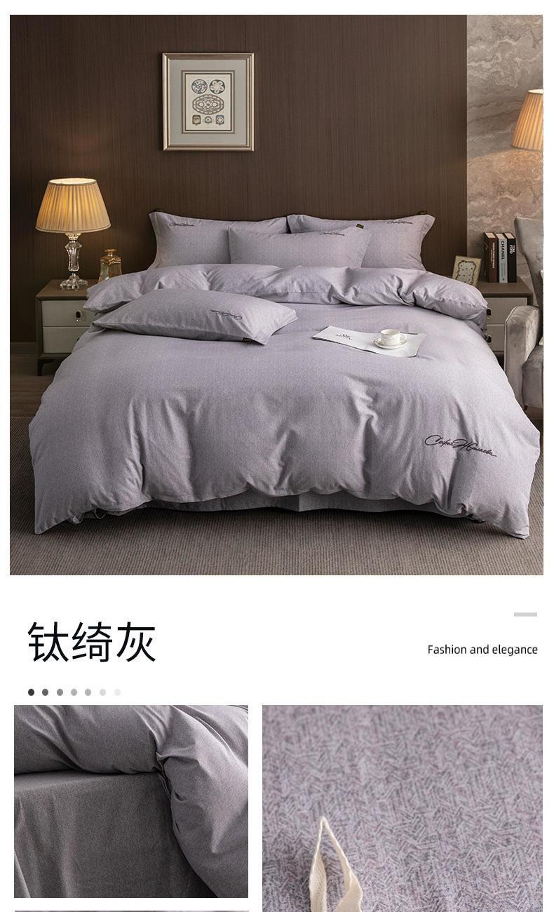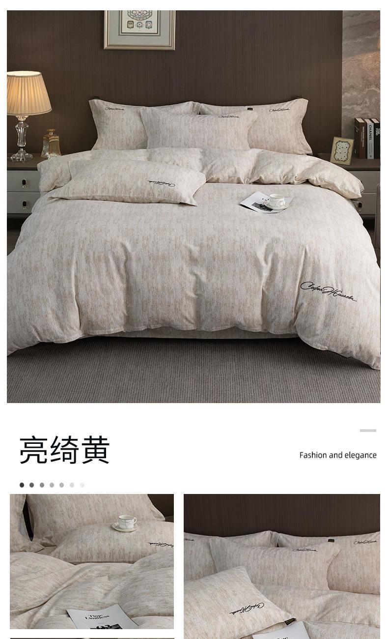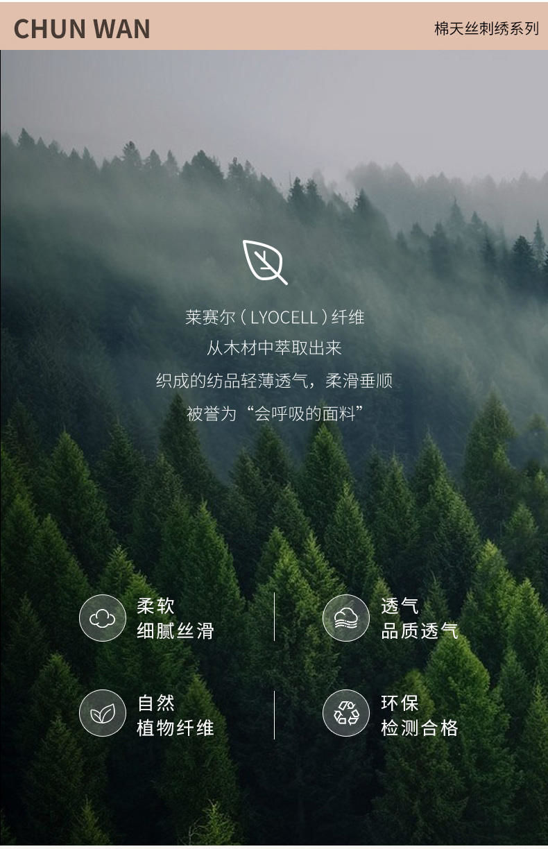 规格:被套200*230cm 床单240*250cm 枕套48*74cm*2 面料:A类 60%棉/40%莱赛尔纤维 花色:宝绮蓝、亮绮黄、木绮棕、苔绮绿、钛绮灰、樱绮丝 天丝棉四件套是一种结合了棉和莱赛尔纤维优点的产品。这种混纺材料通常具有良好的透气性、吸湿性和柔软手感;本款套件由60%的棉和40%的莱赛尔天丝(Lyocell)混纺而成 母婴级别A类 祼睡佳品。棉:提供自然舒适的感觉,吸湿性好,透气性强;莱赛尔天丝(Lyocell):增强面料的光泽度和柔滑感,简约刺绣增加了产品美观,简约中带点奢华。