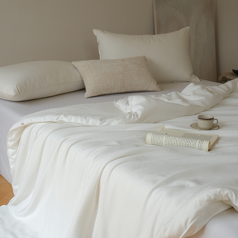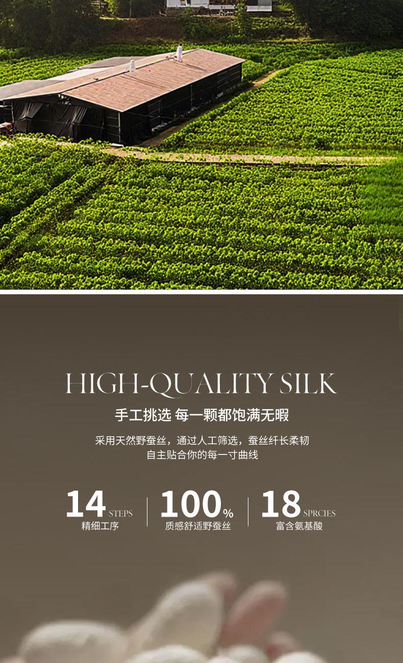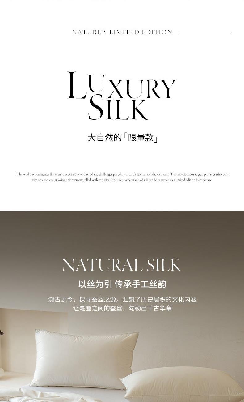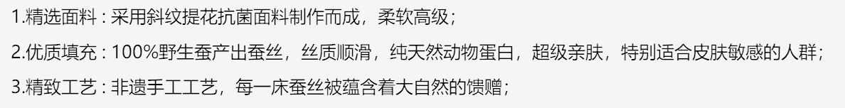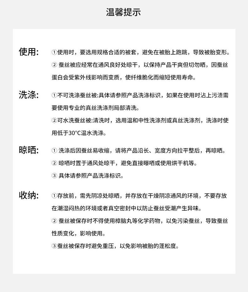 货 号 :HDB-2510 面 料 :斜纹提花面料 填 充 :100 %蚕丝 规 格 :200*230cm 重 量 :4.5斤 包装尺寸 :45x58x28cm 装 箱明细 :10条/箱(礼盒平铺) 1.精选面料 : 采用斜纹提花抗 菌面料制作而成,柔软高 级; 2.优质填充 : 100 %野生蚕产出蚕丝,丝质顺滑,纯天然动物蛋白,超级亲肤,特别适合皮肤敏感的人群; 3.精致工艺 : 非遗手工工艺,每一床蚕丝被蕴含着大自然的馈赠;