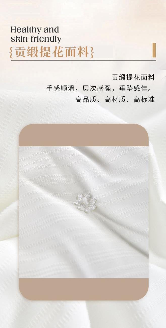 规 格:200×230(±2)cm 克 重:子被1700g 母被2200g 面 料:贡缎提花 填 充:蚕丝+木棉(500g/1000g) 贡缎提花面料,手感顺滑,层次感强,垂坠感佳。 宽边设计,细节处理,被子更大气。 子母被设计,使用更多样;高品质、高材质、高标准,一款对生活高度负责的产品