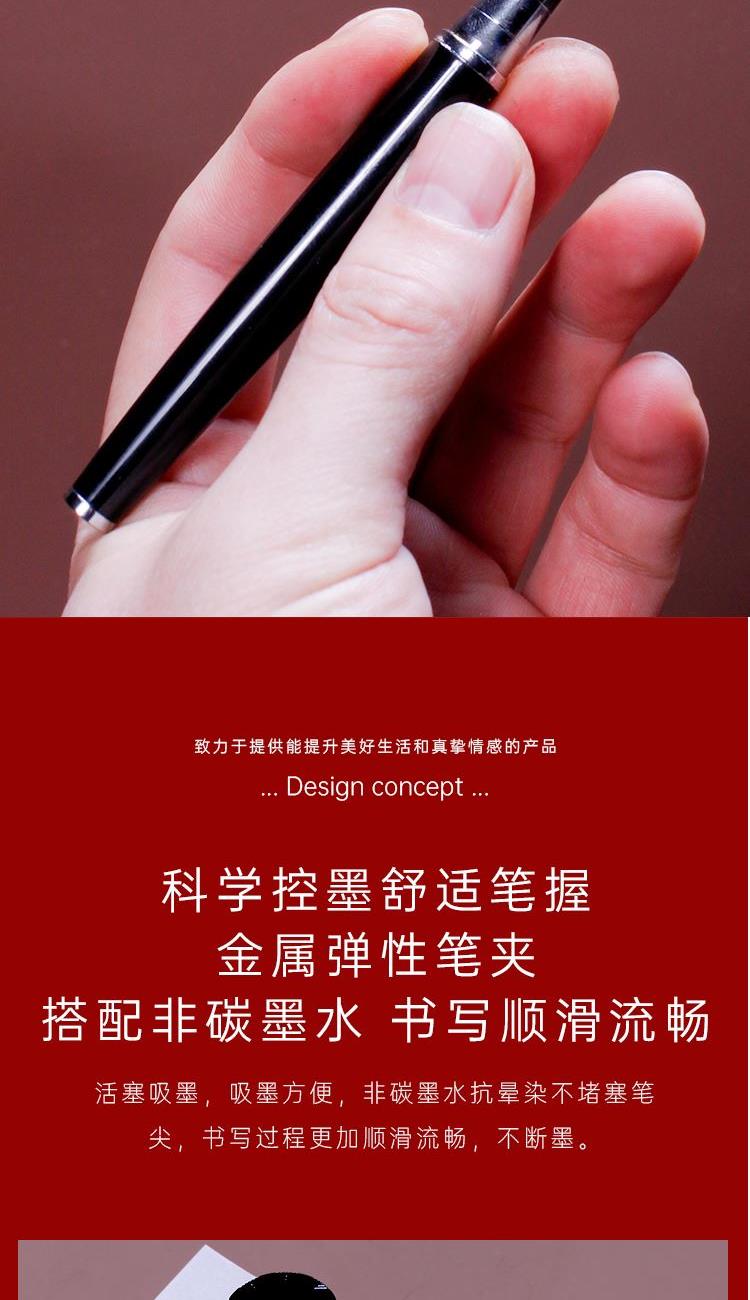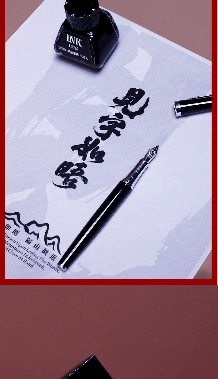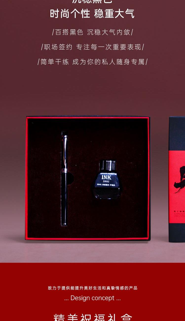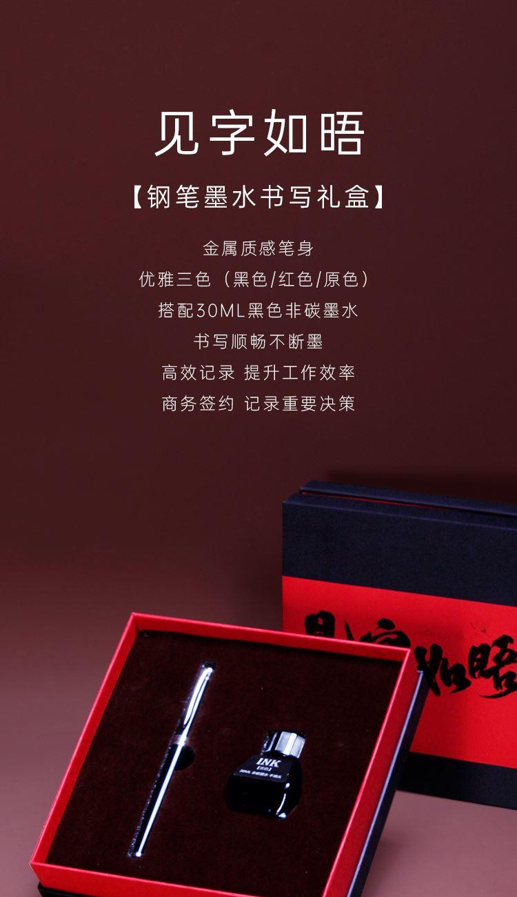 配置 见字钢笔*1 墨水*1瓶-30ml 手提袋套*1 精装礼盒*1 材质 金属 定制工艺 腰封硫酸纸印刷定制-钢笔激光镭雕工艺 尺寸 礼盒:190*190*45mm 书写美好的思念 适用场景 企业定制礼品-私人礼赠-练字学习-校园文创