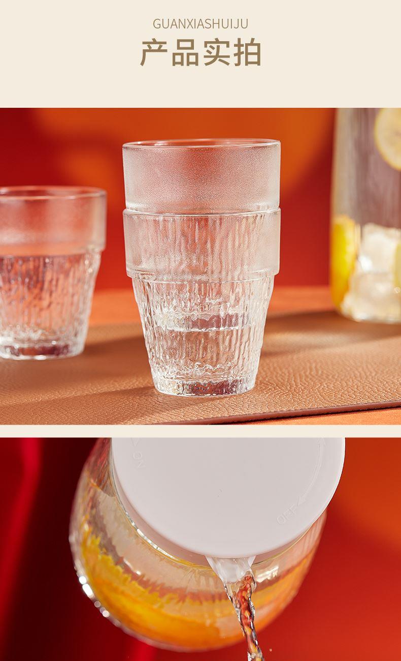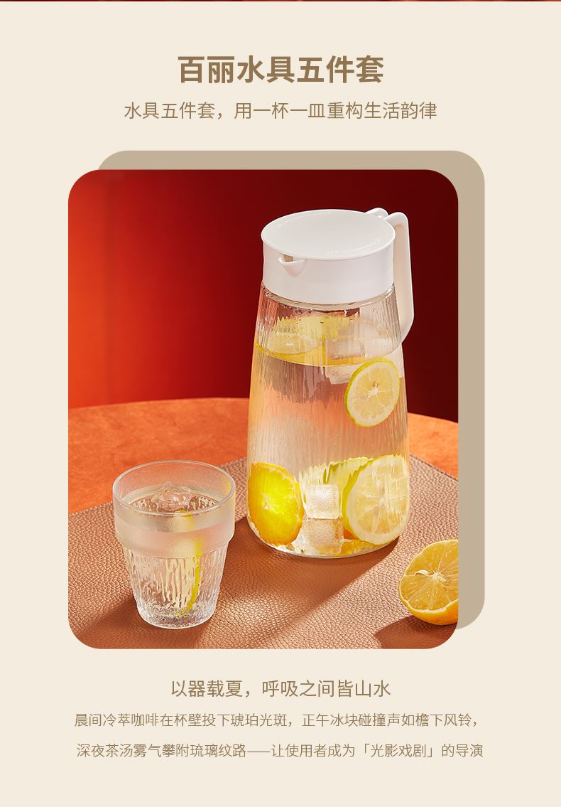 货 号:BL-SJ/L5 适用温度:0°C-60°C 产品参数:壶1200ml*1、杯200ml*4 材 质:高白料钠钙玻璃,食品级硅胶,食品级pp 彩盒尺寸:330*116*224mm 外箱尺寸:60.2*34.4*46.6cm 产品卖点:1.产品采用高白料钠钙玻璃材质,不易残留细菌易清洗,无异味,防腐蚀。2.玻璃水壶搭配可叠杯组合时尚设计、实用与空间节省理念 鹰嘴出水口设计,防尘防漏。3.分体壶盖加水更方便,大口径方便清洗,加宽把手结实防烫。