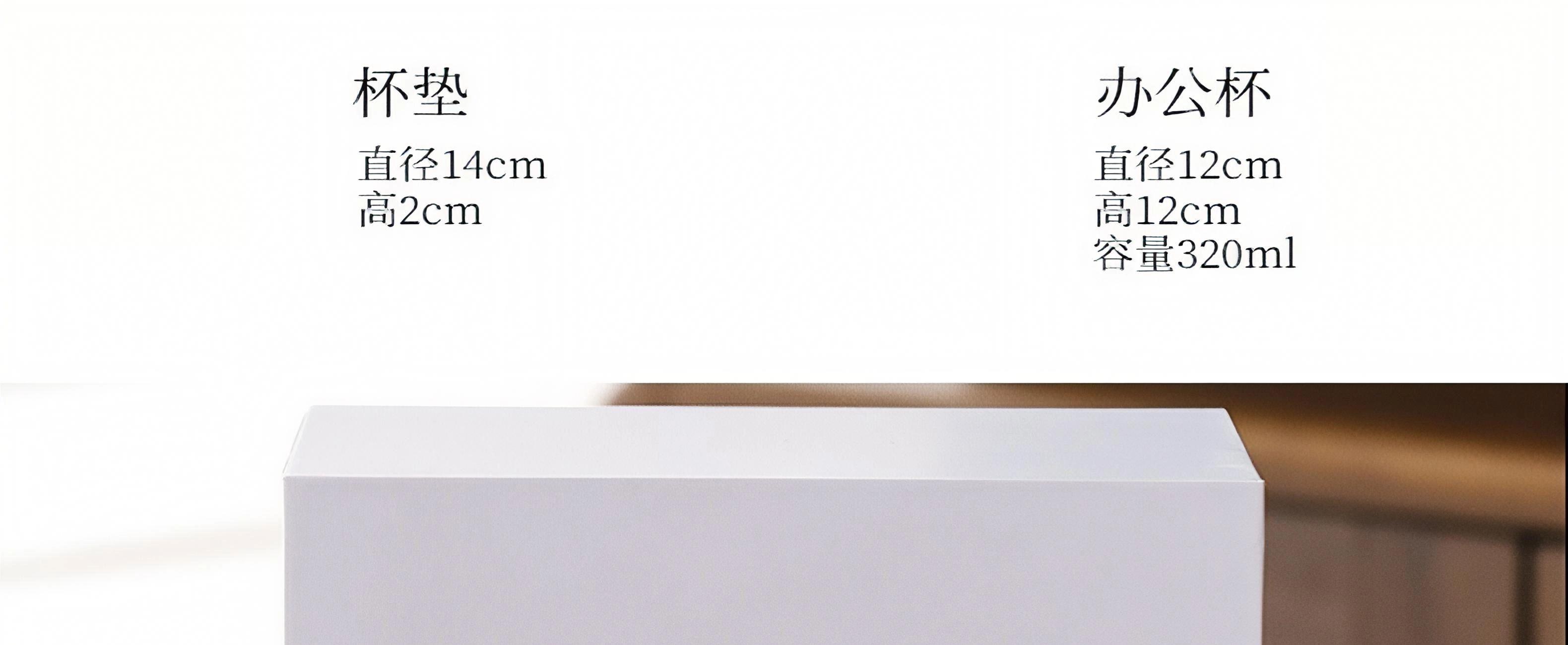 配置:陶瓷杯*1,杯碟*1. 办公杯直径12cm 高12cm 容量320m1, 杯垫:直径14cm 高2cm, 礼盒:长17.5cm 宽17.5cm 高13cm。