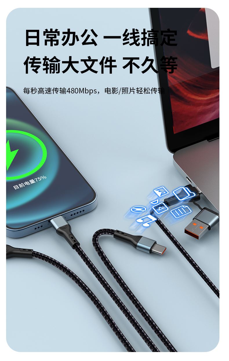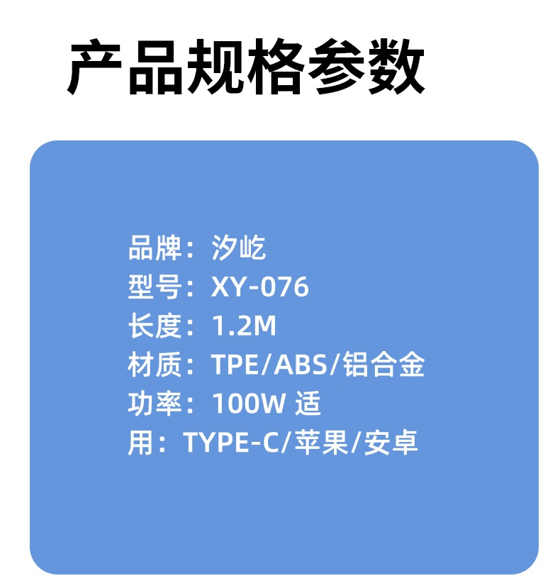 长度:1.2M 材质:TPE/ABS/铝合金 功率:100W 适用:TYPE-C/苹果/安卓 颜色:黑色 产品重量:约53g 产品包装尺寸:140*90*27mm(彩盒) 产品卖点:Type-c接口支持快充, TPE环保材质,防缠绕,耐拉伸,经久耐用,加固接头,广泛兼容,适用市面绝大多数手机。