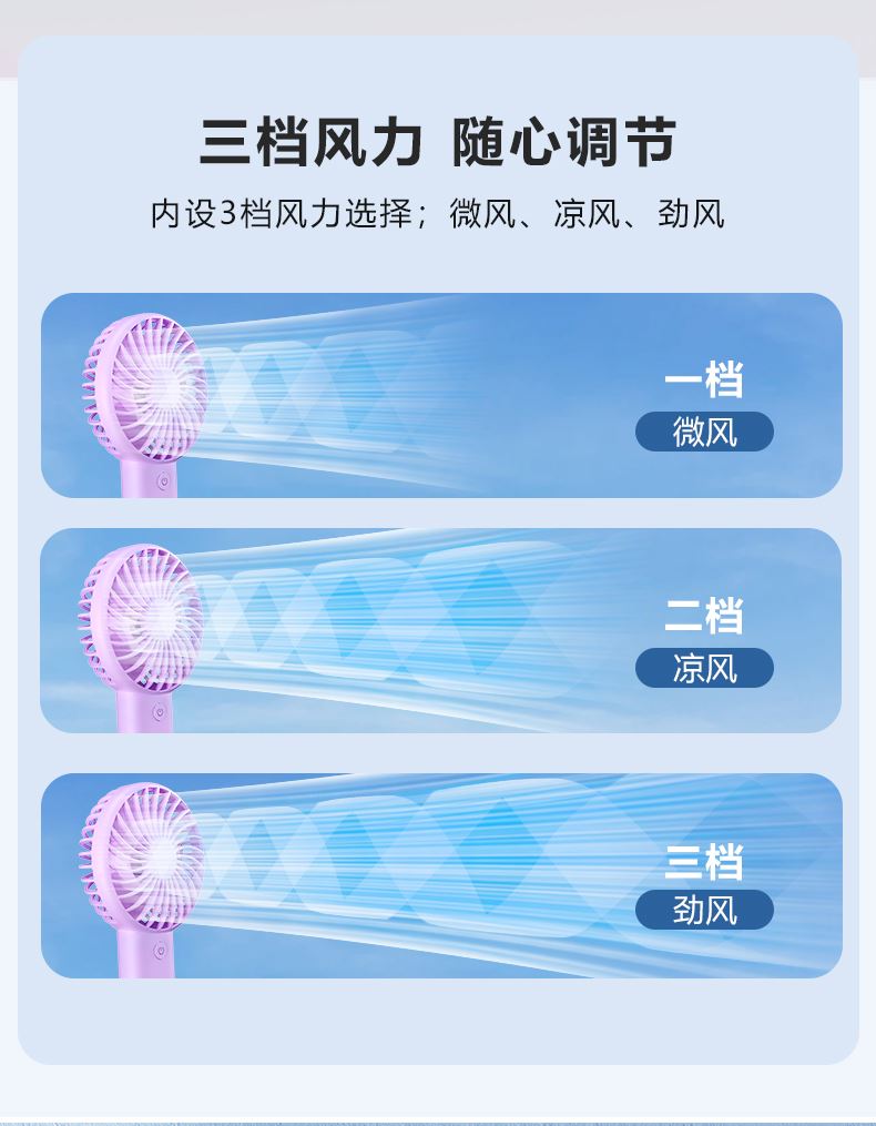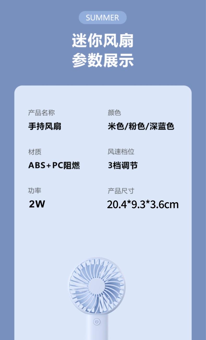 产品颜色:白色 天蓝 紫色 产品尺寸:9.3*3.6*20.4cm 产品材质:ABS+电子元件 输入电流:5V/1A 电池容量:1200mAh 功 率:2W 使用时间:3-8小时 产品重量:110g