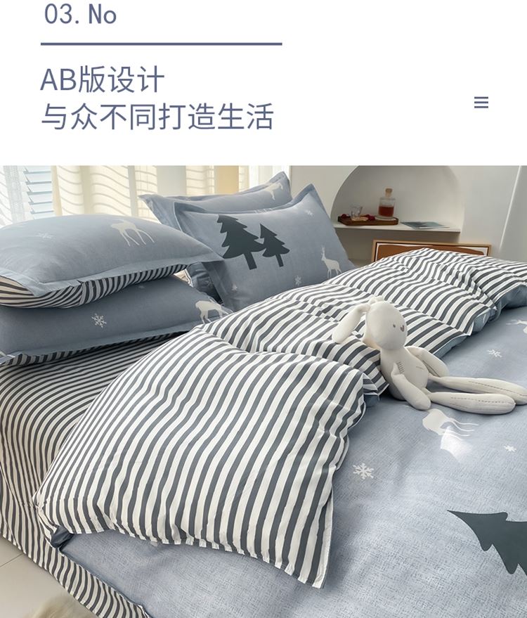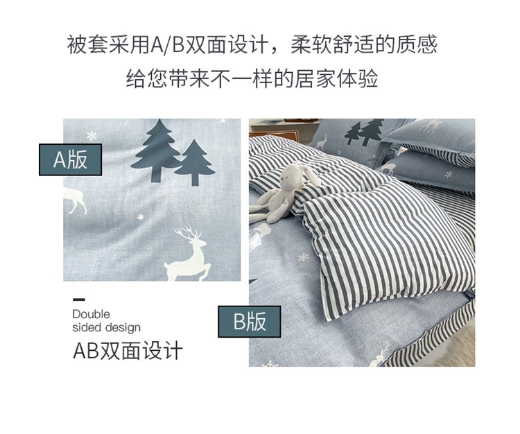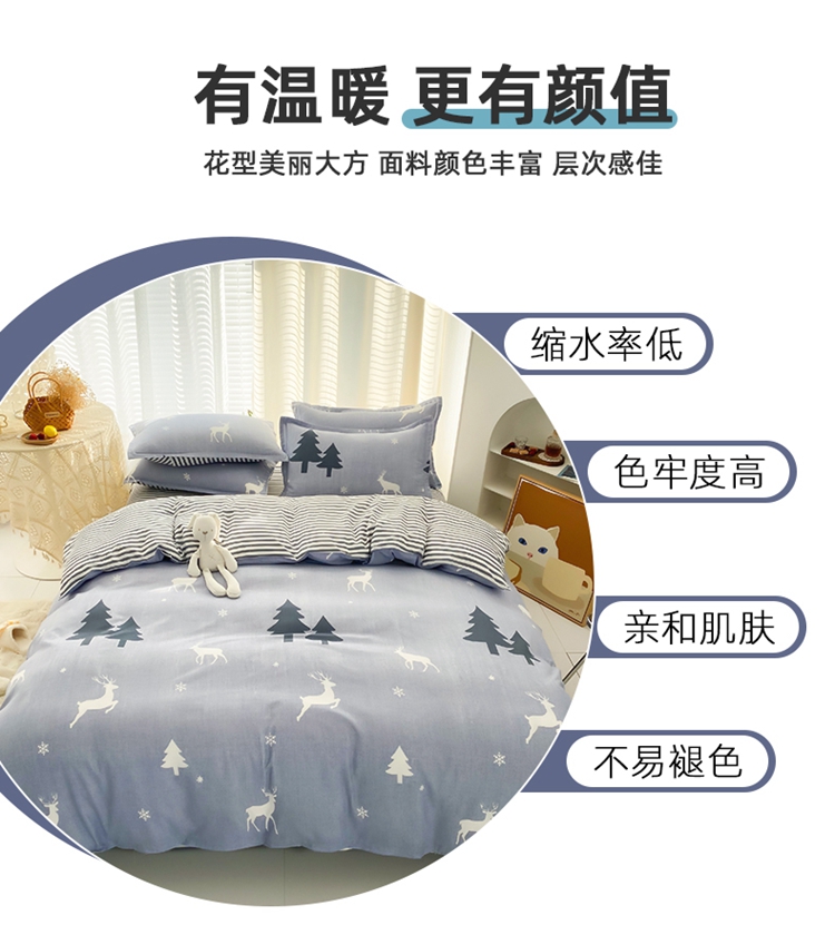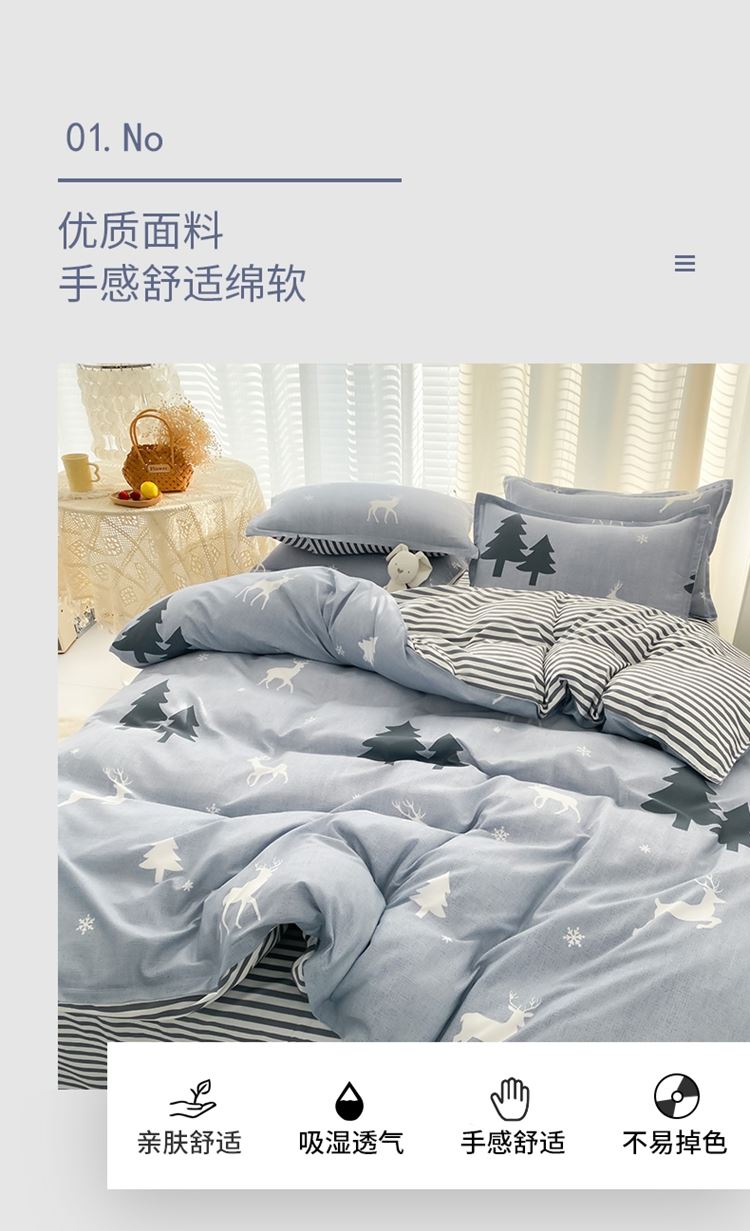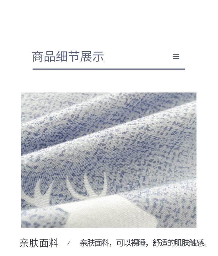 面 料 :亲肤棉 规 格 :被套*1:200*230cm 床单*1:230*230cm 枕套*2:48*74cm 产品毛重 :1300g 包装:礼袋
