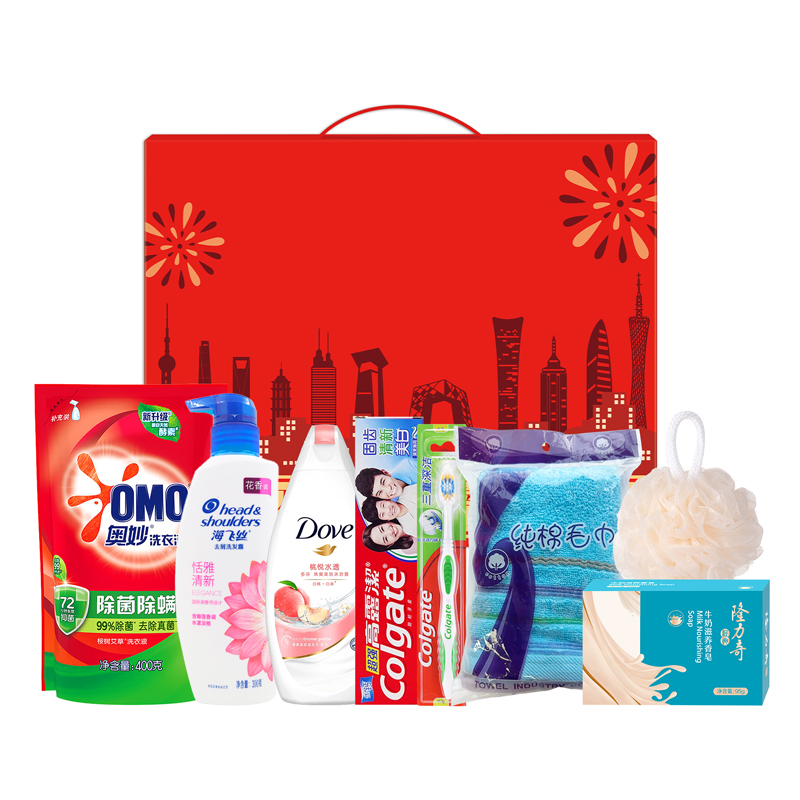 礼盒尺寸:32*8.5*24.5cm 包装尺寸:66*46.5*51CM 产品配置:(香型随机) 海飞丝洗发水300ml 多芬沐浴露300ml 奥妙洗衣液400g 隆力奇香皂95g 高露洁牙膏90g 高露洁牙刷 三重深洁 纯棉毛巾73*33cm 沐浴球