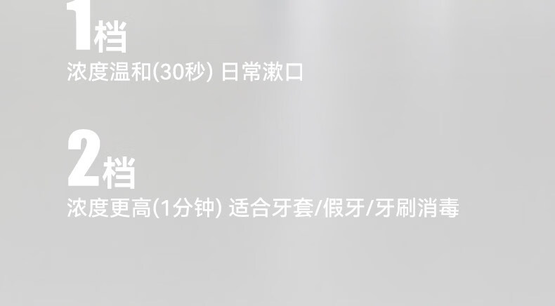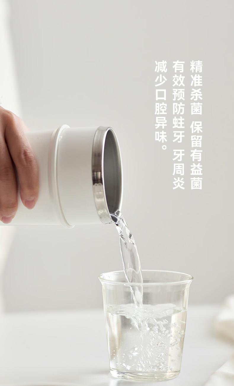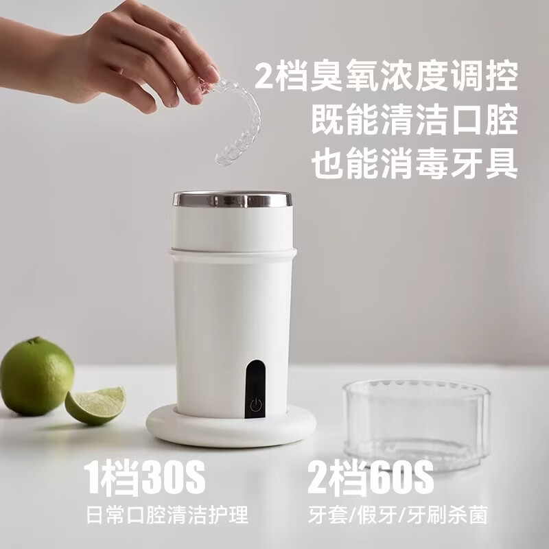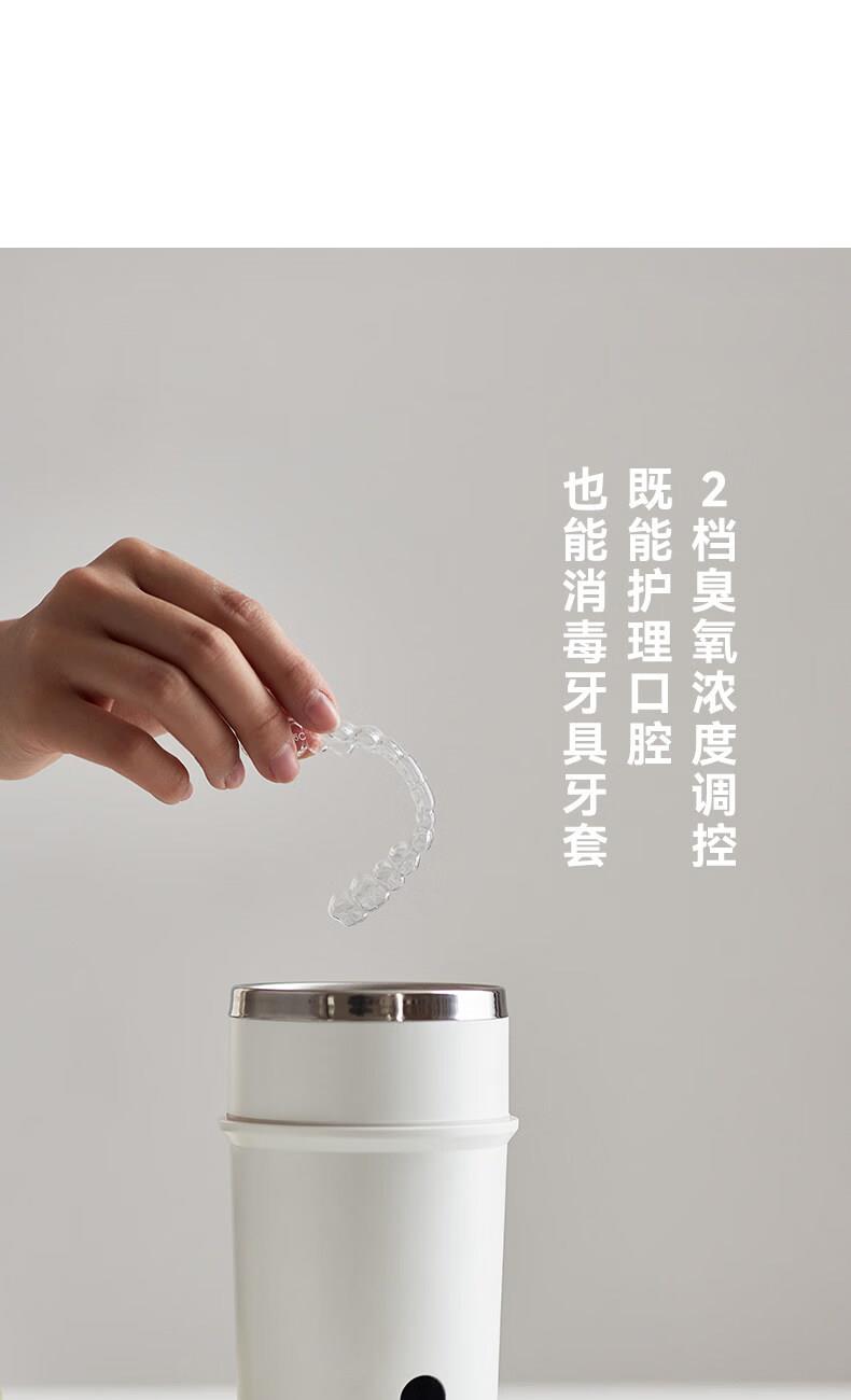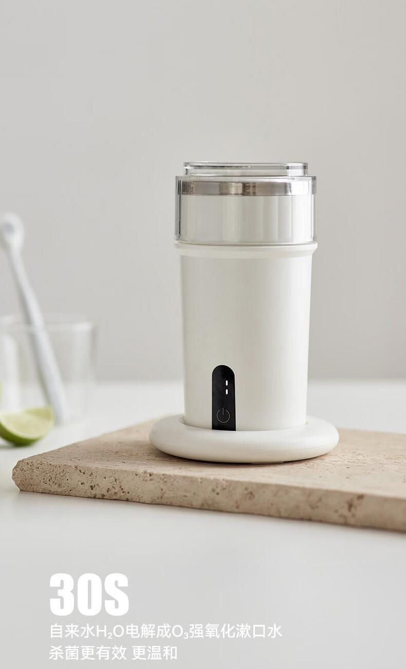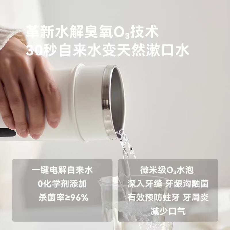 颜色:陶白色 毛重:0.85kg 容量:300ml 额定功率:5W 电池容量:1200mAH 产品尺寸:115.4*177mm(含底座) 包装尺寸:270*210*110mm 条码 : 6977735713175 1. 全新水解臭氧技术,0化学添加,自来水秒变安全清漱水 2. 2档臭氧浓度调控既能清洁口腔也能消毒牙具 3. 无线便携,持久续航,满电一次能用上百次