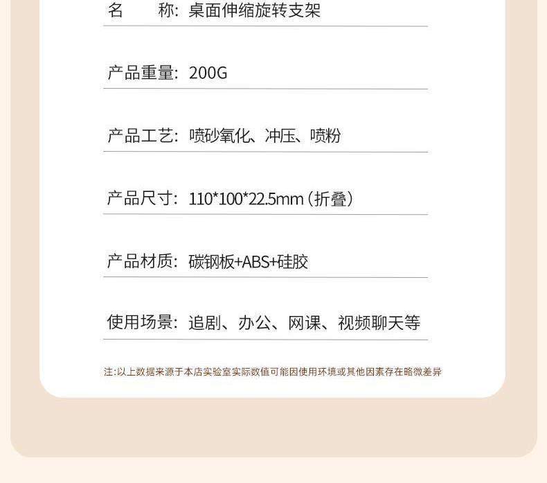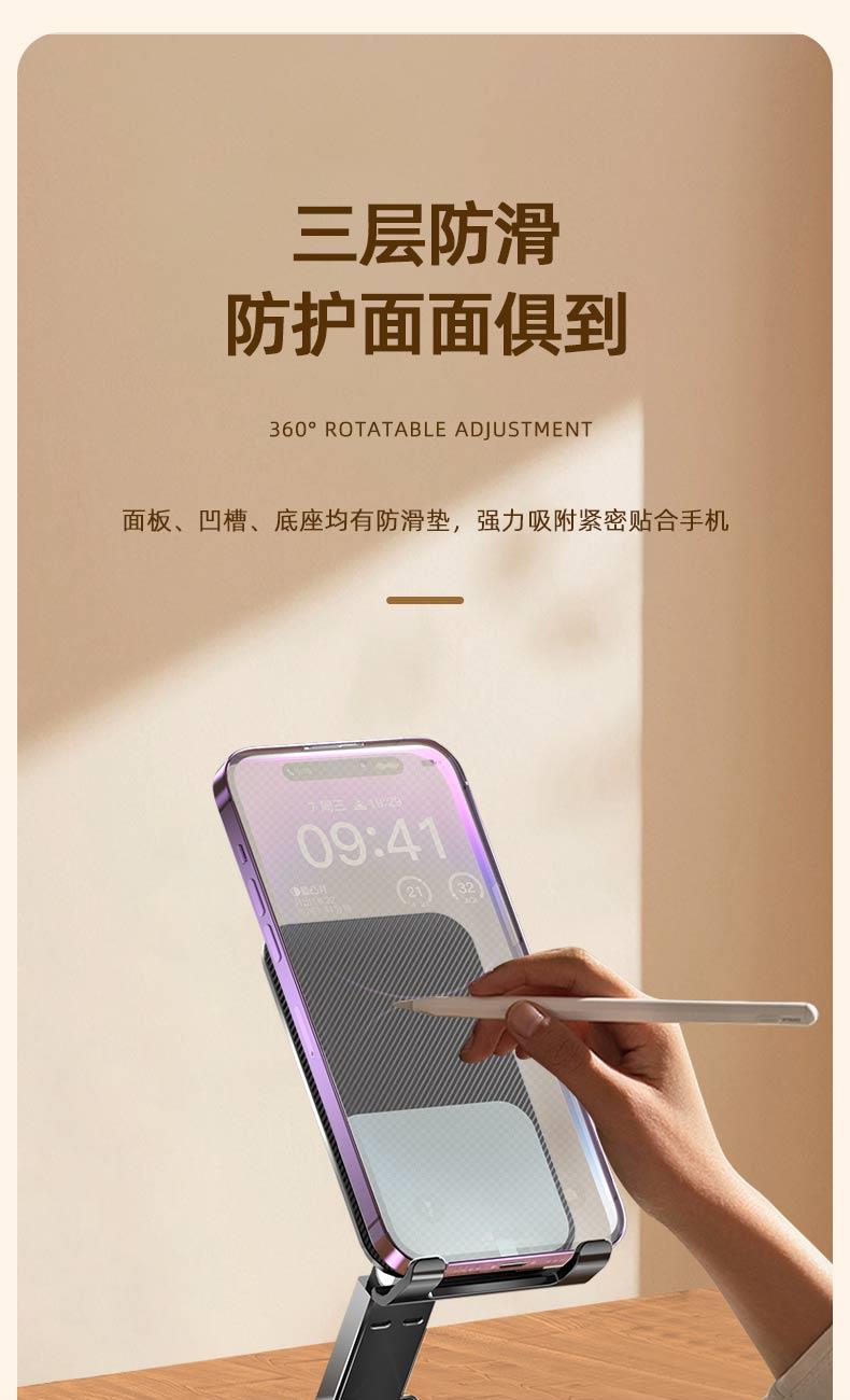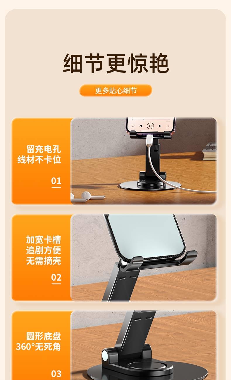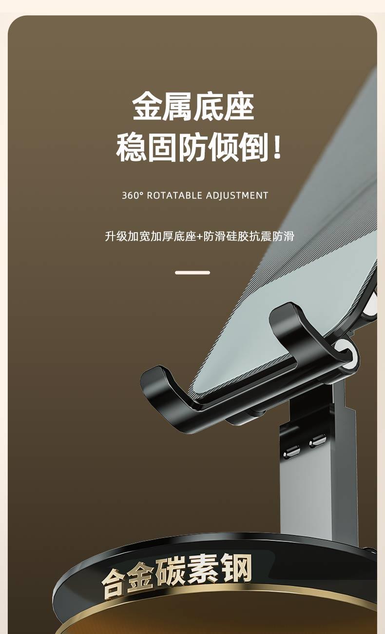 金属可旋转手机平板支架 型 号: Q10-M 产品尺寸 :110*110*22.5mm 包装尺寸 :110*102*25mm 产品净重 :188g 产品毛重 :200g 材质 :ABS+碳素钢+硅胶 颜色 :黑色,白色 【功能特点】: 金属底座更加稳固360°无死角自由旋转 手机平板均可使用一体式可折叠 硅胶防滑垫保护预留充电位,边看边充 转动自带解压滴滴声