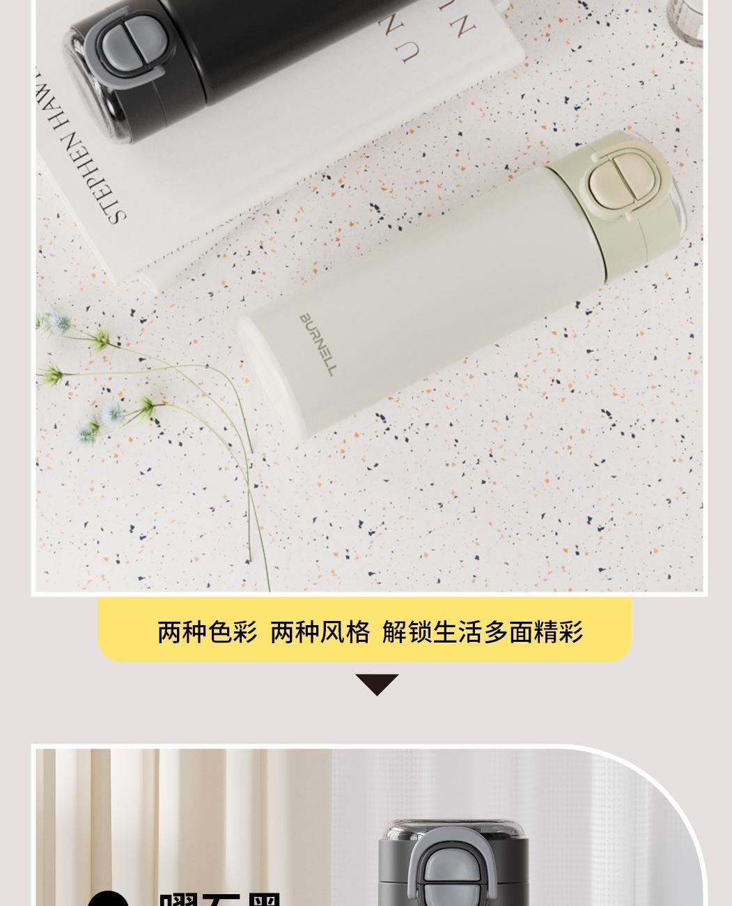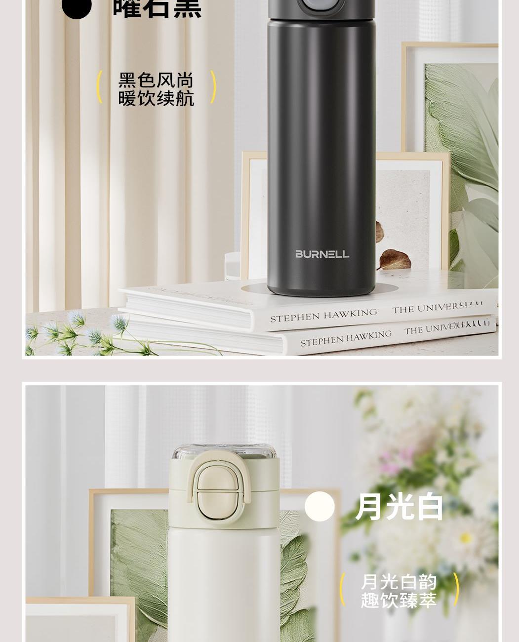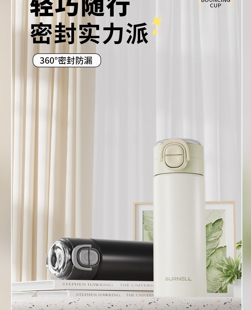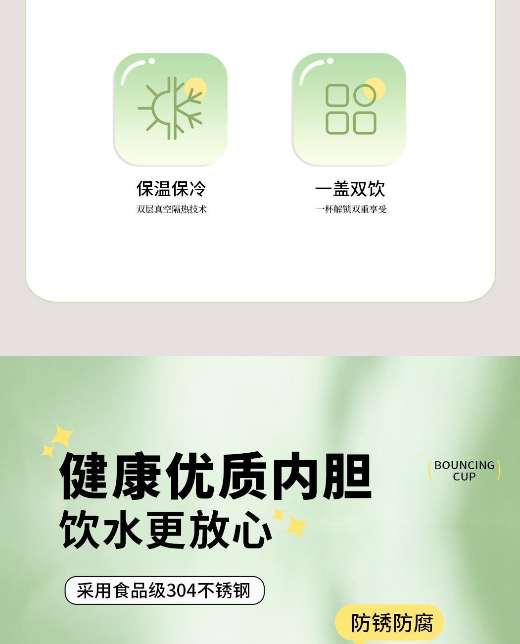 材 质:食品级pp+304不锈钢 规 格:420ml 颜 色:曜石黑、月光白 装 箱 数:40pcs/箱 材质健康:采用食品级304不锈钢材质,坚固耐用,且具有良好的防锈、防腐蚀性能,无需担心长期使用会对人体健康产生危害。 弹跳设计:独特的弹跳杯盖设计,让开合变得简单方便。用户只需轻轻一按,杯盖便可自动弹开,单手操作更为便捷,尤其适合驾车或运动过程中使用。 保温保冷:具备良好的保温保冷功能,采用双层真空隔热技术,能有效保持液体的温度。无论是夏天想喝上一杯冰凉的冷饮,还是冬天想来上一杯热茶,这款保温杯都可以长时间保持液体的温度。