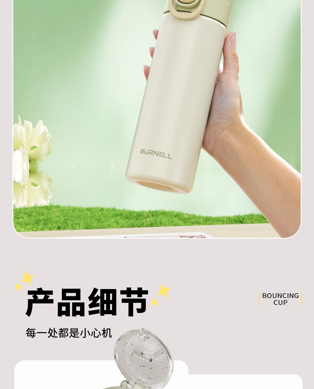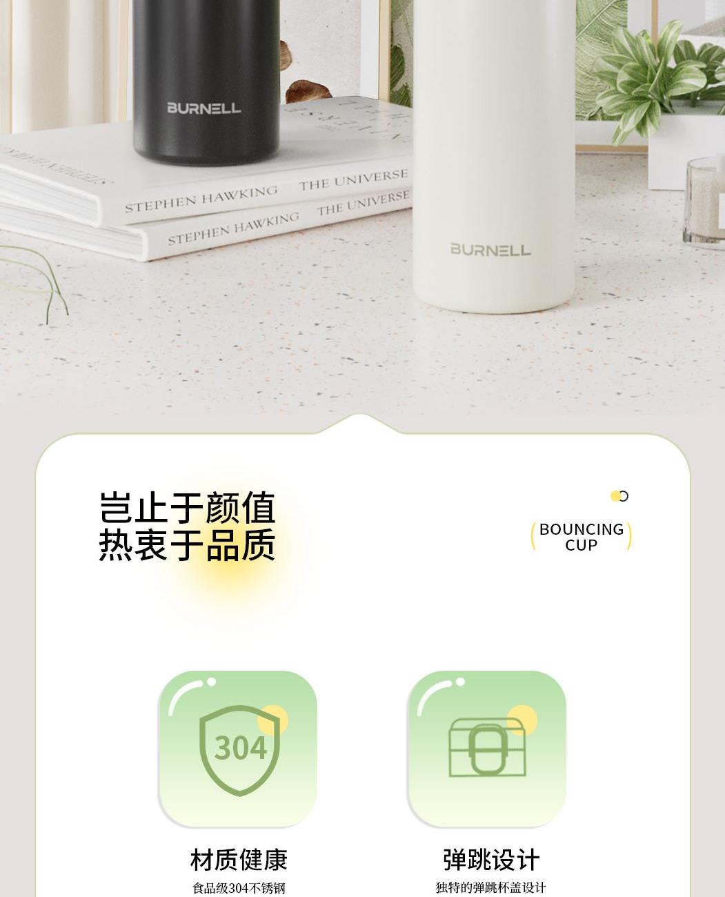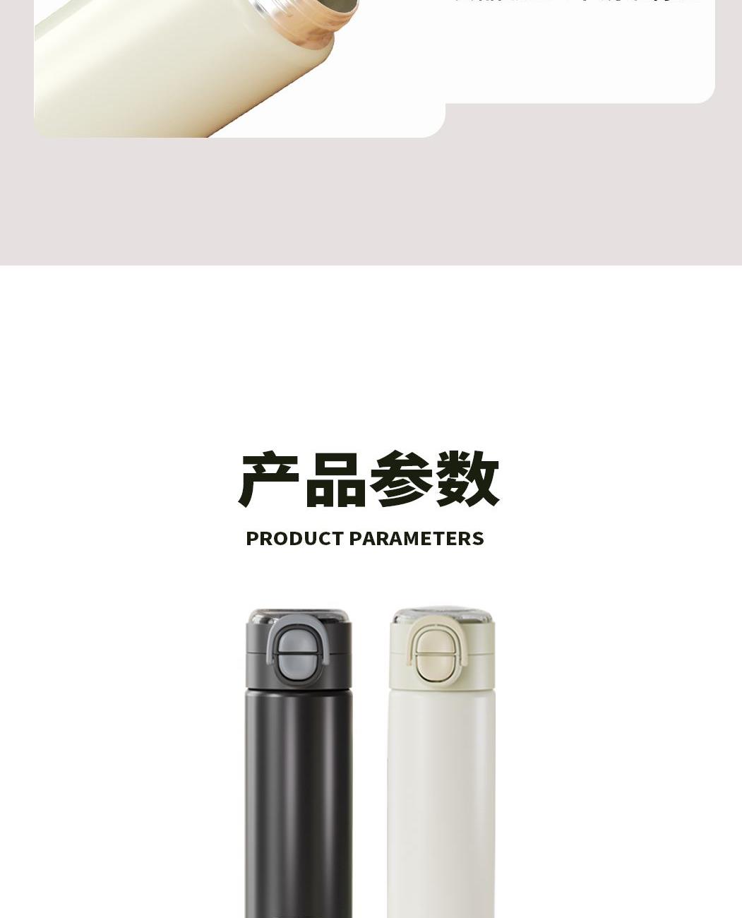 材 质:食品级pp+304不锈钢 规 格:420ml 颜 色:曜石黑、月光白 装 箱 数:40pcs/箱 材质健康:采用食品级304不锈钢材质,坚固耐用,且具有良好的防锈、防腐蚀性能,无需担心长期使用会对人体健康产生危害。 弹跳设计:独特的弹跳杯盖设计,让开合变得简单方便。用户只需轻轻一按,杯盖便可自动弹开,单手操作更为便捷,尤其适合驾车或运动过程中使用。 保温保冷:具备良好的保温保冷功能,采用双层真空隔热技术,能有效保持液体的温度。无论是夏天想喝上一杯冰凉的冷饮,还是冬天想来上一杯热茶,这款保温杯都可以长时间保持液体的温度。