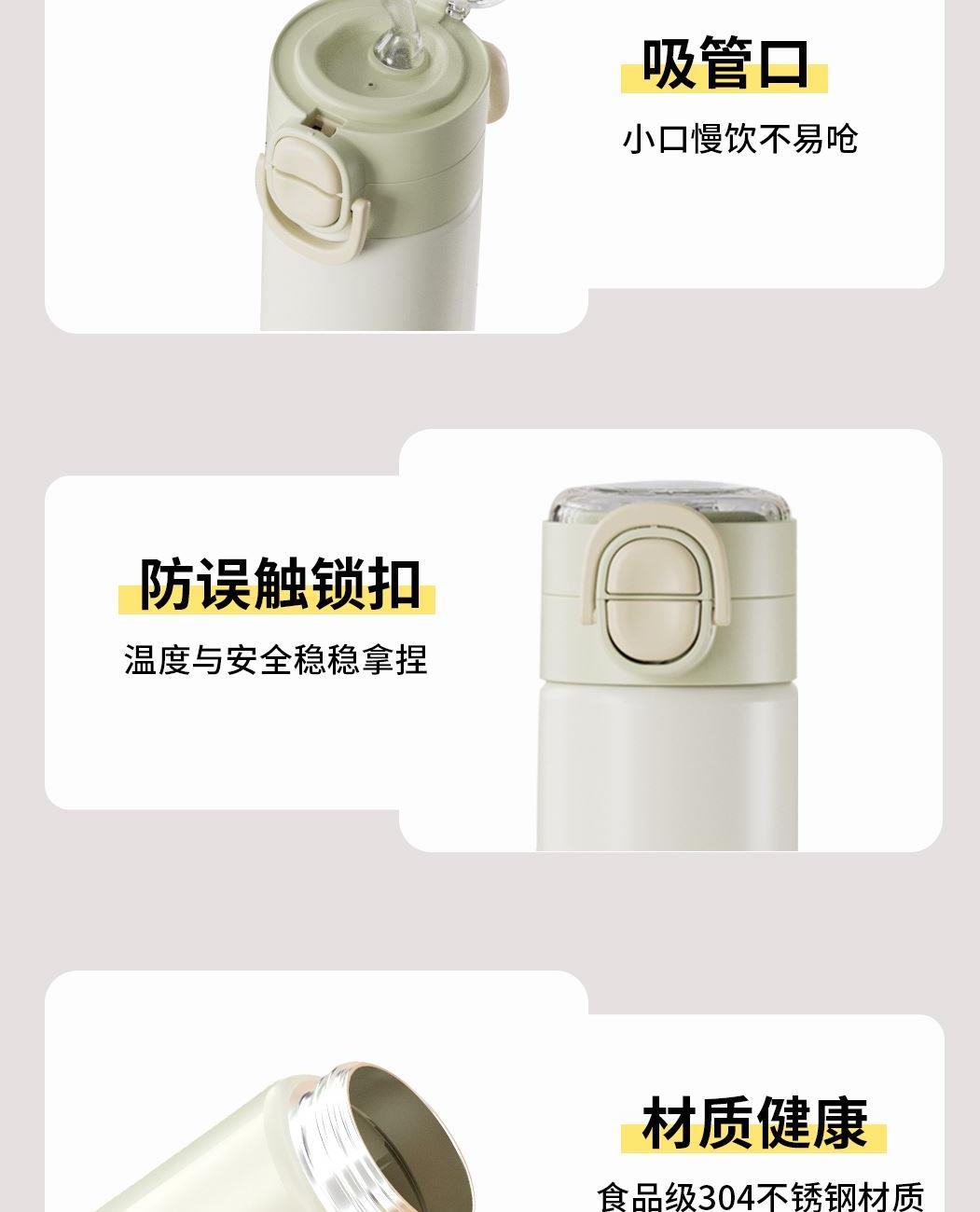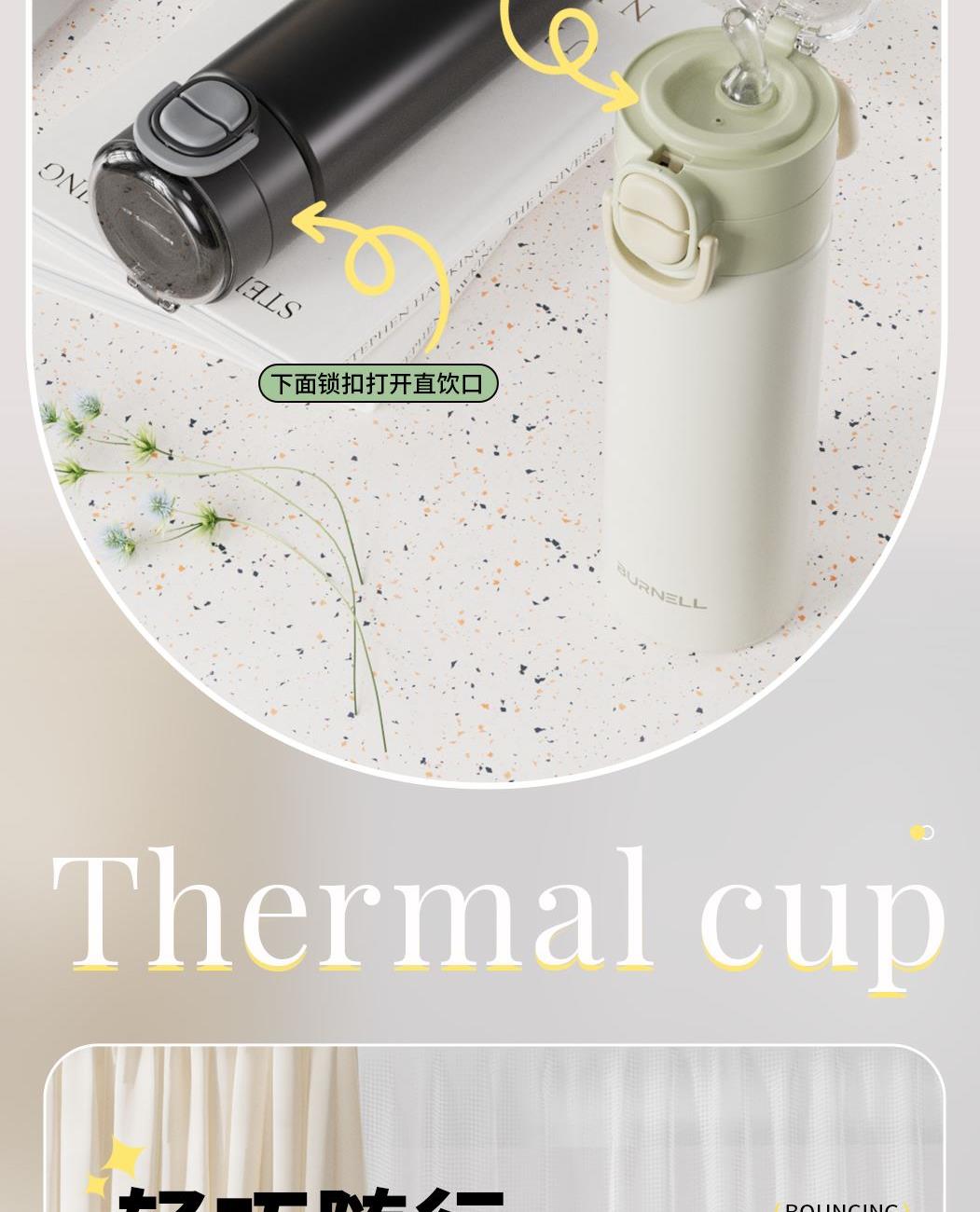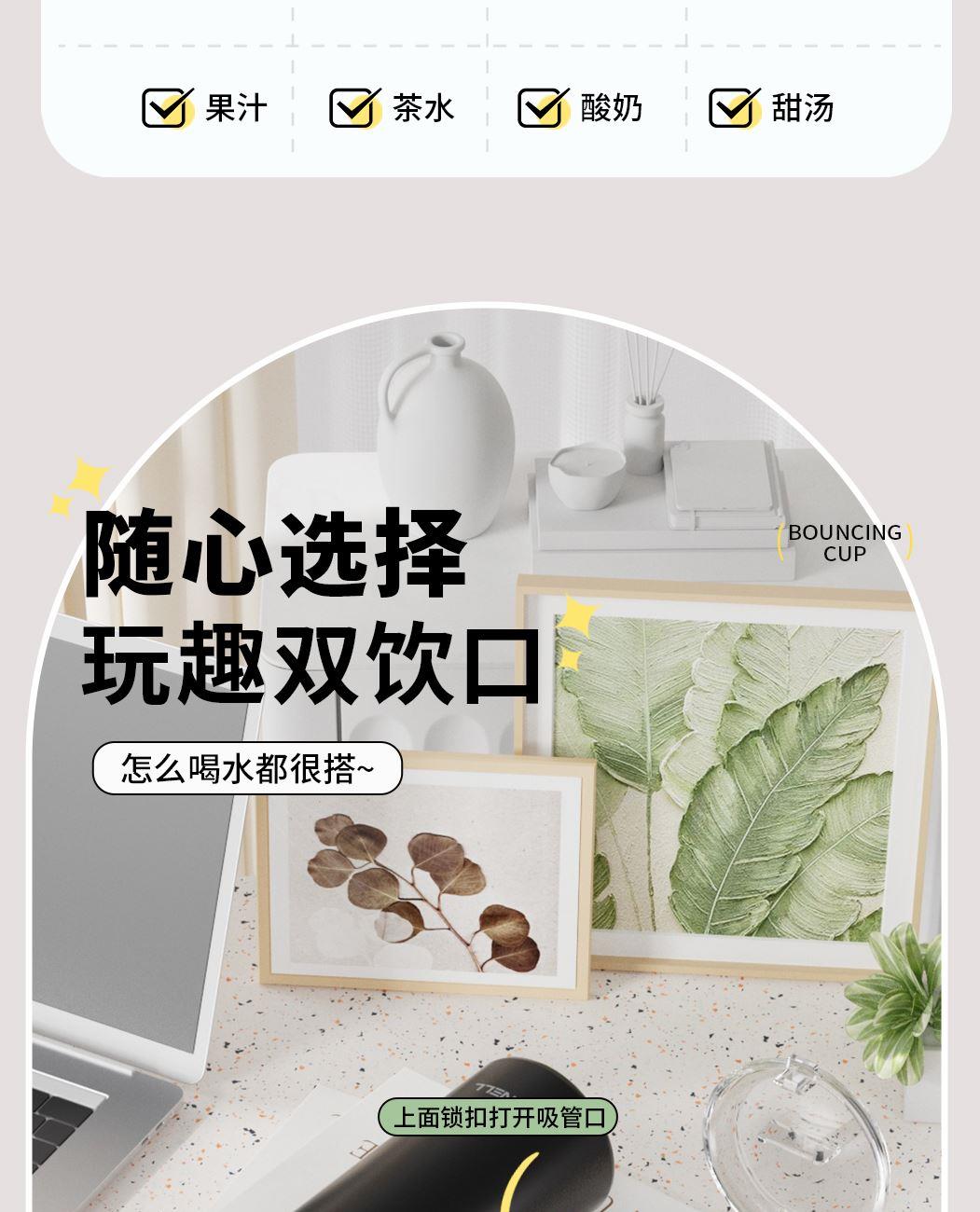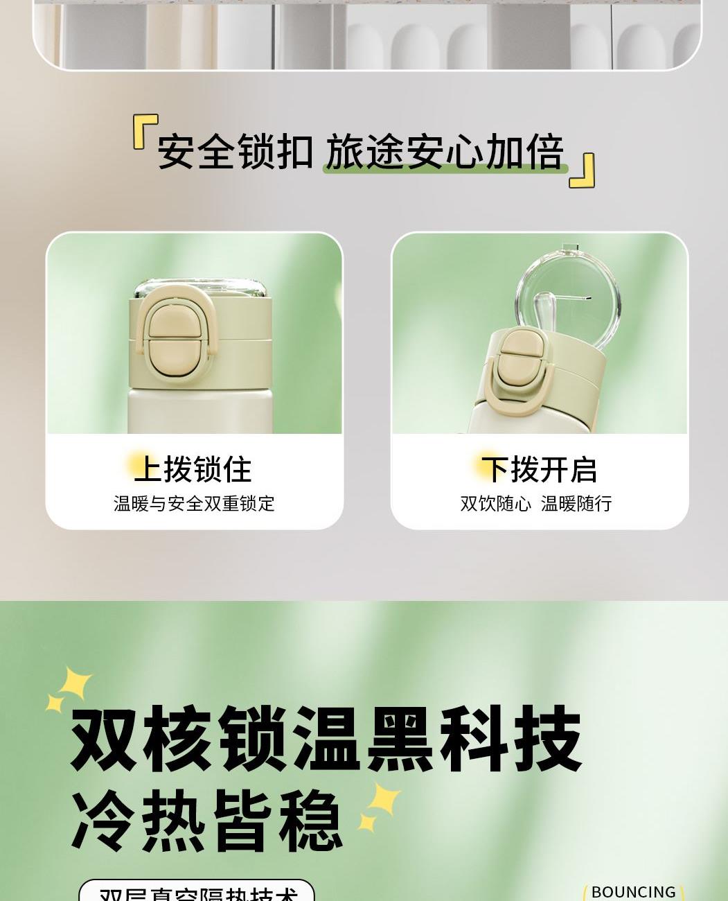 材 质:食品级pp+304不锈钢 规 格:420ml 颜 色:曜石黑、月光白 装 箱 数:40pcs/箱 材质健康:采用食品级304不锈钢材质,坚固耐用,且具有良好的防锈、防腐蚀性能,无需担心长期使用会对人体健康产生危害。 弹跳设计:独特的弹跳杯盖设计,让开合变得简单方便。用户只需轻轻一按,杯盖便可自动弹开,单手操作更为便捷,尤其适合驾车或运动过程中使用。 保温保冷:具备良好的保温保冷功能,采用双层真空隔热技术,能有效保持液体的温度。无论是夏天想喝上一杯冰凉的冷饮,还是冬天想来上一杯热茶,这款保温杯都可以长时间保持液体的温度。