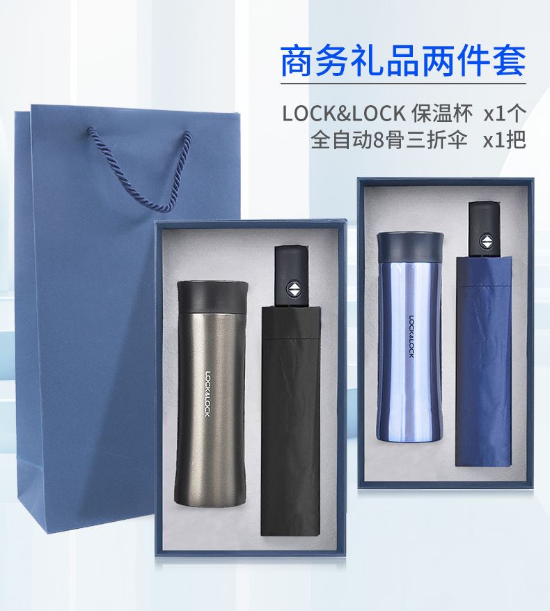 礼盒配置 : 1、型号:LHC4028 400ML LOCK&LOCK 保温杯 2、全自动8骨三折伞 尺寸:280x56mm 3、包装盒尺寸: 182x326x75mm 4、手提袋尺寸: 192x346x85mm 5、颜色:蓝色/黑色 6、重量:25kg/箱