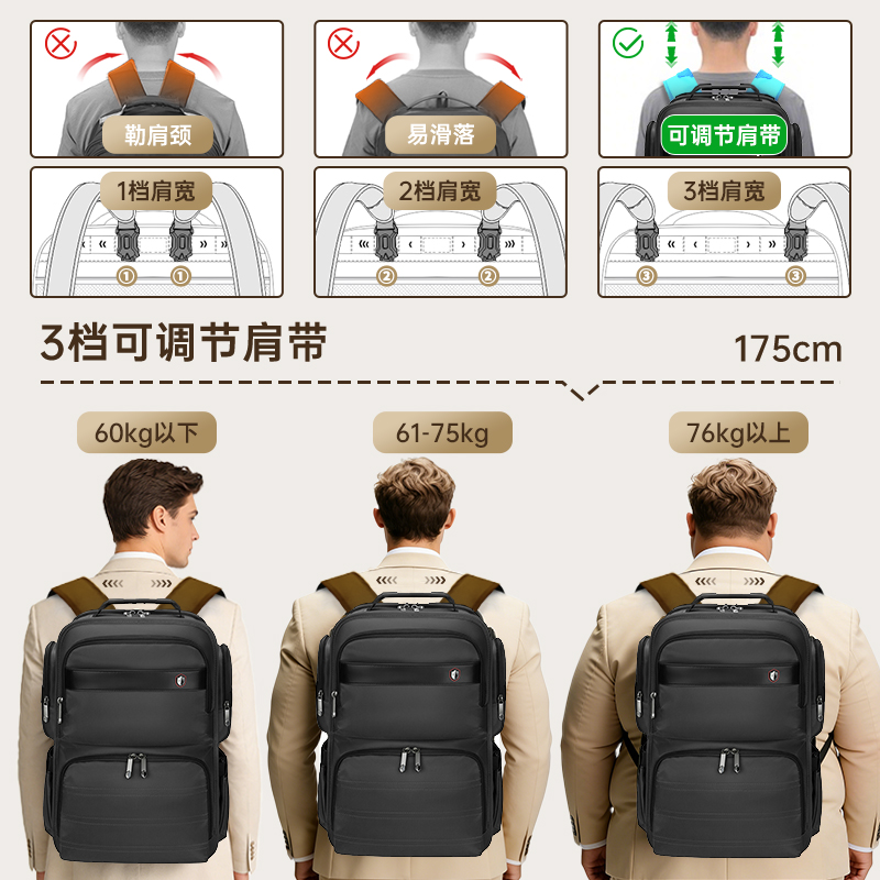 9.肩带上部三档位置调节,下部织带随意调节,带肩带固定扣.