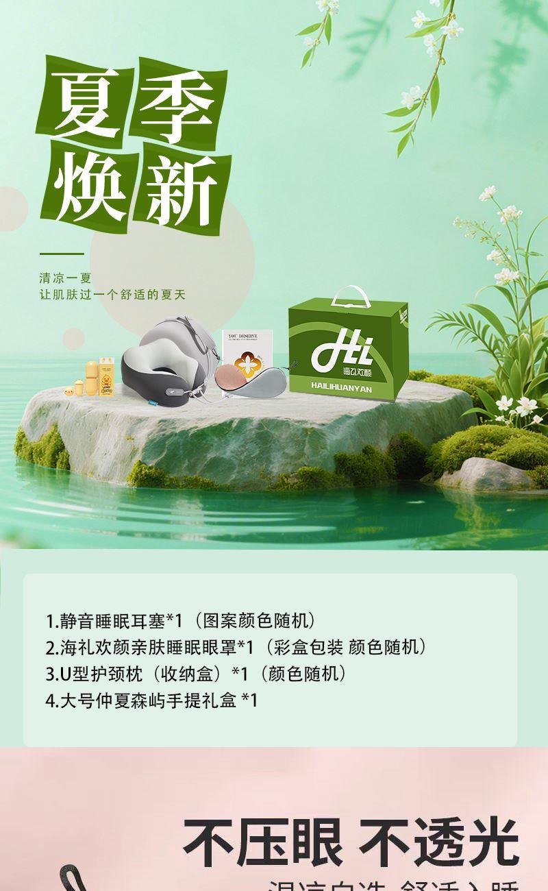 1.静音睡眠耳塞*1(图案颜色随机) 2.海礼欢颜亲肤睡眠眼罩*1(彩盒包装 颜色随机) 3.U型护颈枕(收纳盒)*1(颜色随机) 4.大号仲夏森屿手提礼盒 *1 (如图)