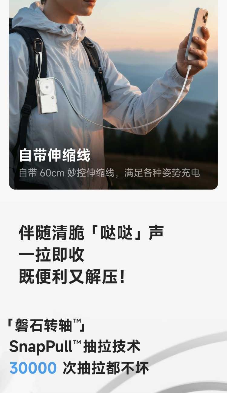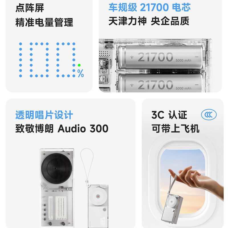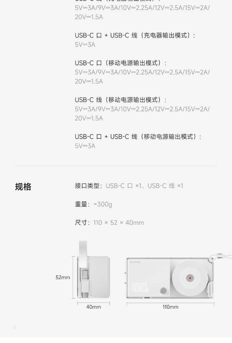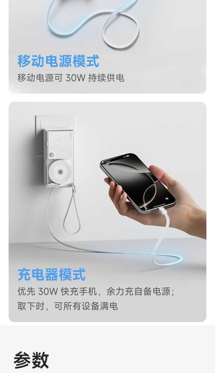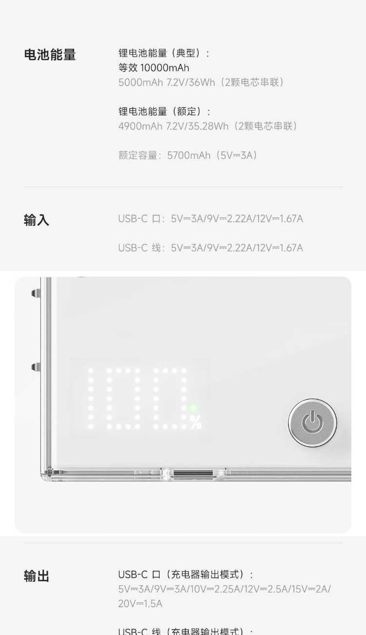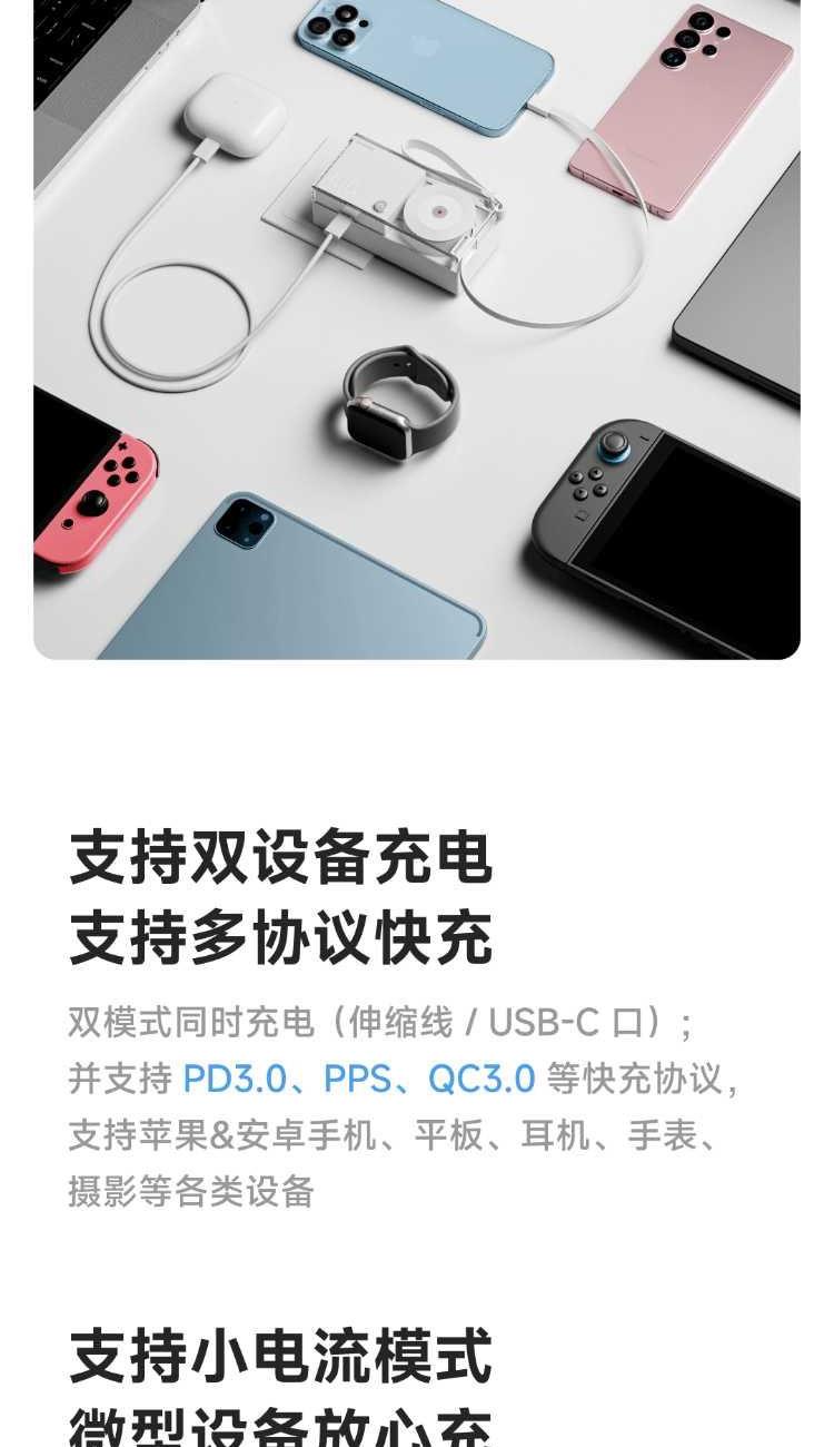 型号:P7 材质:防火PC(V0级) 容量:10000mAh 输出:30W 接口类型:USB-C口*1,USB-C线*1 产品尺寸:11*5.2*4cm (伸缩线:60+cm) 包装尺寸:14.3*8.6*5cm 单品重量:300g 10000mAh,移动电源+充电器+伸缩C线 3合1 3C认证,央企-天津力神21700车规级电芯 唱片设计,致敬博朗唱片机,点阵屏显示电量 30W双向快充,支持PD3.0/PPS/QC3.0等主流快充协议 支持小电流模式,耳机/手表/手环/电动牙刷等安全充