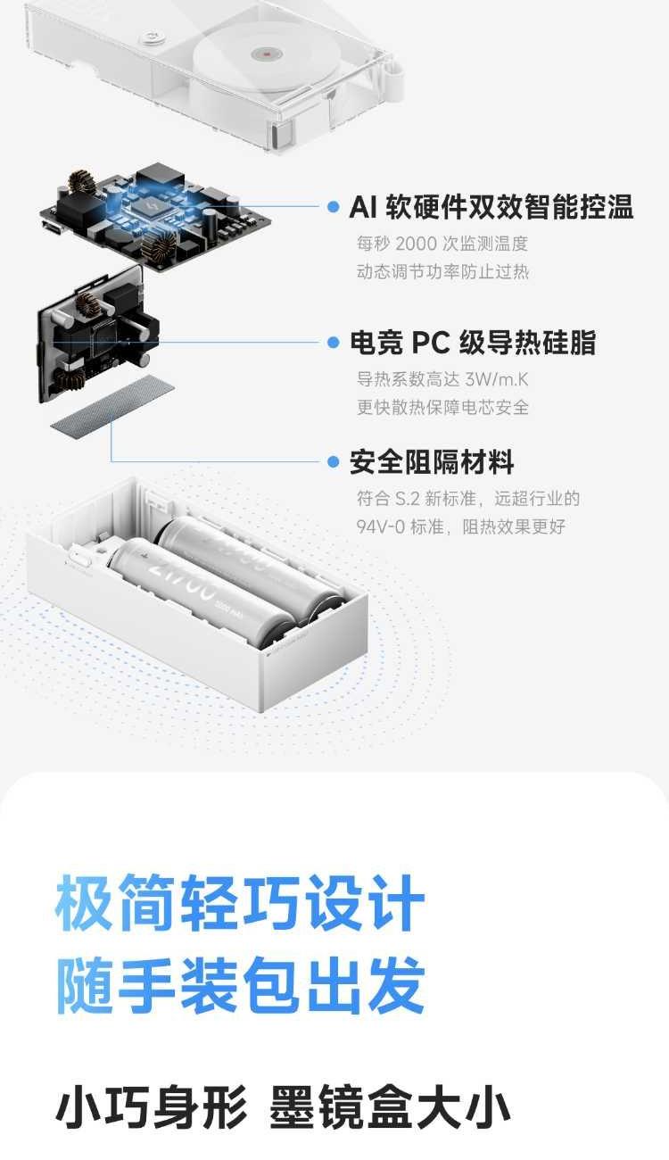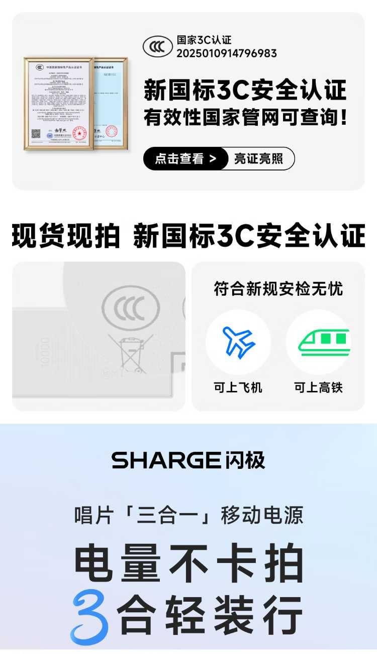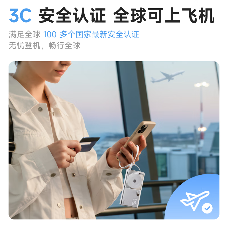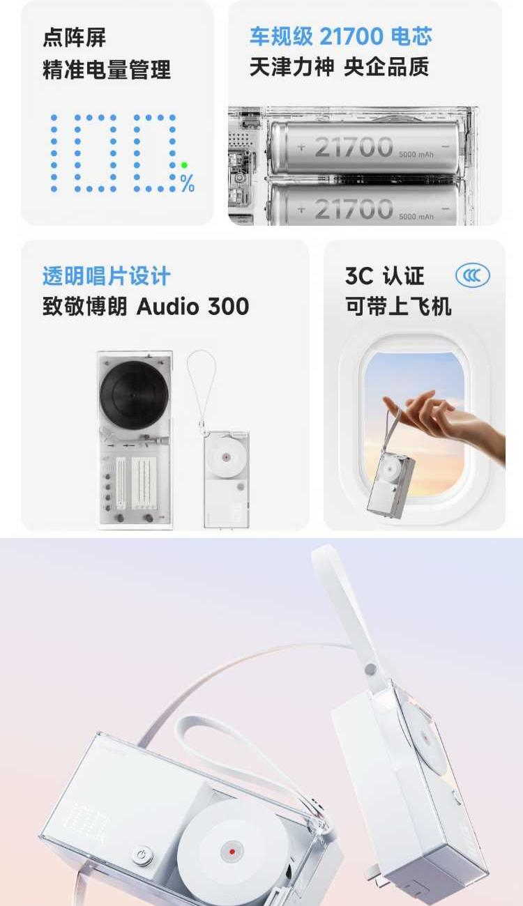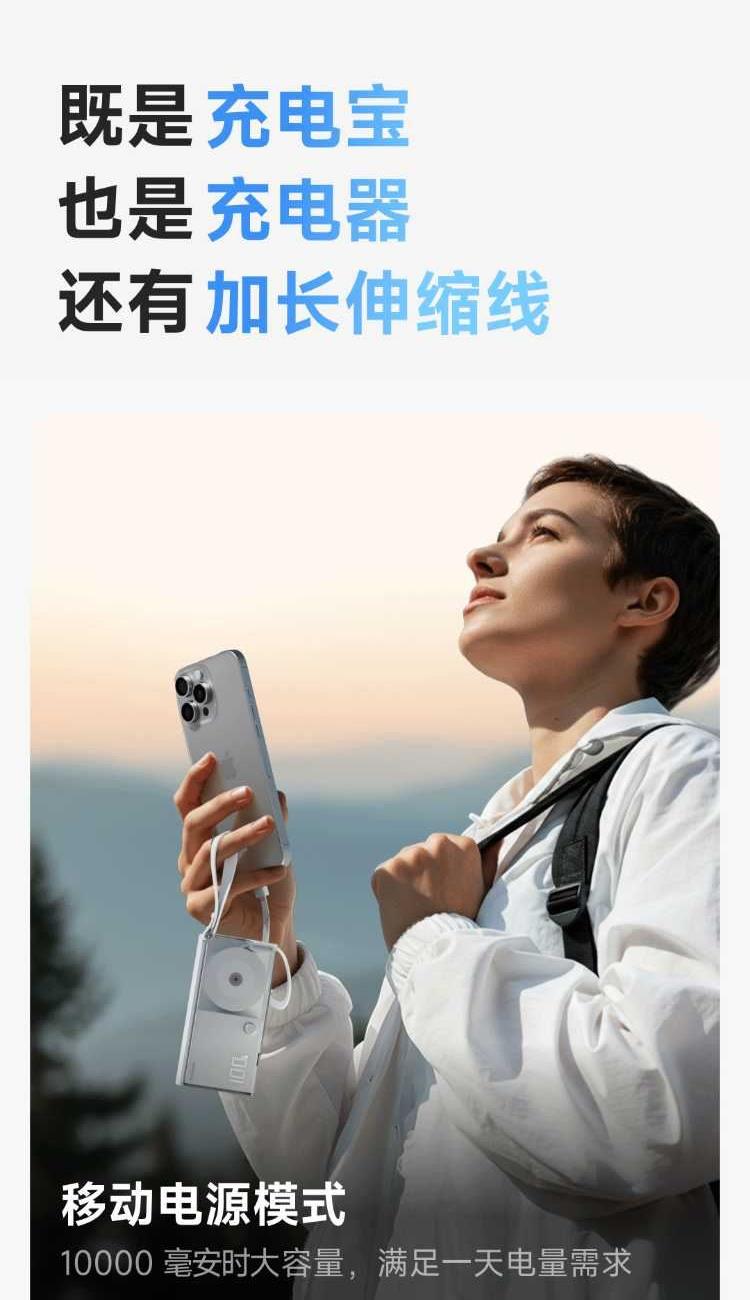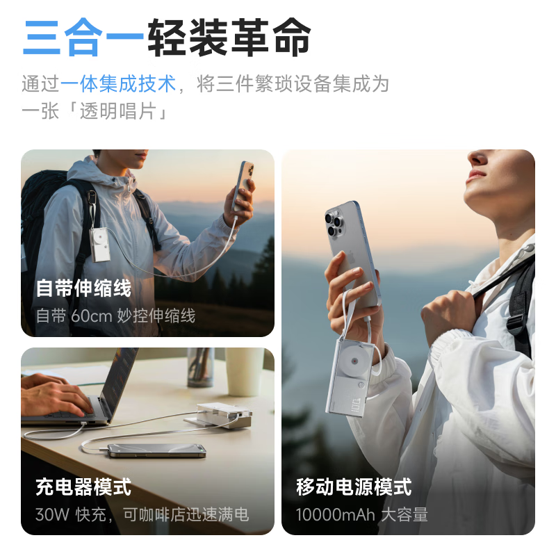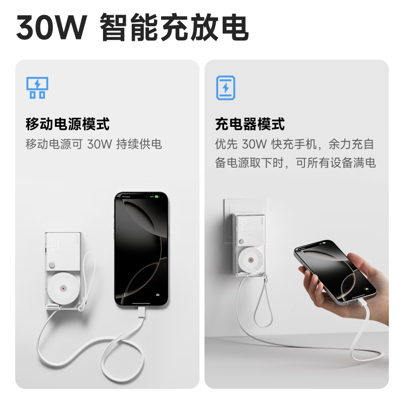 型号:P7 材质:防火PC(V0级) 容量:10000mAh 输出:30W 接口类型:USB-C口*1,USB-C线*1 产品尺寸:11*5.2*4cm (伸缩线:60+cm) 包装尺寸:14.3*8.6*5cm 单品重量:300g 10000mAh,移动电源+充电器+伸缩C线 3合1 3C认证,央企-天津力神21700车规级电芯 唱片设计,致敬博朗唱片机,点阵屏显示电量 30W双向快充,支持PD3.0/PPS/QC3.0等主流快充协议 支持小电流模式,耳机/手表/手环/电动牙刷等安全充