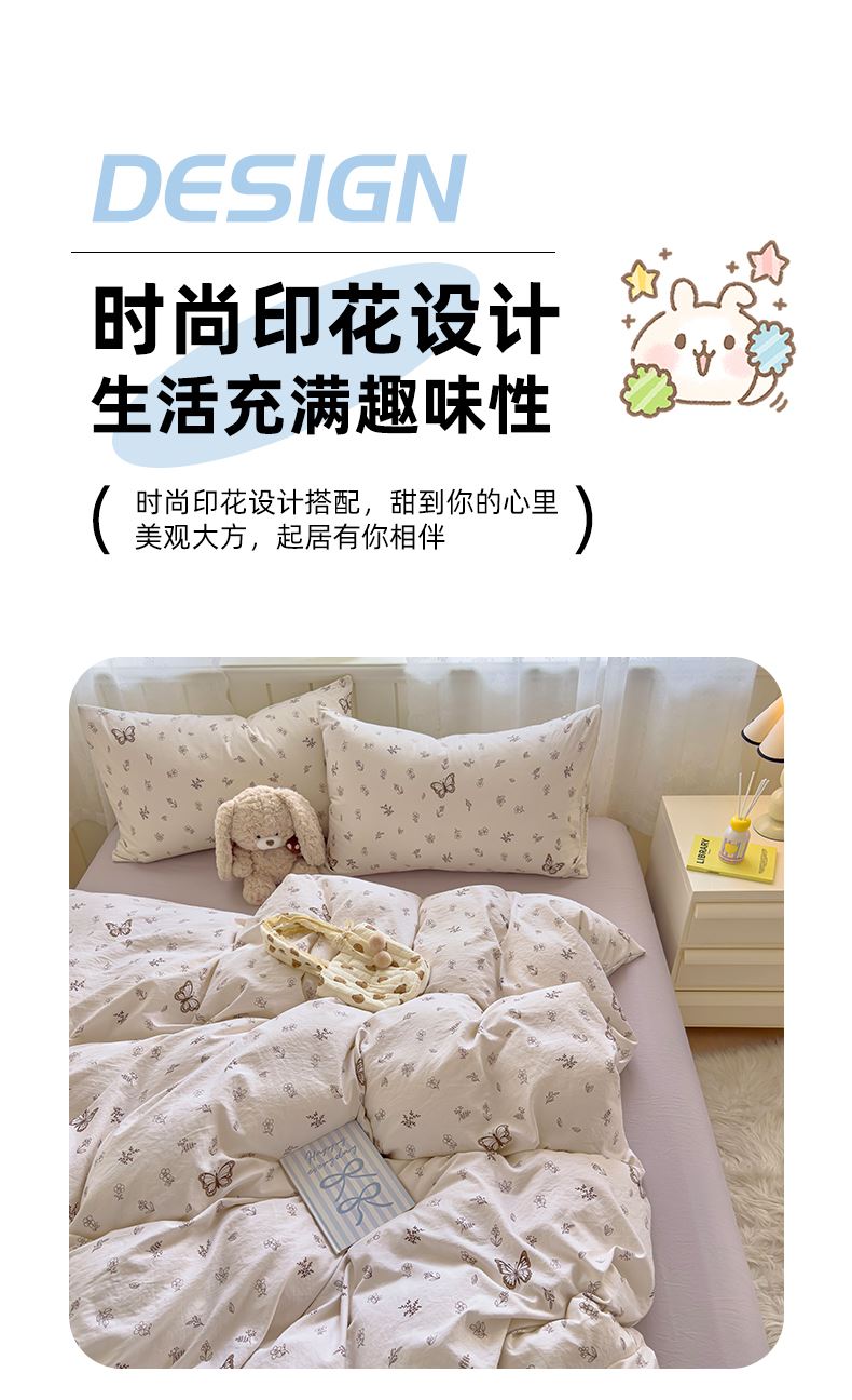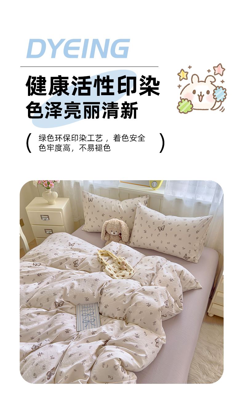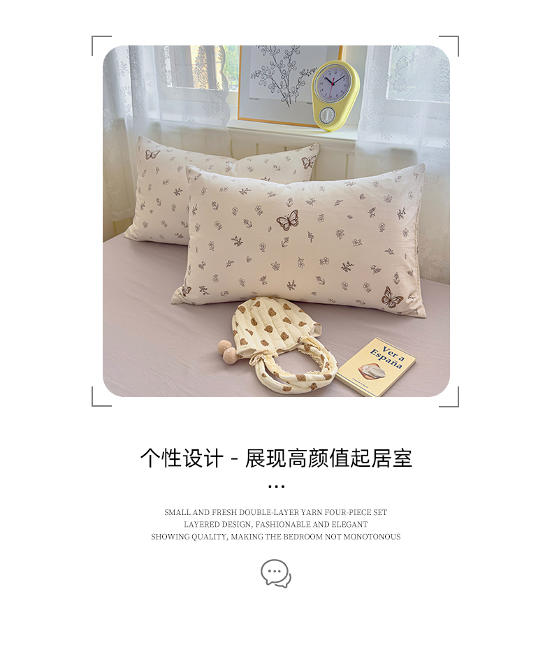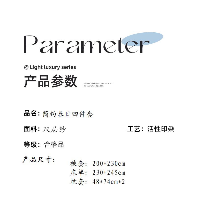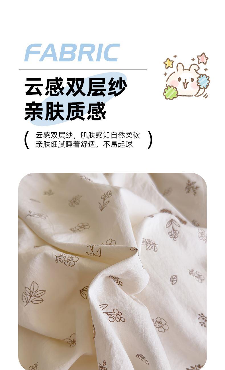 被套:200*230cm 床单:230*245cm 枕套:48*74cm*2 面料材质:双层纱 产品包装:精美礼盒 产品特点: 1.云感双层纱,肌肤感知自然柔软,亲肤细腻睡着舒适,不易起球。 2.时尚印花设计搭配,甜到你的心里,美观大方,起居有你相伴。
