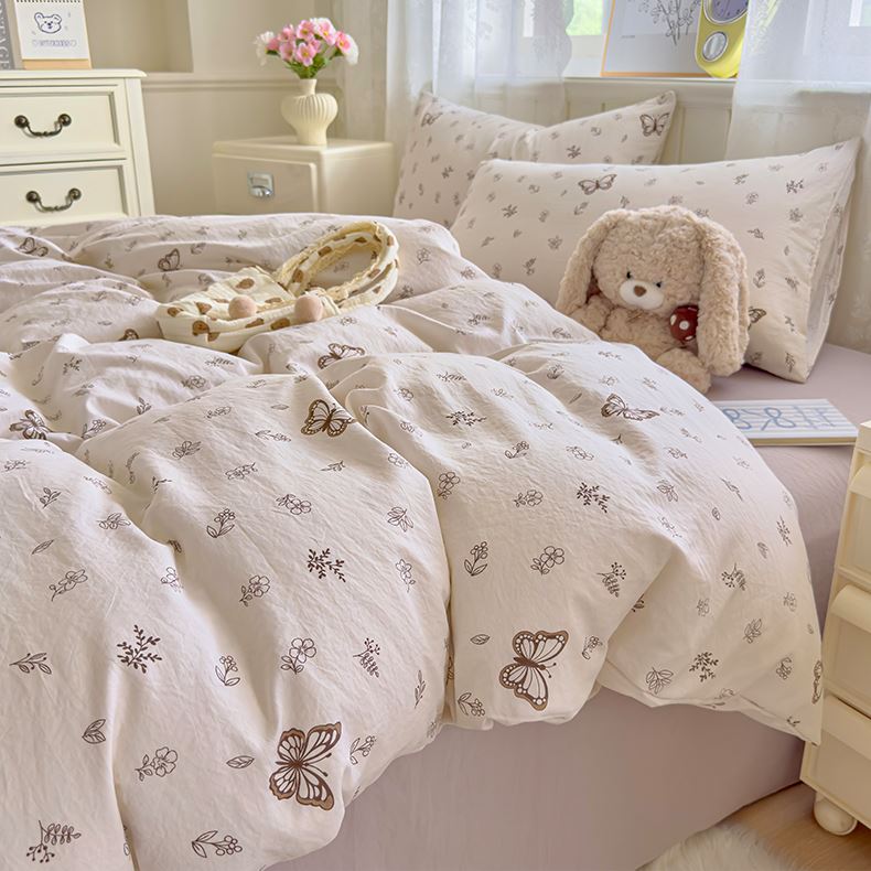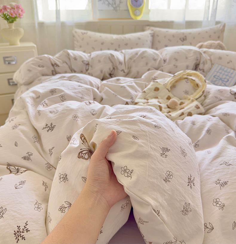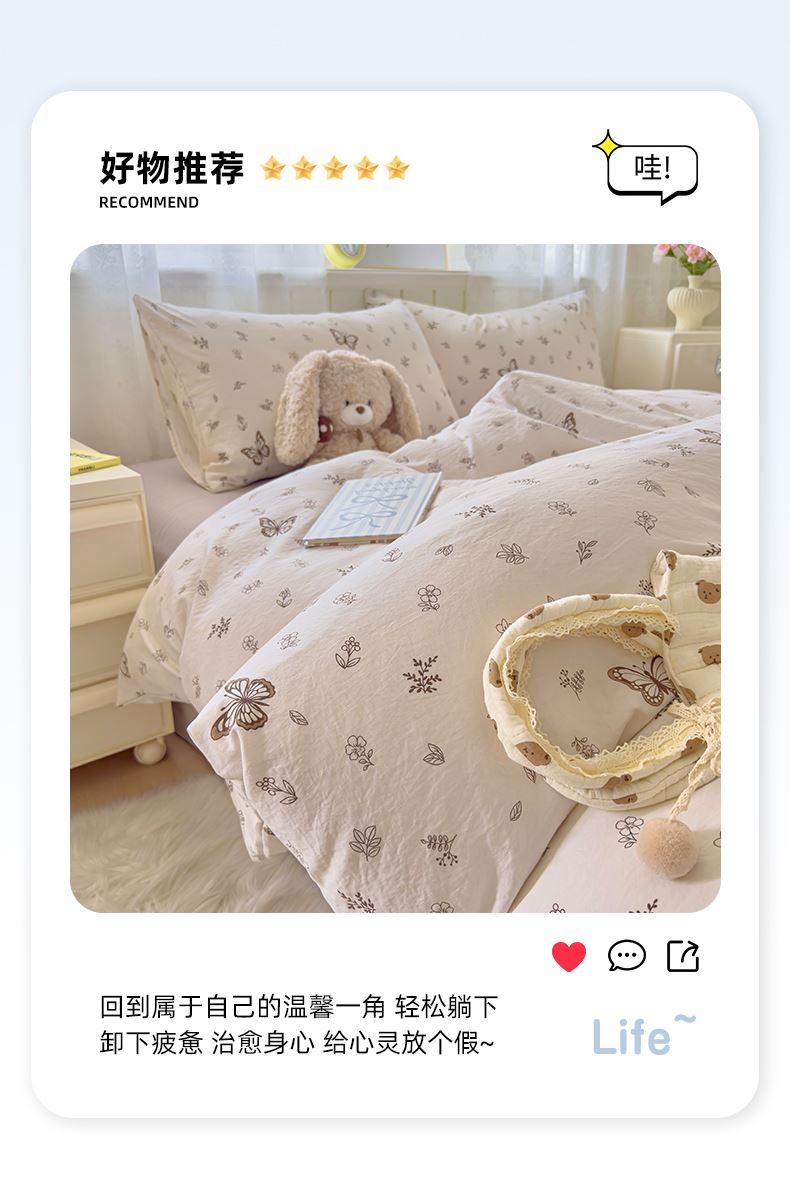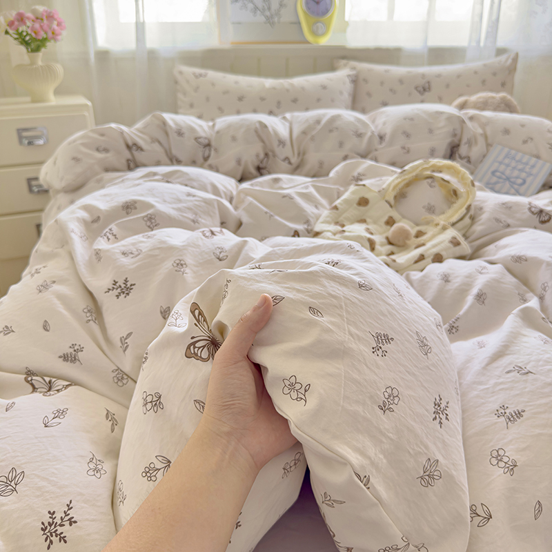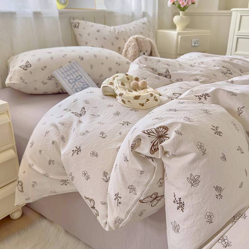 被套:200*230cm 床单:230*245cm 枕套:48*74cm*2 面料材质:双层纱 产品包装:精美礼盒 产品特点: 1.云感双层纱,肌肤感知自然柔软,亲肤细腻睡着舒适,不易起球。 2.时尚印花设计搭配,甜到你的心里,美观大方,起居有你相伴。