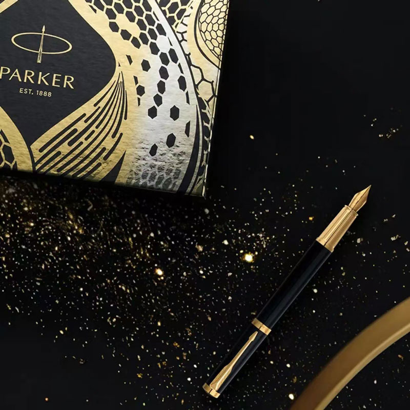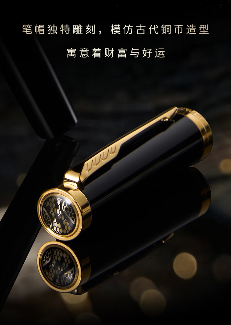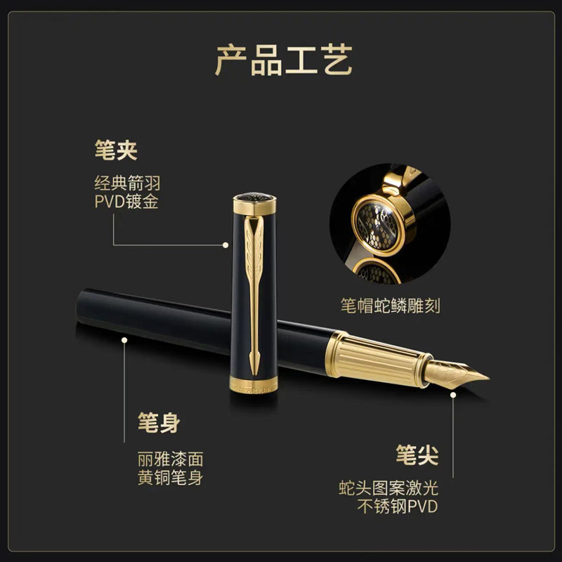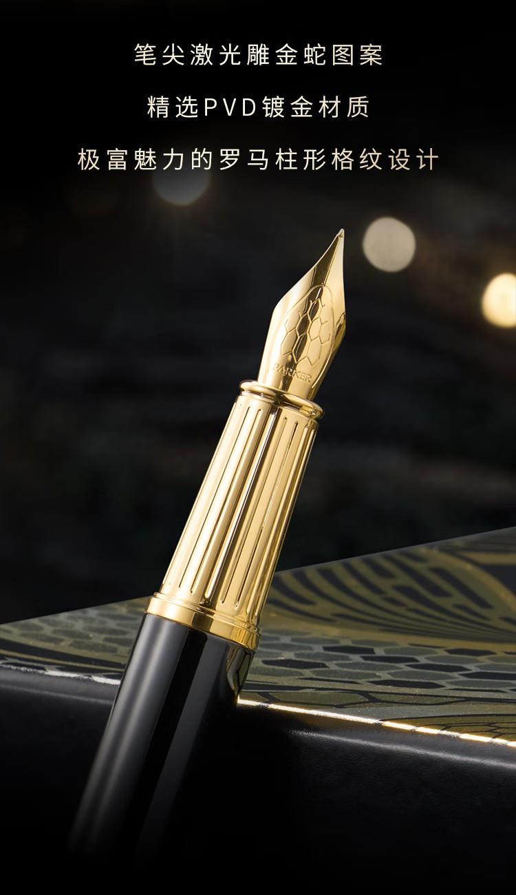 笔帽顶部:蛇鳞雕刻,镭射激光刻印,寓意金蛇衔财 笔环:不锈钢PVD金笔夹及笔环 笔握:黄铜笔握,PVD金 笔尖:不锈钢PVD金,激光雕刻,蛇头图案 派克精英系列通过融入蛇形元素,绘制蛇年特色图案,彰显尊崇非凡荣耀,赋予瑞蛇迎福,金蛇衔财,铸就非凡人生等美好寓意。