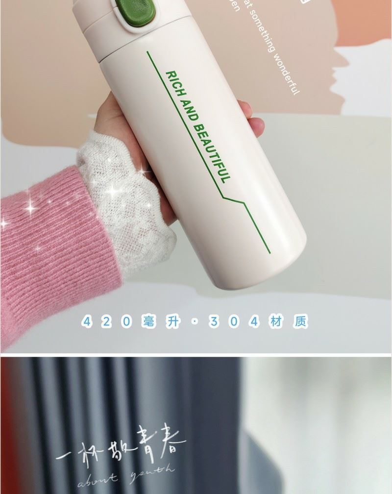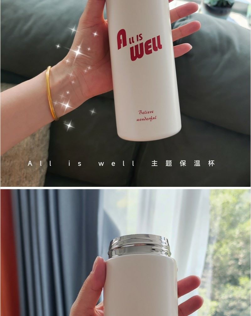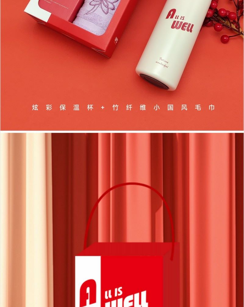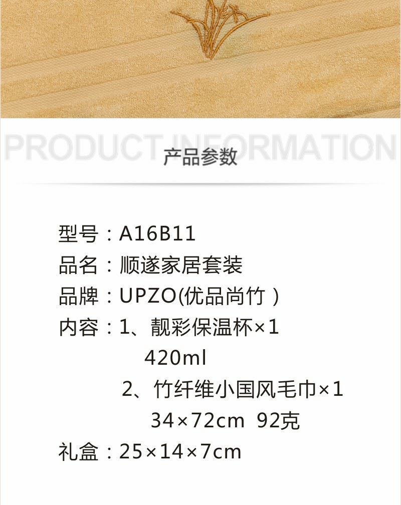 型号: A16B11 产品内容 1、 竹纤维小国风毛巾×1 起圈部竹纤维 基部棉 92克 34*72CM 2、 炫彩保温杯×1 304内胆 PP杯盖 420毫升容量 外盒: 25×14×7cm 420毫升高颜值保温杯 304内胆 精美设计文案 毛巾精选竹纤维材质 结合国风刺绣 优质好礼
