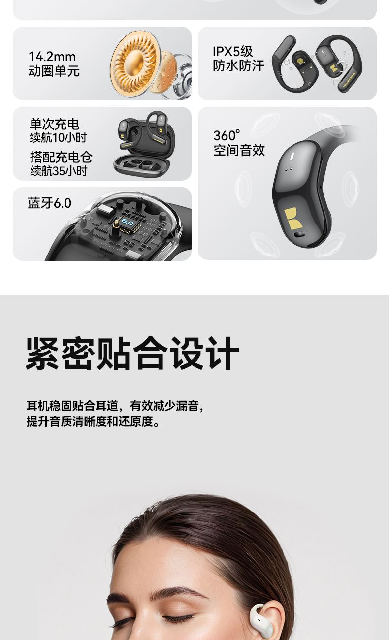 技术参数: 芯片方案:JL7016G8 蓝牙版本:5.4 喇叭规格: Ф14.2mm 音频解码:AAC、SBC 播放时长:约10小时(50%音量) 通话时长:约8小时(50%音量) 电池规格:耳机65mAh,充电仓400mAh 充电时长:耳机约1小时,充电仓约2小时 充电次数:仓给耳机充电约2次 充电接口:Type-C(5V/1A) 防水等级:耳机IPX5,充电仓不防水