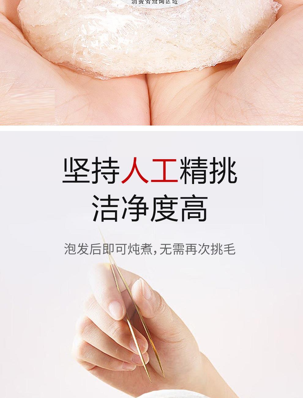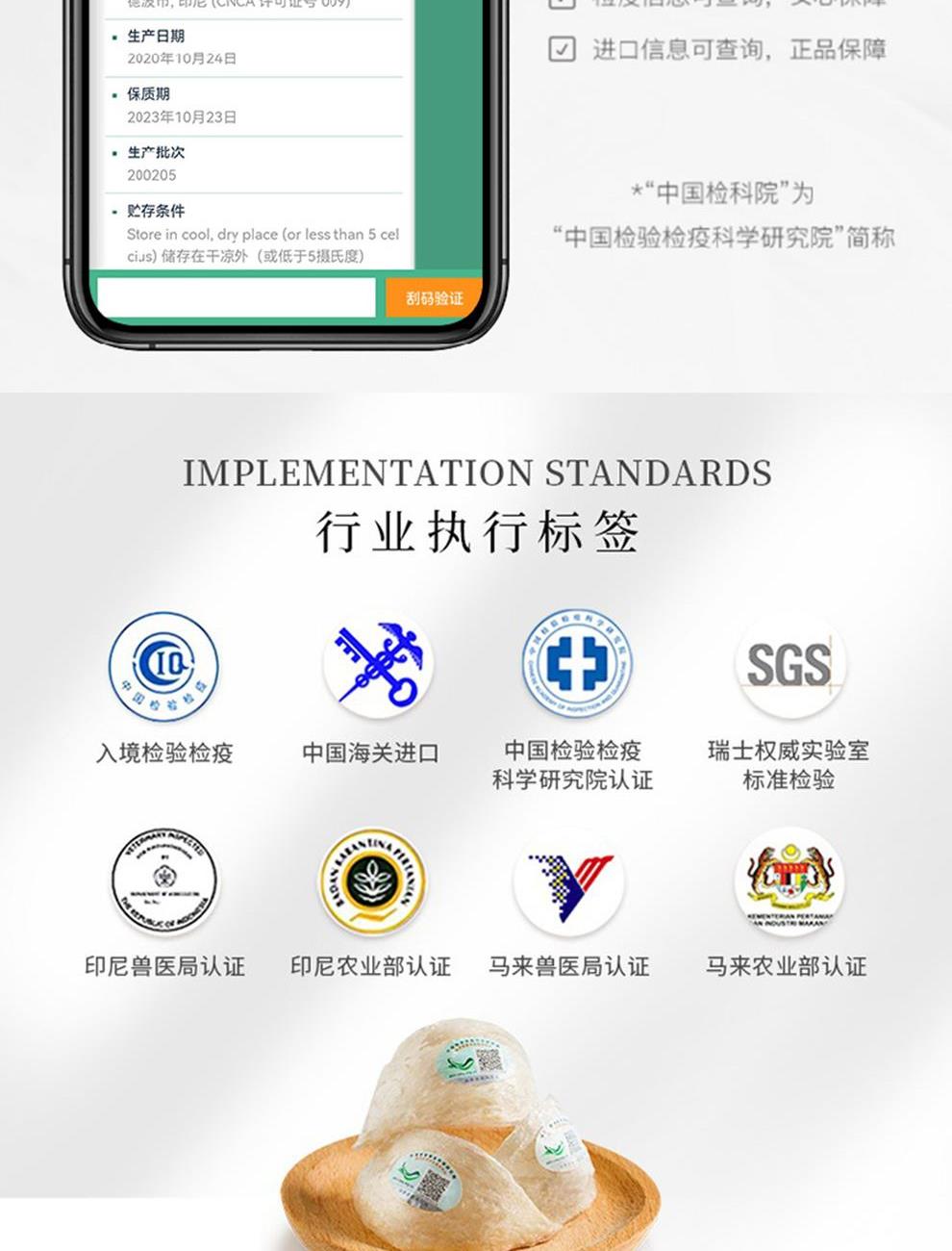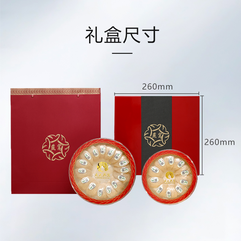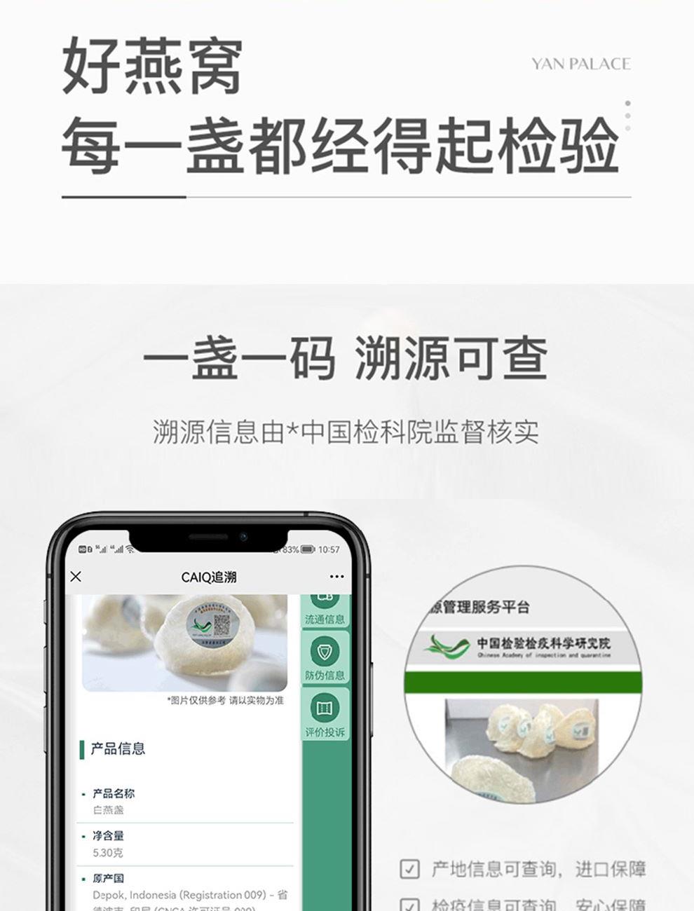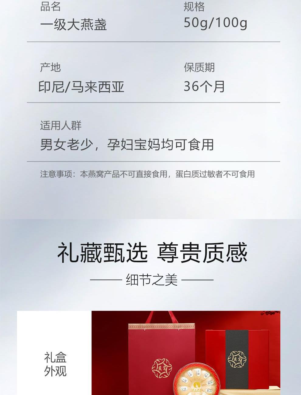规格:溯源大盏100克 卖点: 1、一盏一码,溯源可查,品质有保障。 2、不刷胶,不补碎,泡发率高达8-10倍。 3、99.9%洁净度,足干足称,不为一滴水分买单。 4、节省时间、免泡发燕盏省去了泡发的时间,可以开始炖煮。 5、免泡发燕盏的加工过程更加标准化,品质更加稳定。
