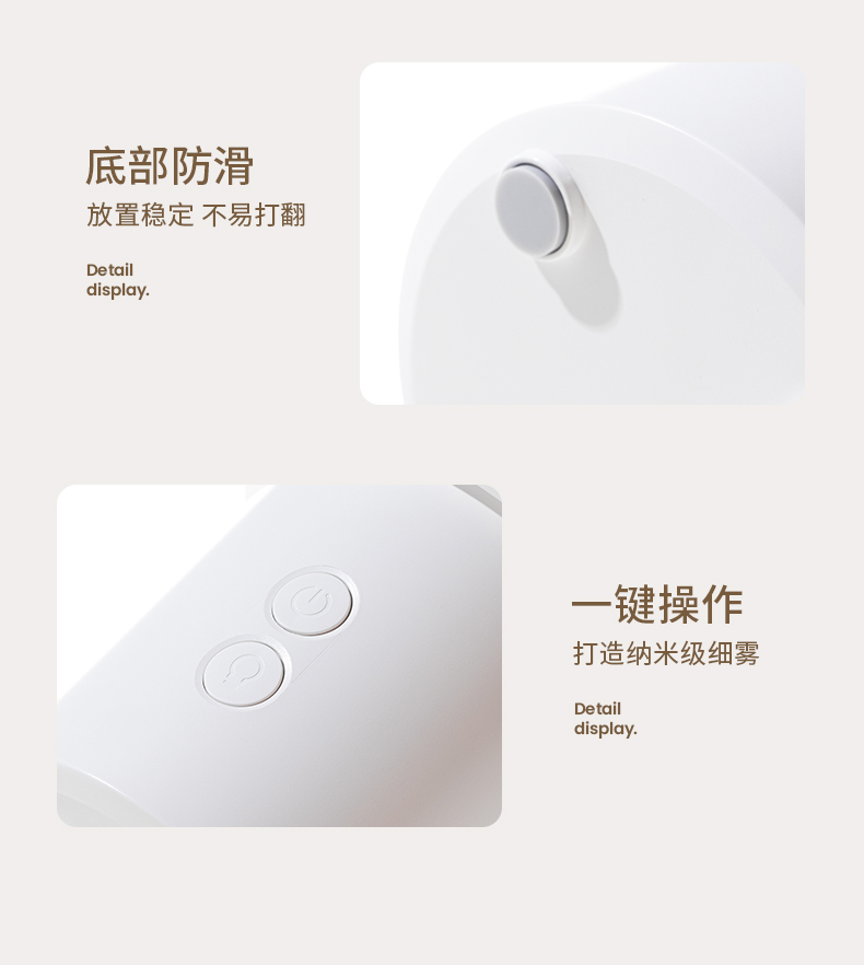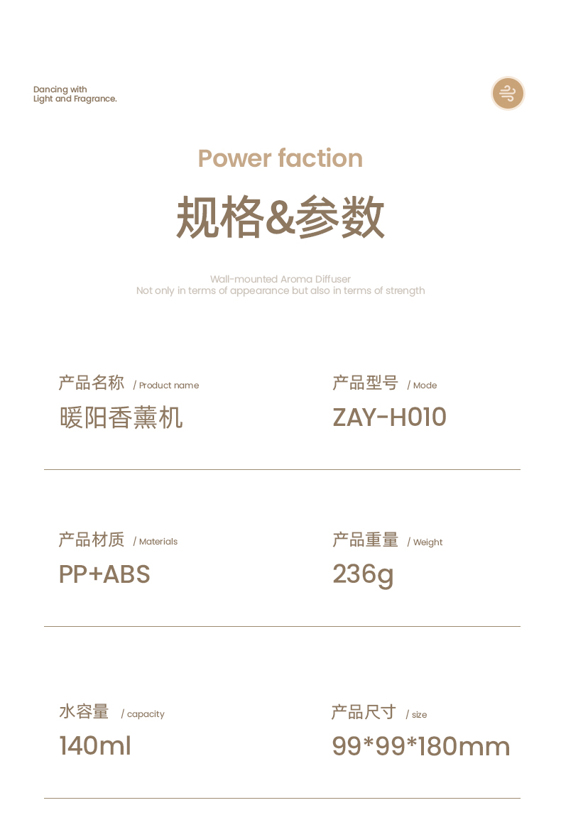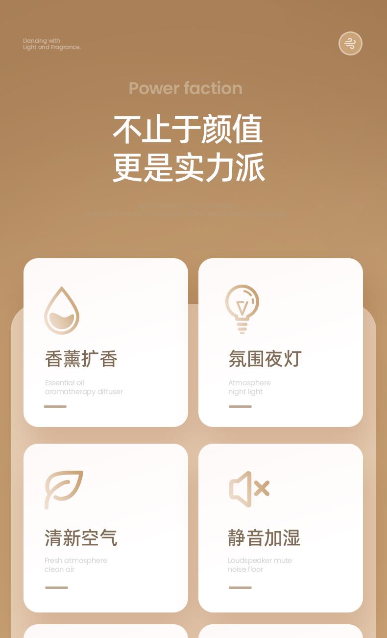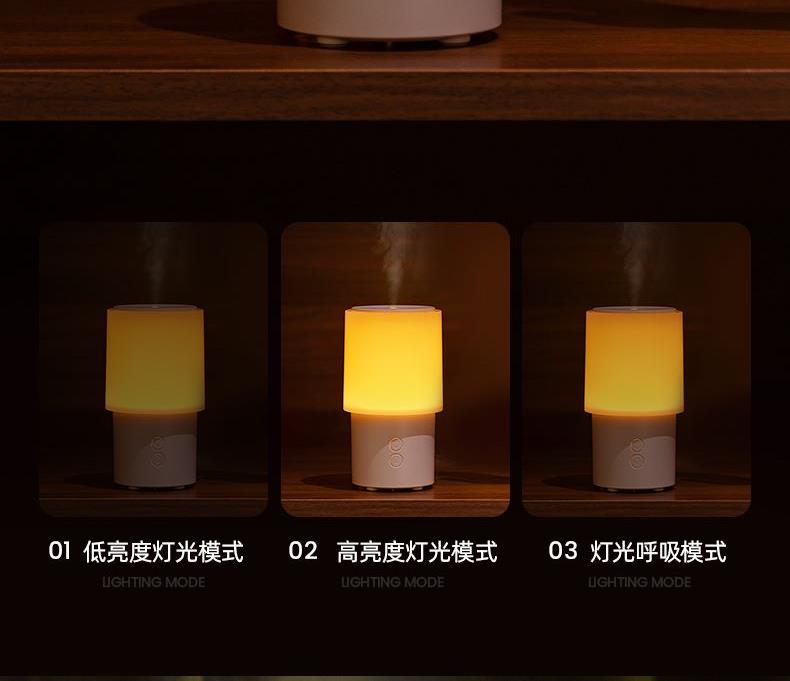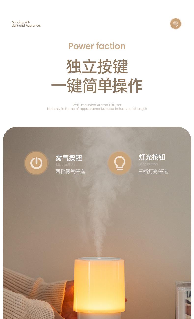 【颜色】白色、黑色 【材质】ABS+PP+PC 【重量】312g 【水箱容量】130ML 【喷雾量】15mL/h 【产品尺寸】96*196*180mm 【包装尺寸】98*98*183mm 【输入电流】5V-2A 采用差声波雾化器,通过震频将液态水分子打散细致冷雾保留下精油芬芳成分 即是香薰机,也是氛围灯,3重灯效模式,营造浪漫氛围 2档喷雾,高低档随意切换,香味持久不疲劳,低雾档维持湿度及香味,高雾档快速加湿及扩香 桌面不留积水,底部防滑,多场景使用