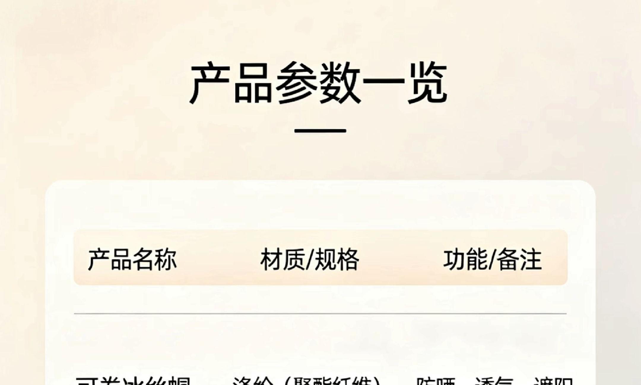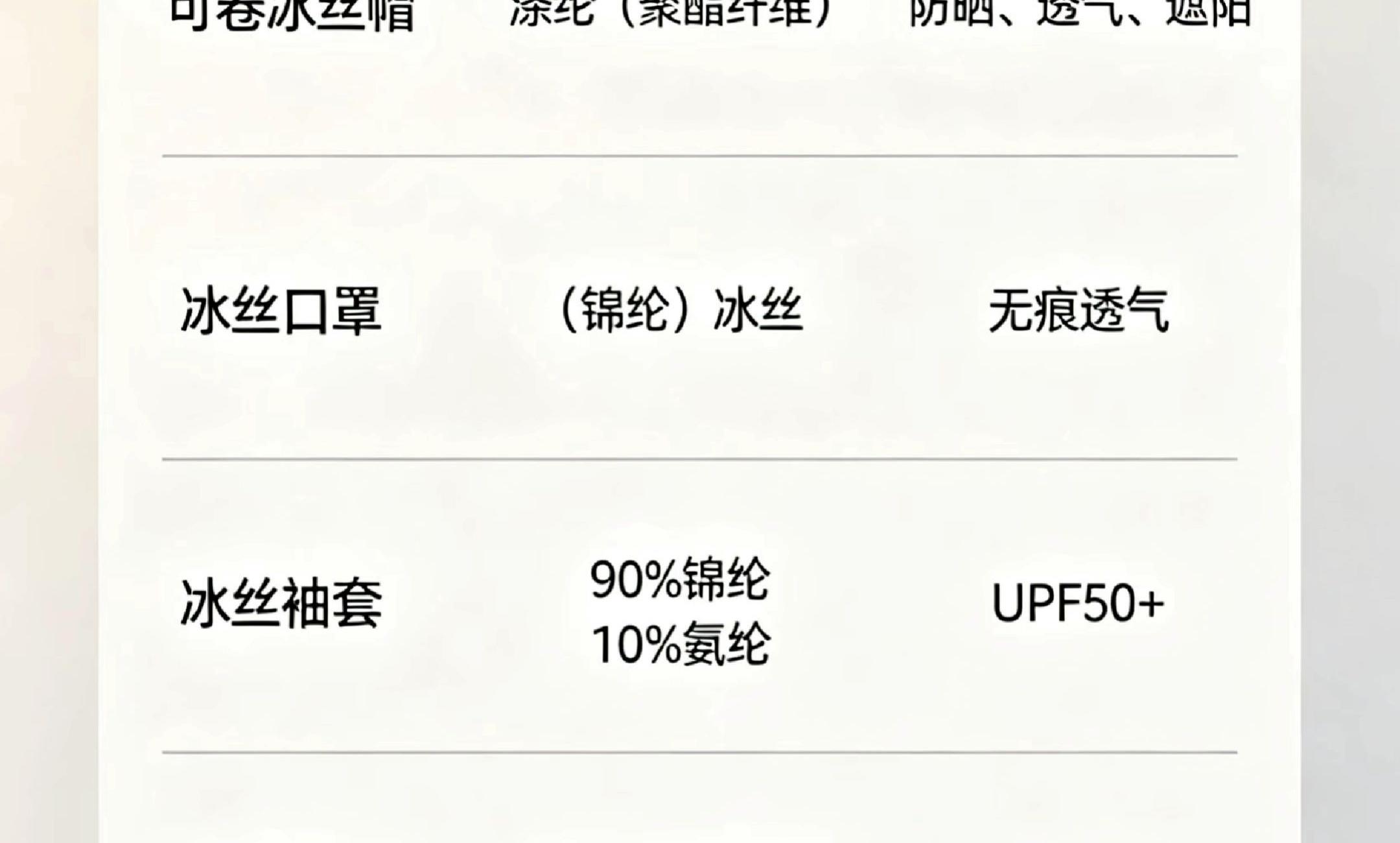配置:可卷双面冰丝帽*1 冰丝口罩*1 冰丝袖套*1 塑料铃兰咖啡杯*1 主要材质和功能: 可卷冰丝帽:涤纶(聚酯纤维),防晒,透气,遮阳 冰丝口罩:(锦纶)冰丝 冰丝袖套:UPF50+,90%锦纶10%氨纶 咖啡铃兰杯:550ml,食品级PP/PC/硅胶
