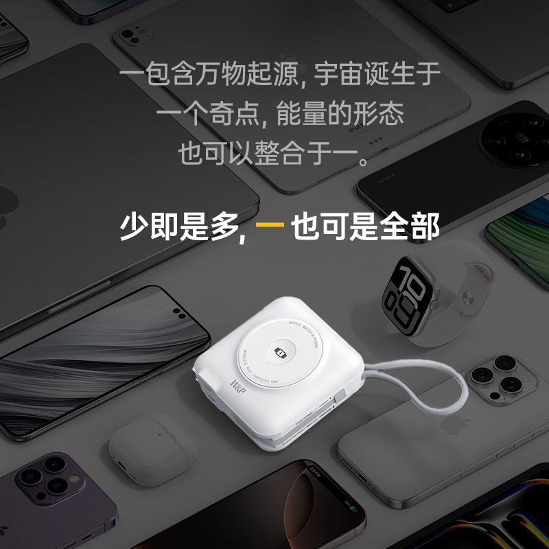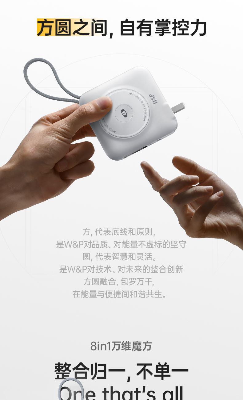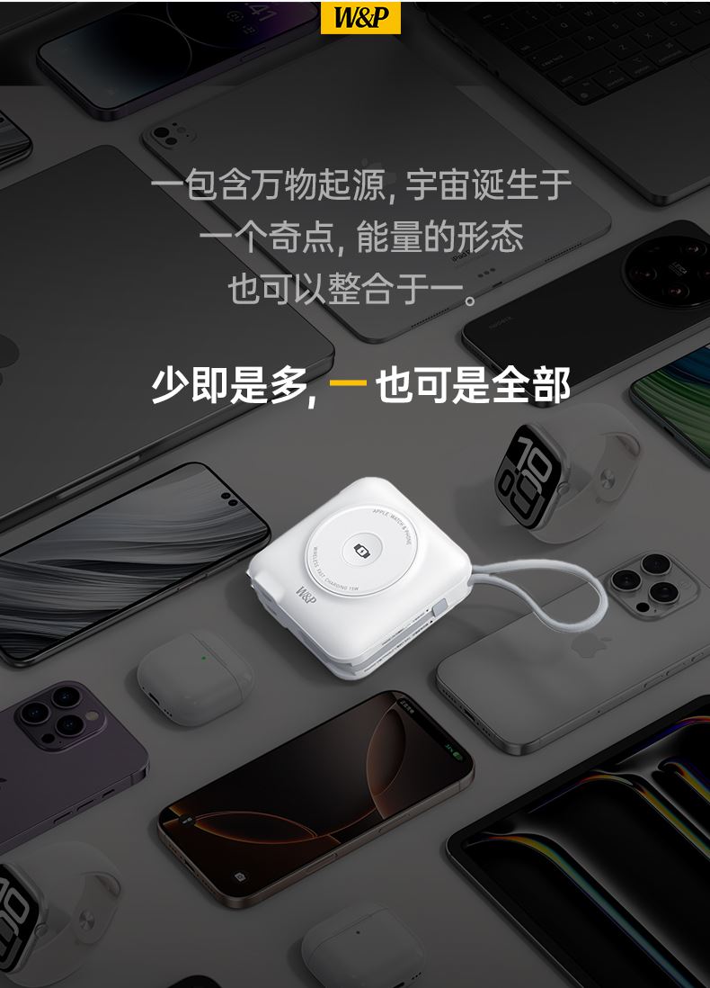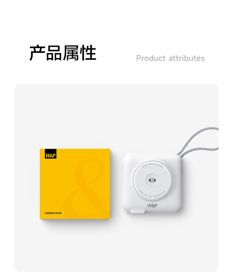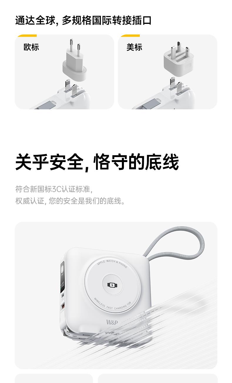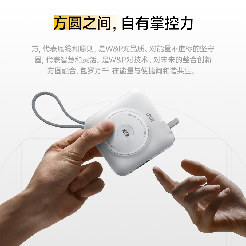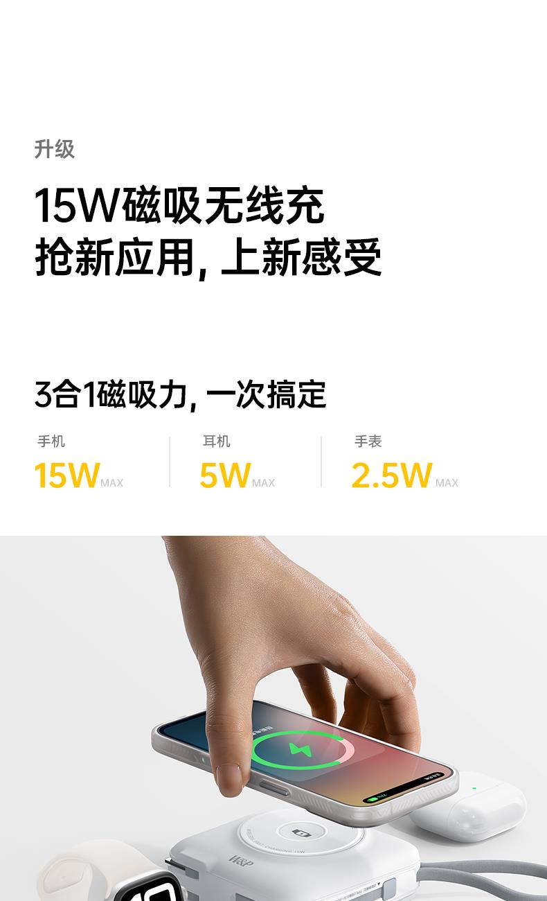 产品型号:WPD45W 产品尺寸:88*88*38.5mm 产品重量:约332g W&P磁吸充电宝,科技赋能移动生活; 45W快充,自带苹果线及TC线; 创新磁吸矩阵,兼容苹果安卓,三设备同时充; LED数字屏实时显示电量; 隐藏式双线+可折叠插头,满足多样场景; N52钕磁铁吸附力提升60%,稳固不断连; 15000mAh电芯,满足全天差旅需求。